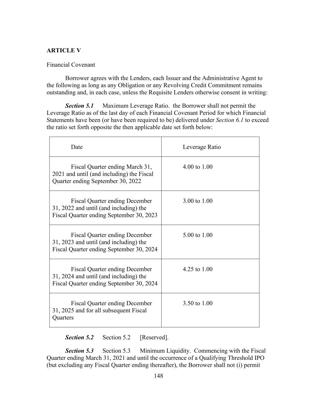 148 ARTICLE V Financial Covenant Borrower agrees with the Lenders, each Issuer and the Administrative Agent to the following as long as any Obligation or any Revolving Credit Commitment remains outstanding and, in each case, unless the Requisite Lenders otherwise consent in writing: Section 5.1 Maximum Leverage Ratio. the Borrower shall not permit the Leverage Ratio as of the last day of each Financial Covenant Period for which Financial Statements have been (or have been required to be) delivered under Section 6.1 to exceed the ratio set forth opposite the then applicable date set forth below: Date Leverage Ratio Fiscal Quarter ending March 31, 2021 and until (and including) the Fiscal Quarter ending September 30, 2022 4.00 to 1.00 Fiscal Quarter ending December 31, 2022 and until (and including) the Fiscal Quarter ending September 30, 2023 3.00 to 1.00 Fiscal Quarter ending December 31, 2023 and until (and including) the Fiscal Quarter ending September 30, 2024 5.00 to 1.00 Fiscal Quarter ending December 31, 2024 and until (and including) the Fiscal Quarter ending September 30, 2024 4.25 to 1.00 Fiscal Quarter ending December 31, 2025 and for all subsequent Fiscal Quarters 3.50 to 1.00 Section 5.2 Section 5.2 [Reserved]. Section 5.3 Section 5.3 Minimum Liquidity. Commencing with the Fiscal Quarter ending March 31, 2021 and until the occurrence of a Qualifying Threshold IPO (but excluding any Fiscal Quarter ending thereafter), the Borrower shall not (i) permit