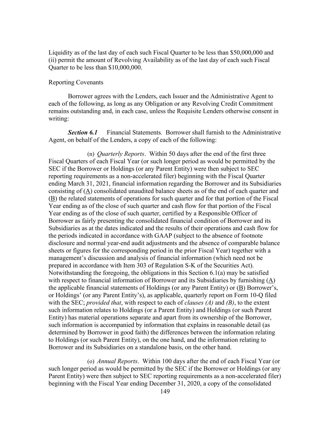 149 Liquidity as of the last day of each such Fiscal Quarter to be less than $50,000,000 and (ii) permit the amount of Revolving Availability as of the last day of each such Fiscal Quarter to be less than $10,000,000. Reporting Covenants Borrower agrees with the Lenders, each Issuer and the Administrative Agent to each of the following, as long as any Obligation or any Revolving Credit Commitment remains outstanding and, in each case, unless the Requisite Lenders otherwise consent in writing: Section 6.1 Financial Statements. Borrower shall furnish to the Administrative Agent, on behalf of the Lenders, a copy of each of the following: (n) Quarterly Reports. Within 50 days after the end of the first three Fiscal Quarters of each Fiscal Year (or such longer period as would be permitted by the SEC if the Borrower or Holdings (or any Parent Entity) were then subject to SEC reporting requirements as a non-accelerated filer) beginning with the Fiscal Quarter ending March 31, 2021, financial information regarding the Borrower and its Subsidiaries consisting of (A) consolidated unaudited balance sheets as of the end of each quarter and (B) the related statements of operations for such quarter and for that portion of the Fiscal Year ending as of the close of such quarter and cash flow for that portion of the Fiscal Year ending as of the close of such quarter, certified by a Responsible Officer of Borrower as fairly presenting the consolidated financial condition of Borrower and its Subsidiaries as at the dates indicated and the results of their operations and cash flow for the periods indicated in accordance with GAAP (subject to the absence of footnote disclosure and normal year-end audit adjustments and the absence of comparable balance sheets or figures for the corresponding period in the prior Fiscal Year) together with a management’s discussion and analysis of financial information (which need not be prepared in accordance with Item 303 of Regulation S-K of the Securities Act). Notwithstanding the foregoing, the obligations in this Section 6.1(a) may be satisfied with respect to financial information of Borrower and its Subsidiaries by furnishing (A) the applicable financial statements of Holdings (or any Parent Entity) or (B) Borrower’s, or Holdings’ (or any Parent Entity’s), as applicable, quarterly report on Form 10-Q filed with the SEC; provided that, with respect to each of clauses (A) and (B), to the extent such information relates to Holdings (or a Parent Entity) and Holdings (or such Parent Entity) has material operations separate and apart from its ownership of the Borrower, such information is accompanied by information that explains in reasonable detail (as determined by Borrower in good faith) the differences between the information relating to Holdings (or such Parent Entity), on the one hand, and the information relating to Borrower and its Subsidiaries on a standalone basis, on the other hand. (o) Annual Reports. Within 100 days after the end of each Fiscal Year (or such longer period as would be permitted by the SEC if the Borrower or Holdings (or any Parent Entity) were then subject to SEC reporting requirements as a non-accelerated filer) beginning with the Fiscal Year ending December 31, 2020, a copy of the consolidated