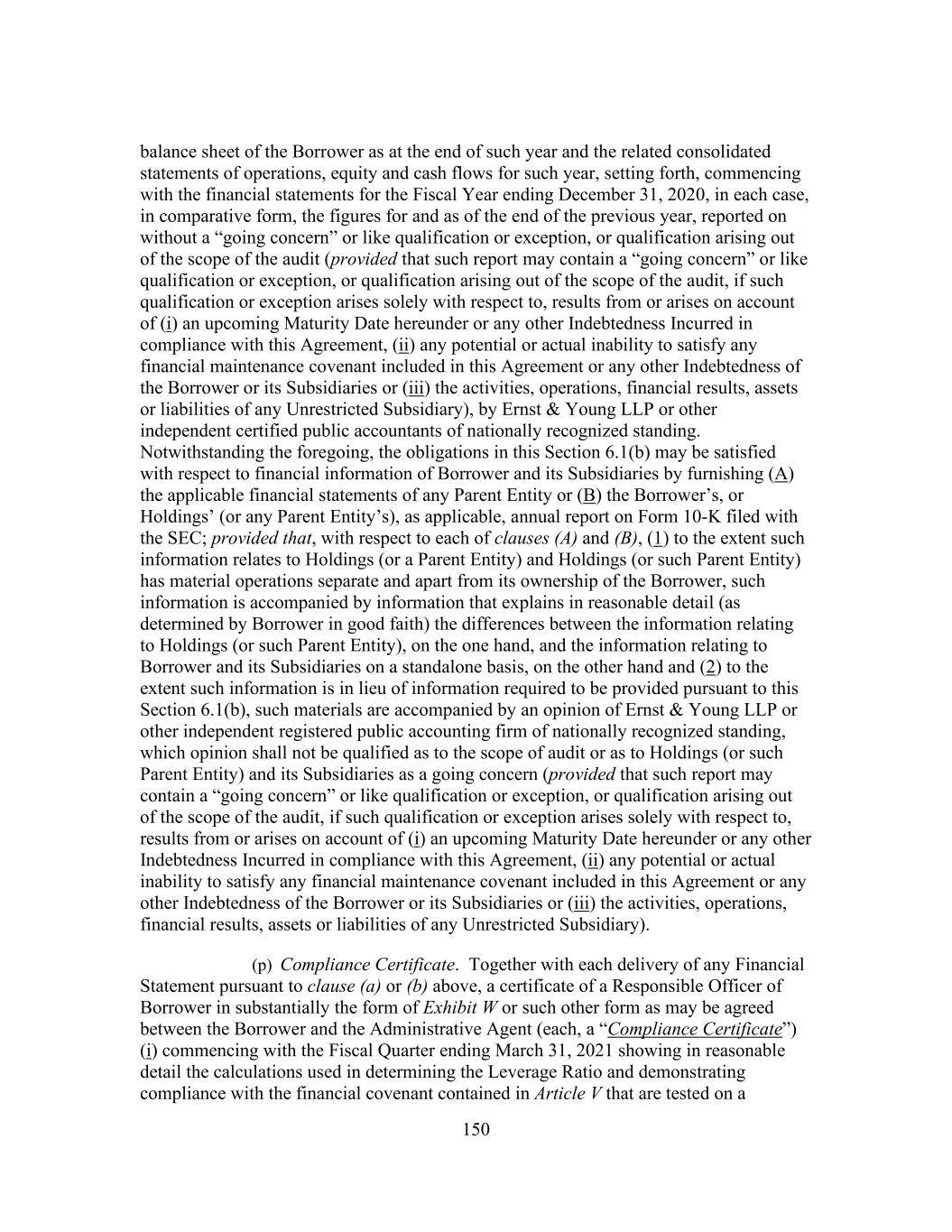 150 balance sheet of the Borrower as at the end of such year and the related consolidated statements of operations, equity and cash flows for such year, setting forth, commencing with the financial statements for the Fiscal Year ending December 31, 2020, in each case, in comparative form, the figures for and as of the end of the previous year, reported on without a “going concern” or like qualification or exception, or qualification arising out of the scope of the audit (provided that such report may contain a “going concern” or like qualification or exception, or qualification arising out of the scope of the audit, if such qualification or exception arises solely with respect to, results from or arises on account of (i) an upcoming Maturity Date hereunder or any other Indebtedness Incurred in compliance with this Agreement, (ii) any potential or actual inability to satisfy any financial maintenance covenant included in this Agreement or any other Indebtedness of the Borrower or its Subsidiaries or (iii) the activities, operations, financial results, assets or liabilities of any Unrestricted Subsidiary), by Ernst & Young LLP or other independent certified public accountants of nationally recognized standing. Notwithstanding the foregoing, the obligations in this Section 6.1(b) may be satisfied with respect to financial information of Borrower and its Subsidiaries by furnishing (A) the applicable financial statements of any Parent Entity or (B) the Borrower’s, or Holdings’ (or any Parent Entity’s), as applicable, annual report on Form 10-K filed with the SEC; provided that, with respect to each of clauses (A) and (B), (1) to the extent such information relates to Holdings (or a Parent Entity) and Holdings (or such Parent Entity) has material operations separate and apart from its ownership of the Borrower, such information is accompanied by information that explains in reasonable detail (as determined by Borrower in good faith) the differences between the information relating to Holdings (or such Parent Entity), on the one hand, and the information relating to Borrower and its Subsidiaries on a standalone basis, on the other hand and (2) to the extent such information is in lieu of information required to be provided pursuant to this Section 6.1(b), such materials are accompanied by an opinion of Ernst & Young LLP or other independent registered public accounting firm of nationally recognized standing, which opinion shall not be qualified as to the scope of audit or as to Holdings (or such Parent Entity) and its Subsidiaries as a going concern (provided that such report may contain a “going concern” or like qualification or exception, or qualification arising out of the scope of the audit, if such qualification or exception arises solely with respect to, results from or arises on account of (i) an upcoming Maturity Date hereunder or any other Indebtedness Incurred in compliance with this Agreement, (ii) any potential or actual inability to satisfy any financial maintenance covenant included in this Agreement or any other Indebtedness of the Borrower or its Subsidiaries or (iii) the activities, operations, financial results, assets or liabilities of any Unrestricted Subsidiary). (p) Compliance Certificate. Together with each delivery of any Financial Statement pursuant to clause (a) or (b) above, a certificate of a Responsible Officer of Borrower in substantially the form of Exhibit W or such other form as may be agreed between the Borrower and the Administrative Agent (each, a “Compliance Certificate”) (i) commencing with the Fiscal Quarter ending March 31, 2021 showing in reasonable detail the calculations used in determining the Leverage Ratio and demonstrating compliance with the financial covenant contained in Article V that are tested on a