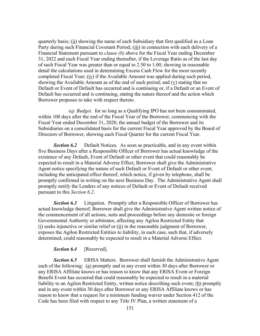 151 quarterly basis; (ii) showing the name of each Subsidiary that first qualified as a Loan Party during such Financial Covenant Period; (iii) in connection with each delivery of a Financial Statement pursuant to clause (b) above for the Fiscal Year ending December 31, 2022 and each Fiscal Year ending thereafter, if the Leverage Ratio as of the last day of such Fiscal Year was greater than or equal to 2.50 to 1.00, showing in reasonable detail the calculations used in determining Excess Cash Flow for the most recently completed Fiscal Year; (iv) if the Available Amount was applied during such period, showing the Available Amount as of the end of such period; and (v) stating that no Default or Event of Default has occurred and is continuing or, if a Default or an Event of Default has occurred and is continuing, stating the nature thereof and the action which Borrower proposes to take with respect thereto. (q) Budget. for so long as a Qualifying IPO has not been consummated, within 100 days after the end of the Fiscal Year of the Borrower, commencing with the Fiscal Year ended December 31, 2020, the annual budget of the Borrower and its Subsidiaries on a consolidated basis for the current Fiscal Year approved by the Board of Directors of Borrower, showing each Fiscal Quarter for the current Fiscal Year. Section 6.2 Default Notices. As soon as practicable, and in any event within five Business Days after a Responsible Officer of Borrower has actual knowledge of the existence of any Default, Event of Default or other event that could reasonably be expected to result in a Material Adverse Effect, Borrower shall give the Administrative Agent notice specifying the nature of such Default or Event of Default or other event, including the anticipated effect thereof, which notice, if given by telephone, shall be promptly confirmed in writing on the next Business Day. The Administrative Agent shall promptly notify the Lenders of any notices of Default or Event of Default received pursuant to this Section 6.2. Section 6.3 Litigation. Promptly after a Responsible Officer of Borrower has actual knowledge thereof, Borrower shall give the Administrative Agent written notice of the commencement of all actions, suits and proceedings before any domestic or foreign Governmental Authority or arbitrator, affecting any Agilon Restricted Entity that (i) seeks injunctive or similar relief or (ii) in the reasonable judgment of Borrower, exposes the Agilon Restricted Entities to liability, in each case, such that, if adversely determined, could reasonably be expected to result in a Material Adverse Effect. Section 6.4 [Reserved]. Section 6.5 ERISA Matters. Borrower shall furnish the Administrative Agent each of the following: (a) promptly and in any event within 30 days after Borrower or any ERISA Affiliate knows or has reason to know that any ERISA Event or Foreign Benefit Event has occurred that could reasonably be expected to result in a material liability to an Agilon Restricted Entity, written notice describing such event; (b) promptly and in any event within 30 days after Borrower or any ERISA Affiliate knows or has reason to know that a request for a minimum funding waiver under Section 412 of the Code has been filed with respect to any Title IV Plan, a written statement of a