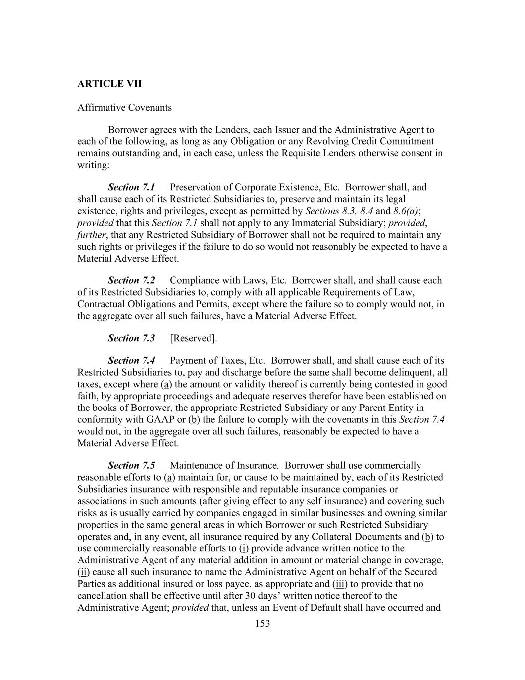 153 ARTICLE VII Affirmative Covenants Borrower agrees with the Lenders, each Issuer and the Administrative Agent to each of the following, as long as any Obligation or any Revolving Credit Commitment remains outstanding and, in each case, unless the Requisite Lenders otherwise consent in writing: Section 7.1 Preservation of Corporate Existence, Etc. Borrower shall, and shall cause each of its Restricted Subsidiaries to, preserve and maintain its legal existence, rights and privileges, except as permitted by Sections 8.3, 8.4 and 8.6(a); provided that this Section 7.1 shall not apply to any Immaterial Subsidiary; provided, further, that any Restricted Subsidiary of Borrower shall not be required to maintain any such rights or privileges if the failure to do so would not reasonably be expected to have a Material Adverse Effect. Section 7.2 Compliance with Laws, Etc. Borrower shall, and shall cause each of its Restricted Subsidiaries to, comply with all applicable Requirements of Law, Contractual Obligations and Permits, except where the failure so to comply would not, in the aggregate over all such failures, have a Material Adverse Effect. Section 7.3 [Reserved]. Section 7.4 Payment of Taxes, Etc. Borrower shall, and shall cause each of its Restricted Subsidiaries to, pay and discharge before the same shall become delinquent, all taxes, except where (a) the amount or validity thereof is currently being contested in good faith, by appropriate proceedings and adequate reserves therefor have been established on the books of Borrower, the appropriate Restricted Subsidiary or any Parent Entity in conformity with GAAP or (b) the failure to comply with the covenants in this Section 7.4 would not, in the aggregate over all such failures, reasonably be expected to have a Material Adverse Effect. Section 7.5 Maintenance of Insurance. Borrower shall use commercially reasonable efforts to (a) maintain for, or cause to be maintained by, each of its Restricted Subsidiaries insurance with responsible and reputable insurance companies or associations in such amounts (after giving effect to any self insurance) and covering such risks as is usually carried by companies engaged in similar businesses and owning similar properties in the same general areas in which Borrower or such Restricted Subsidiary operates and, in any event, all insurance required by any Collateral Documents and (b) to use commercially reasonable efforts to (i) provide advance written notice to the Administrative Agent of any material addition in amount or material change in coverage, (ii) cause all such insurance to name the Administrative Agent on behalf of the Secured Parties as additional insured or loss payee, as appropriate and (iii) to provide that no cancellation shall be effective until after 30 days’ written notice thereof to the Administrative Agent; provided that, unless an Event of Default shall have occurred and