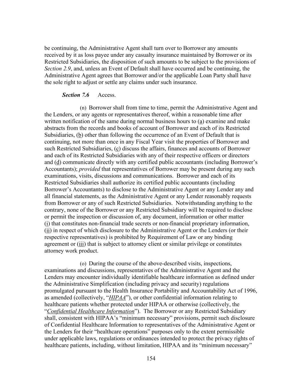 154 be continuing, the Administrative Agent shall turn over to Borrower any amounts received by it as loss payee under any casualty insurance maintained by Borrower or its Restricted Subsidiaries, the disposition of such amounts to be subject to the provisions of Section 2.9, and, unless an Event of Default shall have occurred and be continuing, the Administrative Agent agrees that Borrower and/or the applicable Loan Party shall have the sole right to adjust or settle any claims under such insurance. Section 7.6 Access. (n) Borrower shall from time to time, permit the Administrative Agent and the Lenders, or any agents or representatives thereof, within a reasonable time after written notification of the same during normal business hours to (a) examine and make abstracts from the records and books of account of Borrower and each of its Restricted Subsidiaries, (b) other than following the occurrence of an Event of Default that is continuing, not more than once in any Fiscal Year visit the properties of Borrower and such Restricted Subsidiaries, (c) discuss the affairs, finances and accounts of Borrower and each of its Restricted Subsidiaries with any of their respective officers or directors and (d) communicate directly with any certified public accountants (including Borrower’s Accountants); provided that representatives of Borrower may be present during any such examinations, visits, discussions and communications. Borrower and each of its Restricted Subsidiaries shall authorize its certified public accountants (including Borrower’s Accountants) to disclose to the Administrative Agent or any Lender any and all financial statements, as the Administrative Agent or any Lender reasonably requests from Borrower or any of such Restricted Subsidiaries. Notwithstanding anything to the contrary, none of the Borrower or any Restricted Subsidiary will be required to disclose or permit the inspection or discussion of, any document, information or other matter (i) that constitutes non-financial trade secrets or non-financial proprietary information, (ii) in respect of which disclosure to the Administrative Agent or the Lenders (or their respective representatives) is prohibited by Requirement of Law or any binding agreement or (iii) that is subject to attorney client or similar privilege or constitutes attorney work product. (o) During the course of the above-described visits, inspections, examinations and discussions, representatives of the Administrative Agent and the Lenders may encounter individually identifiable healthcare information as defined under the Administrative Simplification (including privacy and security) regulations promulgated pursuant to the Health Insurance Portability and Accountability Act of 1996, as amended (collectively, “HIPAA”), or other confidential information relating to healthcare patients whether protected under HIPAA or otherwise (collectively, the “Confidential Healthcare Information”). The Borrower or any Restricted Subsidiary shall, consistent with HIPAA’s “minimum necessary” provisions, permit such disclosure of Confidential Healthcare Information to representatives of the Administrative Agent or the Lenders for their “healthcare operations” purposes only to the extent permissible under applicable laws, regulations or ordinances intended to protect the privacy rights of healthcare patients, including, without limitation, HIPAA and its “minimum necessary”