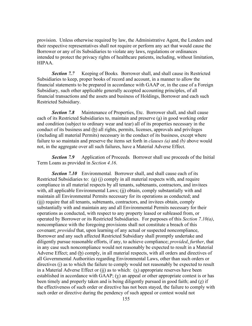 155 provision. Unless otherwise required by law, the Administrative Agent, the Lenders and their respective representatives shall not require or perform any act that would cause the Borrower or any of its Subsidiaries to violate any laws, regulations or ordinances intended to protect the privacy rights of healthcare patients, including, without limitation, HIPAA. Section 7.7 Keeping of Books. Borrower shall, and shall cause its Restricted Subsidiaries to keep, proper books of record and account, in a manner to allow the financial statements to be prepared in accordance with GAAP or, in the case of a Foreign Subsidiary, such other applicable generally accepted accounting principles, of all financial transactions and the assets and business of Holdings, Borrower and each such Restricted Subsidiary. Section 7.8 Maintenance of Properties, Etc. Borrower shall, and shall cause each of its Restricted Subsidiaries to, maintain and preserve (a) in good working order and condition (subject to ordinary wear and tear) all of its properties necessary in the conduct of its business and (b) all rights, permits, licenses, approvals and privileges (including all material Permits) necessary in the conduct of its business, except where failure to so maintain and preserve the items set forth in clauses (a) and (b) above would not, in the aggregate over all such failures, have a Material Adverse Effect. Section 7.9 Application of Proceeds. Borrower shall use proceeds of the Initial Term Loans as provided in Section 4.16. Section 7.10 Environmental. Borrower shall, and shall cause each of its Restricted Subsidiaries to: (a) (i) comply in all material respects with, and require compliance in all material respects by all tenants, subtenants, contractors, and invitees with, all applicable Environmental Laws; (ii) obtain, comply substantially with and maintain all Environmental Permits necessary for its operations as conducted; and (iii) require that all tenants, subtenants, contractors, and invitees obtain, comply substantially with and maintain any and all Environmental Permits necessary for their operations as conducted, with respect to any property leased or subleased from, or operated by Borrower or its Restricted Subsidiaries. For purposes of this Section 7.10(a), noncompliance with the foregoing provisions shall not constitute a breach of this covenant; provided that, upon learning of any actual or suspected noncompliance, Borrower and any such affected Restricted Subsidiary shall promptly undertake and diligently pursue reasonable efforts, if any, to achieve compliance; provided, further, that in any case such noncompliance would not reasonably be expected to result in a Material Adverse Effect; and (b) comply, in all material respects, with all orders and directives of all Governmental Authorities regarding Environmental Laws, other than such orders or directives (i) as to which the failure to comply would not reasonably be expected to result in a Material Adverse Effect or (ii) as to which: (x) appropriate reserves have been established in accordance with GAAP; (y) an appeal or other appropriate contest is or has been timely and properly taken and is being diligently pursued in good faith; and (z) if the effectiveness of such order or directive has not been stayed, the failure to comply with such order or directive during the pendency of such appeal or contest would not