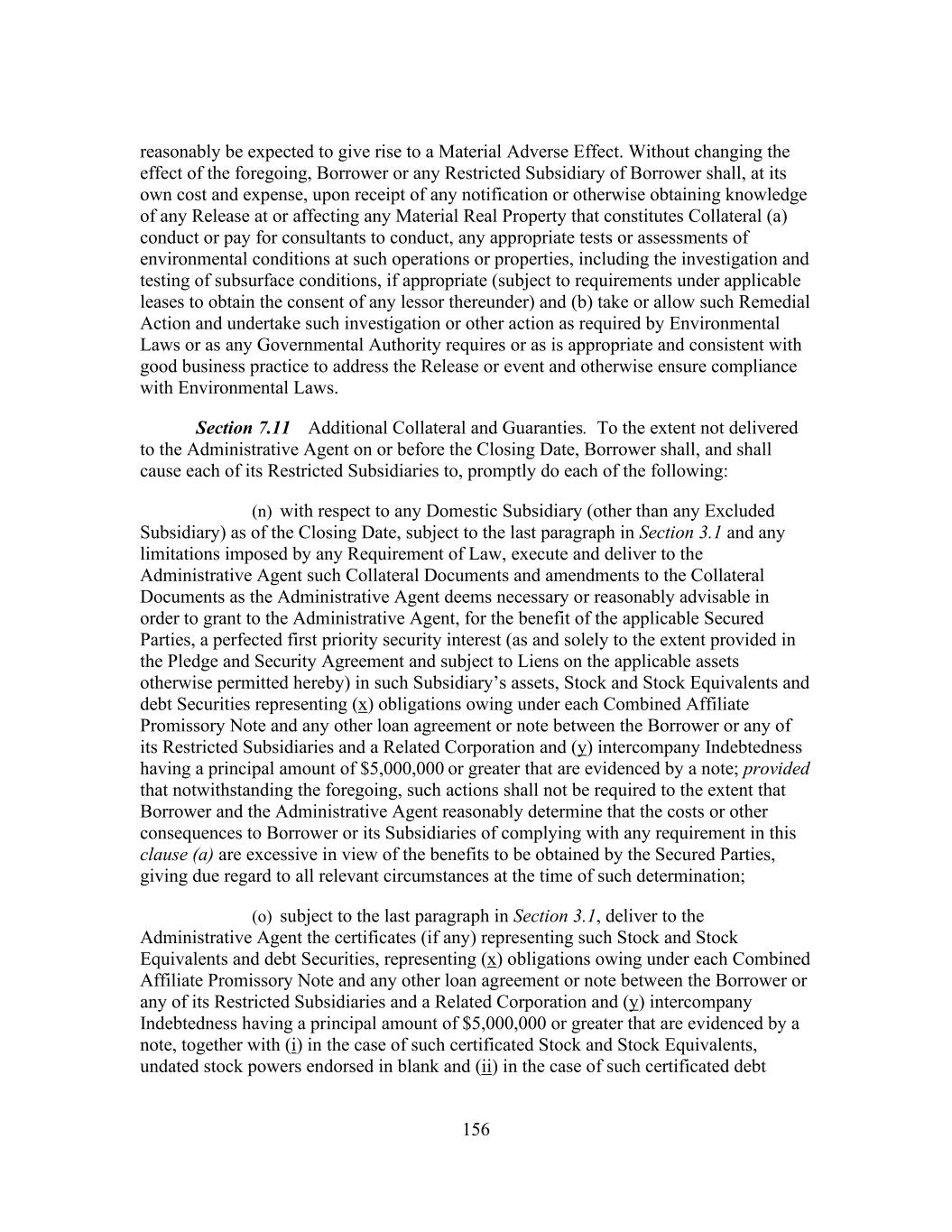 156 reasonably be expected to give rise to a Material Adverse Effect. Without changing the effect of the foregoing, Borrower or any Restricted Subsidiary of Borrower shall, at its own cost and expense, upon receipt of any notification or otherwise obtaining knowledge of any Release at or affecting any Material Real Property that constitutes Collateral (a) conduct or pay for consultants to conduct, any appropriate tests or assessments of environmental conditions at such operations or properties, including the investigation and testing of subsurface conditions, if appropriate (subject to requirements under applicable leases to obtain the consent of any lessor thereunder) and (b) take or allow such Remedial Action and undertake such investigation or other action as required by Environmental Laws or as any Governmental Authority requires or as is appropriate and consistent with good business practice to address the Release or event and otherwise ensure compliance with Environmental Laws. Section 7.11 Additional Collateral and Guaranties. To the extent not delivered to the Administrative Agent on or before the Closing Date, Borrower shall, and shall cause each of its Restricted Subsidiaries to, promptly do each of the following: (n) with respect to any Domestic Subsidiary (other than any Excluded Subsidiary) as of the Closing Date, subject to the last paragraph in Section 3.1 and any limitations imposed by any Requirement of Law, execute and deliver to the Administrative Agent such Collateral Documents and amendments to the Collateral Documents as the Administrative Agent deems necessary or reasonably advisable in order to grant to the Administrative Agent, for the benefit of the applicable Secured Parties, a perfected first priority security interest (as and solely to the extent provided in the Pledge and Security Agreement and subject to Liens on the applicable assets otherwise permitted hereby) in such Subsidiary’s assets, Stock and Stock Equivalents and debt Securities representing (x) obligations owing under each Combined Affiliate Promissory Note and any other loan agreement or note between the Borrower or any of its Restricted Subsidiaries and a Related Corporation and (y) intercompany Indebtedness having a principal amount of $5,000,000 or greater that are evidenced by a note; provided that notwithstanding the foregoing, such actions shall not be required to the extent that Borrower and the Administrative Agent reasonably determine that the costs or other consequences to Borrower or its Subsidiaries of complying with any requirement in this clause (a) are excessive in view of the benefits to be obtained by the Secured Parties, giving due regard to all relevant circumstances at the time of such determination; (o) subject to the last paragraph in Section 3.1, deliver to the Administrative Agent the certificates (if any) representing such Stock and Stock Equivalents and debt Securities, representing (x) obligations owing under each Combined Affiliate Promissory Note and any other loan agreement or note between the Borrower or any of its Restricted Subsidiaries and a Related Corporation and (y) intercompany Indebtedness having a principal amount of $5,000,000 or greater that are evidenced by a note, together with (i) in the case of such certificated Stock and Stock Equivalents, undated stock powers endorsed in blank and (ii) in the case of such certificated debt