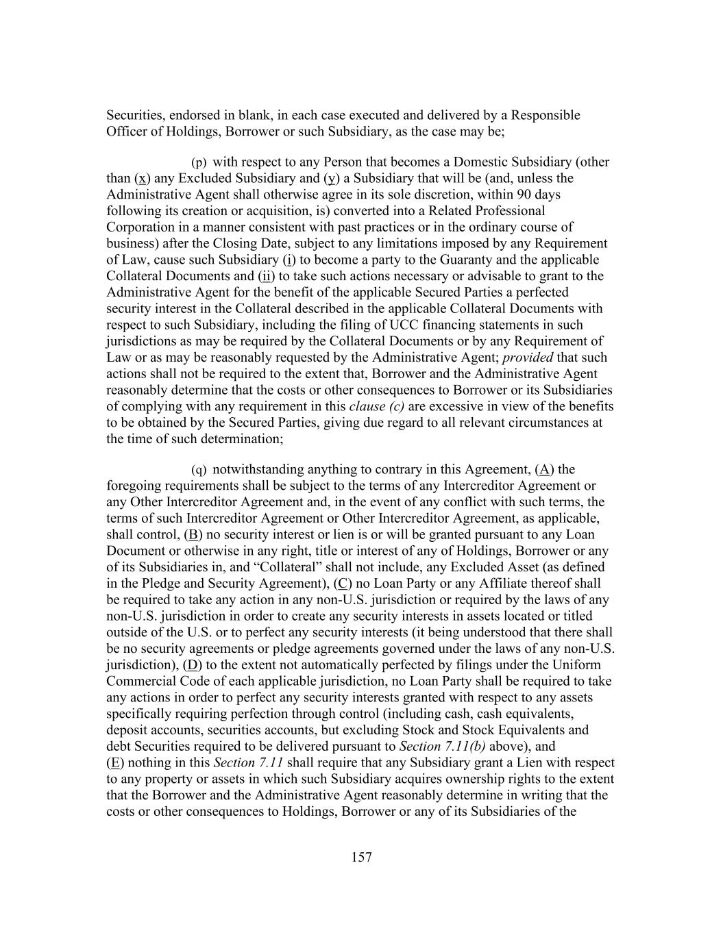157 Securities, endorsed in blank, in each case executed and delivered by a Responsible Officer of Holdings, Borrower or such Subsidiary, as the case may be; (p) with respect to any Person that becomes a Domestic Subsidiary (other than (x) any Excluded Subsidiary and (y) a Subsidiary that will be (and, unless the Administrative Agent shall otherwise agree in its sole discretion, within 90 days following its creation or acquisition, is) converted into a Related Professional Corporation in a manner consistent with past practices or in the ordinary course of business) after the Closing Date, subject to any limitations imposed by any Requirement of Law, cause such Subsidiary (i) to become a party to the Guaranty and the applicable Collateral Documents and (ii) to take such actions necessary or advisable to grant to the Administrative Agent for the benefit of the applicable Secured Parties a perfected security interest in the Collateral described in the applicable Collateral Documents with respect to such Subsidiary, including the filing of UCC financing statements in such jurisdictions as may be required by the Collateral Documents or by any Requirement of Law or as may be reasonably requested by the Administrative Agent; provided that such actions shall not be required to the extent that, Borrower and the Administrative Agent reasonably determine that the costs or other consequences to Borrower or its Subsidiaries of complying with any requirement in this clause (c) are excessive in view of the benefits to be obtained by the Secured Parties, giving due regard to all relevant circumstances at the time of such determination; (q) notwithstanding anything to contrary in this Agreement, (A) the foregoing requirements shall be subject to the terms of any Intercreditor Agreement or any Other Intercreditor Agreement and, in the event of any conflict with such terms, the terms of such Intercreditor Agreement or Other Intercreditor Agreement, as applicable, shall control, (B) no security interest or lien is or will be granted pursuant to any Loan Document or otherwise in any right, title or interest of any of Holdings, Borrower or any of its Subsidiaries in, and “Collateral” shall not include, any Excluded Asset (as defined in the Pledge and Security Agreement), (C) no Loan Party or any Affiliate thereof shall be required to take any action in any non-U.S. jurisdiction or required by the laws of any non-U.S. jurisdiction in order to create any security interests in assets located or titled outside of the U.S. or to perfect any security interests (it being understood that there shall be no security agreements or pledge agreements governed under the laws of any non-U.S. jurisdiction), (D) to the extent not automatically perfected by filings under the Uniform Commercial Code of each applicable jurisdiction, no Loan Party shall be required to take any actions in order to perfect any security interests granted with respect to any assets specifically requiring perfection through control (including cash, cash equivalents, deposit accounts, securities accounts, but excluding Stock and Stock Equivalents and debt Securities required to be delivered pursuant to Section 7.11(b) above), and (E) nothing in this Section 7.11 shall require that any Subsidiary grant a Lien with respect to any property or assets in which such Subsidiary acquires ownership rights to the extent that the Borrower and the Administrative Agent reasonably determine in writing that the costs or other consequences to Holdings, Borrower or any of its Subsidiaries of the