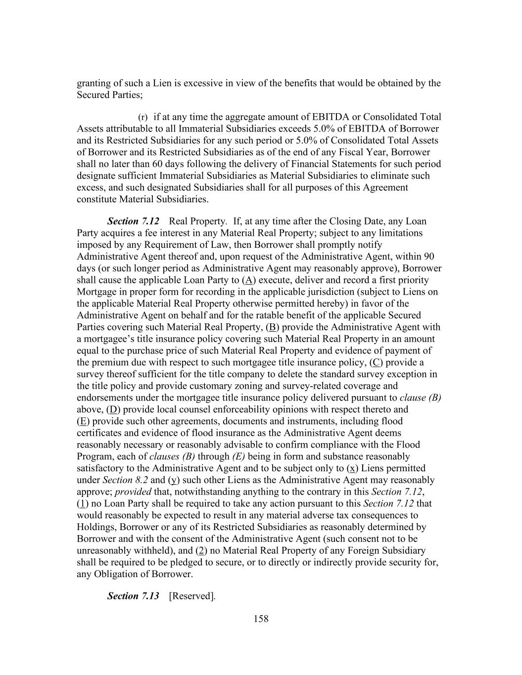 158 granting of such a Lien is excessive in view of the benefits that would be obtained by the Secured Parties; (r) if at any time the aggregate amount of EBITDA or Consolidated Total Assets attributable to all Immaterial Subsidiaries exceeds 5.0% of EBITDA of Borrower and its Restricted Subsidiaries for any such period or 5.0% of Consolidated Total Assets of Borrower and its Restricted Subsidiaries as of the end of any Fiscal Year, Borrower shall no later than 60 days following the delivery of Financial Statements for such period designate sufficient Immaterial Subsidiaries as Material Subsidiaries to eliminate such excess, and such designated Subsidiaries shall for all purposes of this Agreement constitute Material Subsidiaries. Section 7.12 Real Property. If, at any time after the Closing Date, any Loan Party acquires a fee interest in any Material Real Property; subject to any limitations imposed by any Requirement of Law, then Borrower shall promptly notify Administrative Agent thereof and, upon request of the Administrative Agent, within 90 days (or such longer period as Administrative Agent may reasonably approve), Borrower shall cause the applicable Loan Party to (A) execute, deliver and record a first priority Mortgage in proper form for recording in the applicable jurisdiction (subject to Liens on the applicable Material Real Property otherwise permitted hereby) in favor of the Administrative Agent on behalf and for the ratable benefit of the applicable Secured Parties covering such Material Real Property, (B) provide the Administrative Agent with a mortgagee’s title insurance policy covering such Material Real Property in an amount equal to the purchase price of such Material Real Property and evidence of payment of the premium due with respect to such mortgagee title insurance policy, (C) provide a survey thereof sufficient for the title company to delete the standard survey exception in the title policy and provide customary zoning and survey-related coverage and endorsements under the mortgagee title insurance policy delivered pursuant to clause (B) above, (D) provide local counsel enforceability opinions with respect thereto and (E) provide such other agreements, documents and instruments, including flood certificates and evidence of flood insurance as the Administrative Agent deems reasonably necessary or reasonably advisable to confirm compliance with the Flood Program, each of clauses (B) through (E) being in form and substance reasonably satisfactory to the Administrative Agent and to be subject only to (x) Liens permitted under Section 8.2 and (y) such other Liens as the Administrative Agent may reasonably approve; provided that, notwithstanding anything to the contrary in this Section 7.12, (1) no Loan Party shall be required to take any action pursuant to this Section 7.12 that would reasonably be expected to result in any material adverse tax consequences to Holdings, Borrower or any of its Restricted Subsidiaries as reasonably determined by Borrower and with the consent of the Administrative Agent (such consent not to be unreasonably withheld), and (2) no Material Real Property of any Foreign Subsidiary shall be required to be pledged to secure, or to directly or indirectly provide security for, any Obligation of Borrower. Section 7.13 [Reserved].