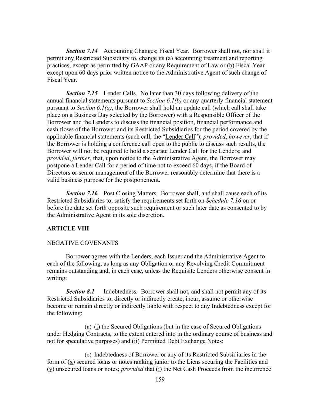 159 Section 7.14 Accounting Changes; Fiscal Year. Borrower shall not, nor shall it permit any Restricted Subsidiary to, change its (a) accounting treatment and reporting practices, except as permitted by GAAP or any Requirement of Law or (b) Fiscal Year except upon 60 days prior written notice to the Administrative Agent of such change of Fiscal Year. Section 7.15 Lender Calls. No later than 30 days following delivery of the annual financial statements pursuant to Section 6.1(b) or any quarterly financial statement pursuant to Section 6.1(a), the Borrower shall hold an update call (which call shall take place on a Business Day selected by the Borrower) with a Responsible Officer of the Borrower and the Lenders to discuss the financial position, financial performance and cash flows of the Borrower and its Restricted Subsidiaries for the period covered by the applicable financial statements (such call, the “Lender Call”); provided, however, that if the Borrower is holding a conference call open to the public to discuss such results, the Borrower will not be required to hold a separate Lender Call for the Lenders; and provided, further, that, upon notice to the Administrative Agent, the Borrower may postpone a Lender Call for a period of time not to exceed 60 days, if the Board of Directors or senior management of the Borrower reasonably determine that there is a valid business purpose for the postponement. Section 7.16 Post Closing Matters. Borrower shall, and shall cause each of its Restricted Subsidiaries to, satisfy the requirements set forth on Schedule 7.16 on or before the date set forth opposite such requirement or such later date as consented to by the Administrative Agent in its sole discretion. ARTICLE VIII NEGATIVE COVENANTS Borrower agrees with the Lenders, each Issuer and the Administrative Agent to each of the following, as long as any Obligation or any Revolving Credit Commitment remains outstanding and, in each case, unless the Requisite Lenders otherwise consent in writing: Section 8.1 Indebtedness. Borrower shall not, and shall not permit any of its Restricted Subsidiaries to, directly or indirectly create, incur, assume or otherwise become or remain directly or indirectly liable with respect to any Indebtedness except for the following: (n) (i) the Secured Obligations (but in the case of Secured Obligations under Hedging Contracts, to the extent entered into in the ordinary course of business and not for speculative purposes) and (ii) Permitted Debt Exchange Notes; (o) Indebtedness of Borrower or any of its Restricted Subsidiaries in the form of (x) secured loans or notes ranking junior to the Liens securing the Facilities and (y) unsecured loans or notes; provided that (i) the Net Cash Proceeds from the incurrence