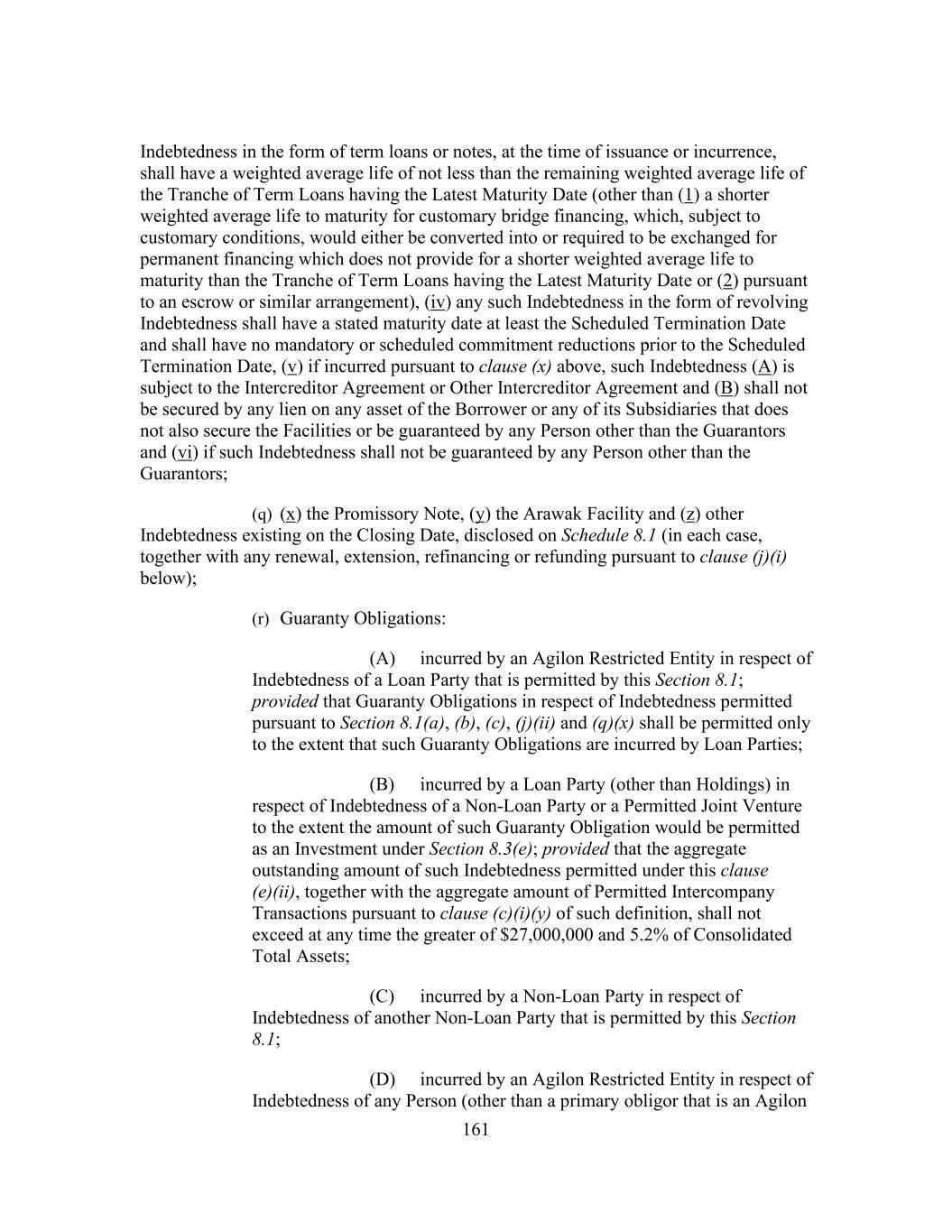 161 Indebtedness in the form of term loans or notes, at the time of issuance or incurrence, shall have a weighted average life of not less than the remaining weighted average life of the Tranche of Term Loans having the Latest Maturity Date (other than (1) a shorter weighted average life to maturity for customary bridge financing, which, subject to customary conditions, would either be converted into or required to be exchanged for permanent financing which does not provide for a shorter weighted average life to maturity than the Tranche of Term Loans having the Latest Maturity Date or (2) pursuant to an escrow or similar arrangement), (iv) any such Indebtedness in the form of revolving Indebtedness shall have a stated maturity date at least the Scheduled Termination Date and shall have no mandatory or scheduled commitment reductions prior to the Scheduled Termination Date, (v) if incurred pursuant to clause (x) above, such Indebtedness (A) is subject to the Intercreditor Agreement or Other Intercreditor Agreement and (B) shall not be secured by any lien on any asset of the Borrower or any of its Subsidiaries that does not also secure the Facilities or be guaranteed by any Person other than the Guarantors and (vi) if such Indebtedness shall not be guaranteed by any Person other than the Guarantors; (q) (x) the Promissory Note, (y) the Arawak Facility and (z) other Indebtedness existing on the Closing Date, disclosed on Schedule 8.1 (in each case, together with any renewal, extension, refinancing or refunding pursuant to clause (j)(i) below); (r) Guaranty Obligations: (A) incurred by an Agilon Restricted Entity in respect of Indebtedness of a Loan Party that is permitted by this Section 8.1; provided that Guaranty Obligations in respect of Indebtedness permitted pursuant to Section 8.1(a), (b), (c), (j)(ii) and (q)(x) shall be permitted only to the extent that such Guaranty Obligations are incurred by Loan Parties; (B) incurred by a Loan Party (other than Holdings) in respect of Indebtedness of a Non-Loan Party or a Permitted Joint Venture to the extent the amount of such Guaranty Obligation would be permitted as an Investment under Section 8.3(e); provided that the aggregate outstanding amount of such Indebtedness permitted under this clause (e)(ii), together with the aggregate amount of Permitted Intercompany Transactions pursuant to clause (c)(i)(y) of such definition, shall not exceed at any time the greater of $27,000,000 and 5.2% of Consolidated Total Assets; (C) incurred by a Non-Loan Party in respect of Indebtedness of another Non-Loan Party that is permitted by this Section 8.1; (D) incurred by an Agilon Restricted Entity in respect of Indebtedness of any Person (other than a primary obligor that is an Agilon
