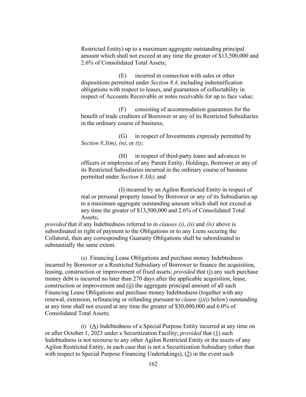 162 Restricted Entity) up to a maximum aggregate outstanding principal amount which shall not exceed at any time the greater of $13,500,000 and 2.6% of Consolidated Total Assets; (E) incurred in connection with sales or other dispositions permitted under Section 8.4, including indemnification obligations with respect to leases, and guarantees of collectability in respect of Accounts Receivable or notes receivable for up to face value; (F) consisting of accommodation guarantees for the benefit of trade creditors of Borrower or any of its Restricted Subsidiaries in the ordinary course of business; (G) in respect of Investments expressly permitted by Section 8.3(m), (n), or (t); (H) in respect of third-party loans and advances to officers or employees of any Parent Entity, Holdings, Borrower or any of its Restricted Subsidiaries incurred in the ordinary course of business permitted under Section 8.3(k); and (I) incurred by an Agilon Restricted Entity in respect of real or personal property leased by Borrower or any of its Subsidiaries up to a maximum aggregate outstanding amount which shall not exceed at any time the greater of $13,500,000 and 2.6% of Consolidated Total Assets; provided that if any Indebtedness referred to in clauses (i), (ii) and (iv) above is subordinated in right of payment to the Obligations or to any Liens securing the Collateral, then any corresponding Guaranty Obligations shall be subordinated to substantially the same extent. (s) Financing Lease Obligations and purchase money Indebtedness incurred by Borrower or a Restricted Subsidiary of Borrower to finance the acquisition, leasing, construction or improvement of fixed assets; provided that (i) any such purchase money debt is incurred no later than 270 days after the applicable acquisition, lease, construction or improvement and (ii) the aggregate principal amount of all such Financing Lease Obligations and purchase money Indebtedness (together with any renewal, extension, refinancing or refunding pursuant to clause (j)(i) below) outstanding at any time shall not exceed at any time the greater of $30,000,000 and 6.0% of Consolidated Total Assets; (t) (A) Indebtedness of a Special Purpose Entity incurred at any time on or after October 1, 2023 under a Securitization Facility; provided that (1) such Indebtedness is not recourse to any other Agilon Restricted Entity or the assets of any Agilon Restricted Entity, in each case that is not a Securitization Subsidiary (other than with respect to Special Purpose Financing Undertakings), (2) in the event such