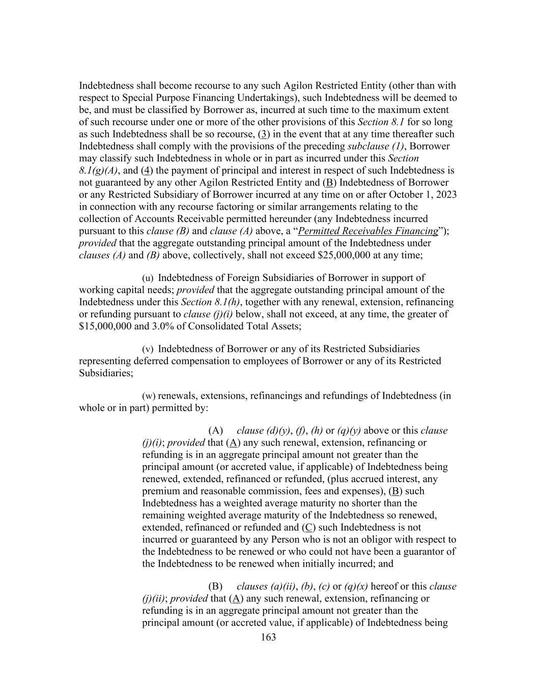 163 Indebtedness shall become recourse to any such Agilon Restricted Entity (other than with respect to Special Purpose Financing Undertakings), such Indebtedness will be deemed to be, and must be classified by Borrower as, incurred at such time to the maximum extent of such recourse under one or more of the other provisions of this Section 8.1 for so long as such Indebtedness shall be so recourse, (3) in the event that at any time thereafter such Indebtedness shall comply with the provisions of the preceding subclause (1), Borrower may classify such Indebtedness in whole or in part as incurred under this Section 8.1(g)(A), and (4) the payment of principal and interest in respect of such Indebtedness is not guaranteed by any other Agilon Restricted Entity and (B) Indebtedness of Borrower or any Restricted Subsidiary of Borrower incurred at any time on or after October 1, 2023 in connection with any recourse factoring or similar arrangements relating to the collection of Accounts Receivable permitted hereunder (any Indebtedness incurred pursuant to this clause (B) and clause (A) above, a “Permitted Receivables Financing”); provided that the aggregate outstanding principal amount of the Indebtedness under clauses (A) and (B) above, collectively, shall not exceed $25,000,000 at any time; (u) Indebtedness of Foreign Subsidiaries of Borrower in support of working capital needs; provided that the aggregate outstanding principal amount of the Indebtedness under this Section 8.1(h), together with any renewal, extension, refinancing or refunding pursuant to clause (j)(i) below, shall not exceed, at any time, the greater of $15,000,000 and 3.0% of Consolidated Total Assets; (v) Indebtedness of Borrower or any of its Restricted Subsidiaries representing deferred compensation to employees of Borrower or any of its Restricted Subsidiaries; (w) renewals, extensions, refinancings and refundings of Indebtedness (in whole or in part) permitted by: (A) clause (d)(y), (f), (h) or (q)(y) above or this clause (j)(i); provided that (A) any such renewal, extension, refinancing or refunding is in an aggregate principal amount not greater than the principal amount (or accreted value, if applicable) of Indebtedness being renewed, extended, refinanced or refunded, (plus accrued interest, any premium and reasonable commission, fees and expenses), (B) such Indebtedness has a weighted average maturity no shorter than the remaining weighted average maturity of the Indebtedness so renewed, extended, refinanced or refunded and (C) such Indebtedness is not incurred or guaranteed by any Person who is not an obligor with respect to the Indebtedness to be renewed or who could not have been a guarantor of the Indebtedness to be renewed when initially incurred; and (B) clauses (a)(ii), (b), (c) or (q)(x) hereof or this clause (j)(ii); provided that (A) any such renewal, extension, refinancing or refunding is in an aggregate principal amount not greater than the principal amount (or accreted value, if applicable) of Indebtedness being