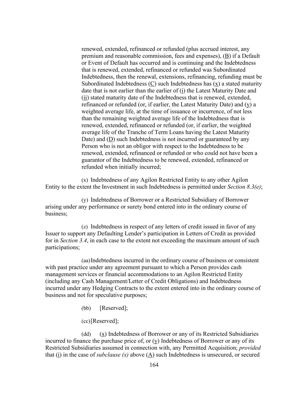 164 renewed, extended, refinanced or refunded (plus accrued interest, any premium and reasonable commission, fees and expenses), (B) if a Default or Event of Default has occurred and is continuing and the Indebtedness that is renewed, extended, refinanced or refunded was Subordinated Indebtedness, then the renewal, extensions, refinancing, refunding must be Subordinated Indebtedness (C) such Indebtedness has (x) a stated maturity date that is not earlier than the earlier of (i) the Latest Maturity Date and (ii) stated maturity date of the Indebtedness that is renewed, extended, refinanced or refunded (or, if earlier, the Latest Maturity Date) and (y) a weighted average life, at the time of issuance or incurrence, of not less than the remaining weighted average life of the Indebtedness that is renewed, extended, refinanced or refunded (or, if earlier, the weighted average life of the Tranche of Term Loans having the Latest Maturity Date) and (D) such Indebtedness is not incurred or guaranteed by any Person who is not an obligor with respect to the Indebtedness to be renewed, extended, refinanced or refunded or who could not have been a guarantor of the Indebtedness to be renewed, extended, refinanced or refunded when initially incurred; (x) Indebtedness of any Agilon Restricted Entity to any other Agilon Entity to the extent the Investment in such Indebtedness is permitted under Section 8.3(e); (y) Indebtedness of Borrower or a Restricted Subsidiary of Borrower arising under any performance or surety bond entered into in the ordinary course of business; (z) Indebtedness in respect of any letters of credit issued in favor of any Issuer to support any Defaulting Lender’s participation in Letters of Credit as provided for in Section 3.4, in each case to the extent not exceeding the maximum amount of such participations; (aa) Indebtedness incurred in the ordinary course of business or consistent with past practice under any agreement pursuant to which a Person provides cash management services or financial accommodations to an Agilon Restricted Entity (including any Cash Management/Letter of Credit Obligations) and Indebtedness incurred under any Hedging Contracts to the extent entered into in the ordinary course of business and not for speculative purposes; (bb) [Reserved]; (cc) [Reserved]; (dd) (x) Indebtedness of Borrower or any of its Restricted Subsidiaries incurred to finance the purchase price of, or (y) Indebtedness of Borrower or any of its Restricted Subsidiaries assumed in connection with, any Permitted Acquisition; provided that (i) in the case of subclause (x) above (A) such Indebtedness is unsecured, or secured
