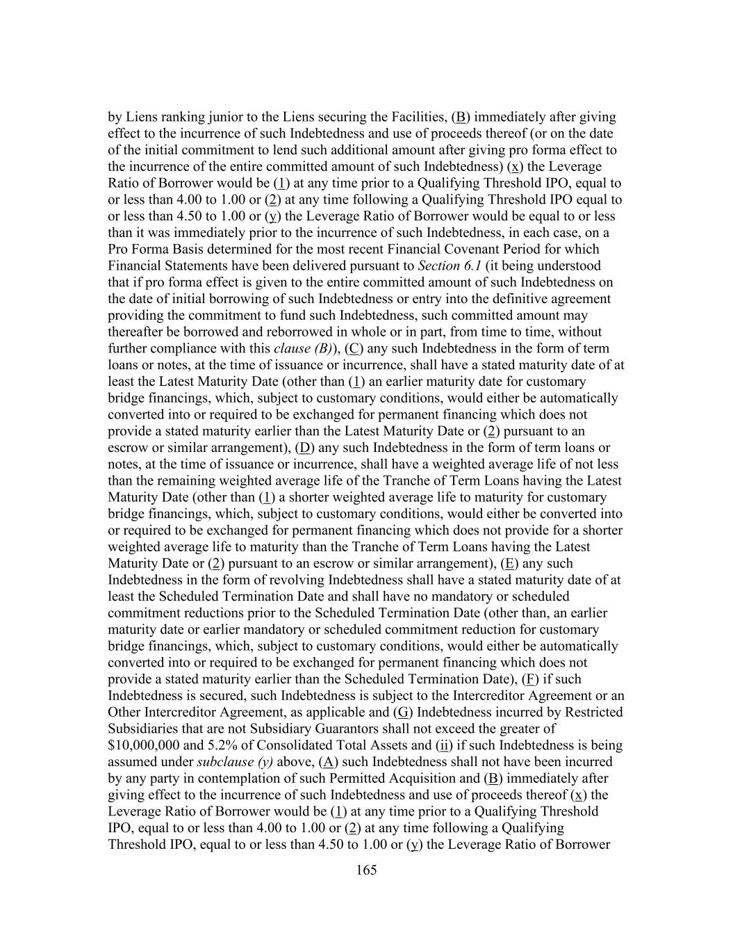 165 by Liens ranking junior to the Liens securing the Facilities, (B) immediately after giving effect to the incurrence of such Indebtedness and use of proceeds thereof (or on the date of the initial commitment to lend such additional amount after giving pro forma effect to the incurrence of the entire committed amount of such Indebtedness) (x) the Leverage Ratio of Borrower would be (1) at any time prior to a Qualifying Threshold IPO, equal to or less than 4.00 to 1.00 or (2) at any time following a Qualifying Threshold IPO equal to or less than 4.50 to 1.00 or (y) the Leverage Ratio of Borrower would be equal to or less than it was immediately prior to the incurrence of such Indebtedness, in each case, on a Pro Forma Basis determined for the most recent Financial Covenant Period for which Financial Statements have been delivered pursuant to Section 6.1 (it being understood that if pro forma effect is given to the entire committed amount of such Indebtedness on the date of initial borrowing of such Indebtedness or entry into the definitive agreement providing the commitment to fund such Indebtedness, such committed amount may thereafter be borrowed and reborrowed in whole or in part, from time to time, without further compliance with this clause (B)), (C) any such Indebtedness in the form of term loans or notes, at the time of issuance or incurrence, shall have a stated maturity date of at least the Latest Maturity Date (other than (1) an earlier maturity date for customary bridge financings, which, subject to customary conditions, would either be automatically converted into or required to be exchanged for permanent financing which does not provide a stated maturity earlier than the Latest Maturity Date or (2) pursuant to an escrow or similar arrangement), (D) any such Indebtedness in the form of term loans or notes, at the time of issuance or incurrence, shall have a weighted average life of not less than the remaining weighted average life of the Tranche of Term Loans having the Latest Maturity Date (other than (1) a shorter weighted average life to maturity for customary bridge financings, which, subject to customary conditions, would either be converted into or required to be exchanged for permanent financing which does not provide for a shorter weighted average life to maturity than the Tranche of Term Loans having the Latest Maturity Date or (2) pursuant to an escrow or similar arrangement), (E) any such Indebtedness in the form of revolving Indebtedness shall have a stated maturity date of at least the Scheduled Termination Date and shall have no mandatory or scheduled commitment reductions prior to the Scheduled Termination Date (other than, an earlier maturity date or earlier mandatory or scheduled commitment reduction for customary bridge financings, which, subject to customary conditions, would either be automatically converted into or required to be exchanged for permanent financing which does not provide a stated maturity earlier than the Scheduled Termination Date), (F) if such Indebtedness is secured, such Indebtedness is subject to the Intercreditor Agreement or an Other Intercreditor Agreement, as applicable and (G) Indebtedness incurred by Restricted Subsidiaries that are not Subsidiary Guarantors shall not exceed the greater of $10,000,000 and 5.2% of Consolidated Total Assets and (ii) if such Indebtedness is being assumed under subclause (y) above, (A) such Indebtedness shall not have been incurred by any party in contemplation of such Permitted Acquisition and (B) immediately after giving effect to the incurrence of such Indebtedness and use of proceeds thereof (x) the Leverage Ratio of Borrower would be (1) at any time prior to a Qualifying Threshold IPO, equal to or less than 4.00 to 1.00 or (2) at any time following a Qualifying Threshold IPO, equal to or less than 4.50 to 1.00 or (y) the Leverage Ratio of Borrower