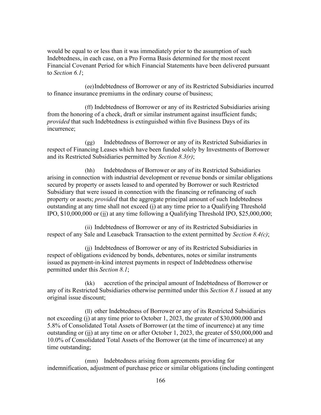 166 would be equal to or less than it was immediately prior to the assumption of such Indebtedness, in each case, on a Pro Forma Basis determined for the most recent Financial Covenant Period for which Financial Statements have been delivered pursuant to Section 6.1; (ee) Indebtedness of Borrower or any of its Restricted Subsidiaries incurred to finance insurance premiums in the ordinary course of business; (ff) Indebtedness of Borrower or any of its Restricted Subsidiaries arising from the honoring of a check, draft or similar instrument against insufficient funds; provided that such Indebtedness is extinguished within five Business Days of its incurrence; (gg) Indebtedness of Borrower or any of its Restricted Subsidiaries in respect of Financing Leases which have been funded solely by Investments of Borrower and its Restricted Subsidiaries permitted by Section 8.3(r); (hh) Indebtedness of Borrower or any of its Restricted Subsidiaries arising in connection with industrial development or revenue bonds or similar obligations secured by property or assets leased to and operated by Borrower or such Restricted Subsidiary that were issued in connection with the financing or refinancing of such property or assets; provided that the aggregate principal amount of such Indebtedness outstanding at any time shall not exceed (i) at any time prior to a Qualifying Threshold IPO, $10,000,000 or (ii) at any time following a Qualifying Threshold IPO, $25,000,000; (ii) Indebtedness of Borrower or any of its Restricted Subsidiaries in respect of any Sale and Leaseback Transaction to the extent permitted by Section 8.4(c); (jj) Indebtedness of Borrower or any of its Restricted Subsidiaries in respect of obligations evidenced by bonds, debentures, notes or similar instruments issued as payment-in-kind interest payments in respect of Indebtedness otherwise permitted under this Section 8.1; (kk) accretion of the principal amount of Indebtedness of Borrower or any of its Restricted Subsidiaries otherwise permitted under this Section 8.1 issued at any original issue discount; (ll) other Indebtedness of Borrower or any of its Restricted Subsidiaries not exceeding (i) at any time prior to October 1, 2023, the greater of $30,000,000 and 5.8% of Consolidated Total Assets of Borrower (at the time of incurrence) at any time outstanding or (ii) at any time on or after October 1, 2023, the greater of $50,000,000 and 10.0% of Consolidated Total Assets of the Borrower (at the time of incurrence) at any time outstanding; (mm) Indebtedness arising from agreements providing for indemnification, adjustment of purchase price or similar obligations (including contingent