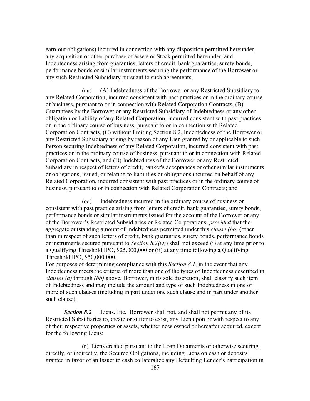 167 earn-out obligations) incurred in connection with any disposition permitted hereunder, any acquisition or other purchase of assets or Stock permitted hereunder, and Indebtedness arising from guaranties, letters of credit, bank guaranties, surety bonds, performance bonds or similar instruments securing the performance of the Borrower or any such Restricted Subsidiary pursuant to such agreements; (nn) (A) Indebtedness of the Borrower or any Restricted Subsidiary to any Related Corporation, incurred consistent with past practices or in the ordinary course of business, pursuant to or in connection with Related Corporation Contracts, (B) Guarantees by the Borrower or any Restricted Subsidiary of Indebtedness or any other obligation or liability of any Related Corporation, incurred consistent with past practices or in the ordinary course of business, pursuant to or in connection with Related Corporation Contracts, (C) without limiting Section 8.2, Indebtedness of the Borrower or any Restricted Subsidiary arising by reason of any Lien granted by or applicable to such Person securing Indebtedness of any Related Corporation, incurred consistent with past practices or in the ordinary course of business, pursuant to or in connection with Related Corporation Contracts, and (D) Indebtedness of the Borrower or any Restricted Subsidiary in respect of letters of credit, banker's acceptances or other similar instruments or obligations, issued, or relating to liabilities or obligations incurred on behalf of any Related Corporation, incurred consistent with past practices or in the ordinary course of business, pursuant to or in connection with Related Corporation Contracts; and (oo) Indebtedness incurred in the ordinary course of business or consistent with past practice arising from letters of credit, bank guaranties, surety bonds, performance bonds or similar instruments issued for the account of the Borrower or any of the Borrower’s Restricted Subsidiaries or Related Corporations; provided that the aggregate outstanding amount of Indebtedness permitted under this clause (bb) (other than in respect of such letters of credit, bank guaranties, surety bonds, performance bonds or instruments secured pursuant to Section 8.2(w)) shall not exceed (i) at any time prior to a Qualifying Threshold IPO, $25,000,000 or (ii) at any time following a Qualifying Threshold IPO, $50,000,000. For purposes of determining compliance with this Section 8.1, in the event that any Indebtedness meets the criteria of more than one of the types of Indebtedness described in clauses (a) through (bb) above, Borrower, in its sole discretion, shall classify such item of Indebtedness and may include the amount and type of such Indebtedness in one or more of such clauses (including in part under one such clause and in part under another such clause). Section 8.2 Liens, Etc. Borrower shall not, and shall not permit any of its Restricted Subsidiaries to, create or suffer to exist, any Lien upon or with respect to any of their respective properties or assets, whether now owned or hereafter acquired, except for the following Liens: (n) Liens created pursuant to the Loan Documents or otherwise securing, directly, or indirectly, the Secured Obligations, including Liens on cash or deposits granted in favor of an Issuer to cash collateralize any Defaulting Lender’s participation in