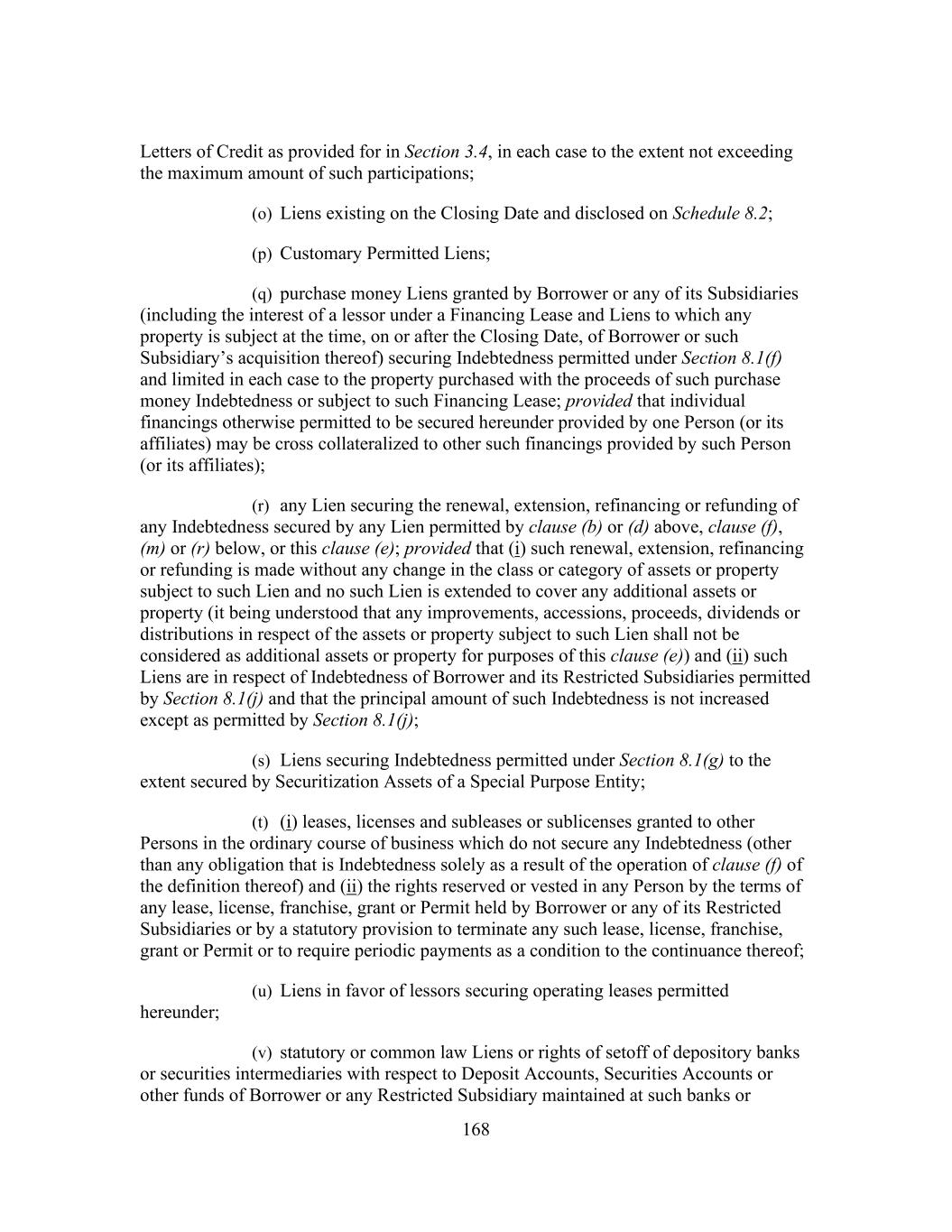 168 Letters of Credit as provided for in Section 3.4, in each case to the extent not exceeding the maximum amount of such participations; (o) Liens existing on the Closing Date and disclosed on Schedule 8.2; (p) Customary Permitted Liens; (q) purchase money Liens granted by Borrower or any of its Subsidiaries (including the interest of a lessor under a Financing Lease and Liens to which any property is subject at the time, on or after the Closing Date, of Borrower or such Subsidiary’s acquisition thereof) securing Indebtedness permitted under Section 8.1(f) and limited in each case to the property purchased with the proceeds of such purchase money Indebtedness or subject to such Financing Lease; provided that individual financings otherwise permitted to be secured hereunder provided by one Person (or its affiliates) may be cross collateralized to other such financings provided by such Person (or its affiliates); (r) any Lien securing the renewal, extension, refinancing or refunding of any Indebtedness secured by any Lien permitted by clause (b) or (d) above, clause (f), (m) or (r) below, or this clause (e); provided that (i) such renewal, extension, refinancing or refunding is made without any change in the class or category of assets or property subject to such Lien and no such Lien is extended to cover any additional assets or property (it being understood that any improvements, accessions, proceeds, dividends or distributions in respect of the assets or property subject to such Lien shall not be considered as additional assets or property for purposes of this clause (e)) and (ii) such Liens are in respect of Indebtedness of Borrower and its Restricted Subsidiaries permitted by Section 8.1(j) and that the principal amount of such Indebtedness is not increased except as permitted by Section 8.1(j); (s) Liens securing Indebtedness permitted under Section 8.1(g) to the extent secured by Securitization Assets of a Special Purpose Entity; (t) (i) leases, licenses and subleases or sublicenses granted to other Persons in the ordinary course of business which do not secure any Indebtedness (other than any obligation that is Indebtedness solely as a result of the operation of clause (f) of the definition thereof) and (ii) the rights reserved or vested in any Person by the terms of any lease, license, franchise, grant or Permit held by Borrower or any of its Restricted Subsidiaries or by a statutory provision to terminate any such lease, license, franchise, grant or Permit or to require periodic payments as a condition to the continuance thereof; (u) Liens in favor of lessors securing operating leases permitted hereunder; (v) statutory or common law Liens or rights of setoff of depository banks or securities intermediaries with respect to Deposit Accounts, Securities Accounts or other funds of Borrower or any Restricted Subsidiary maintained at such banks or