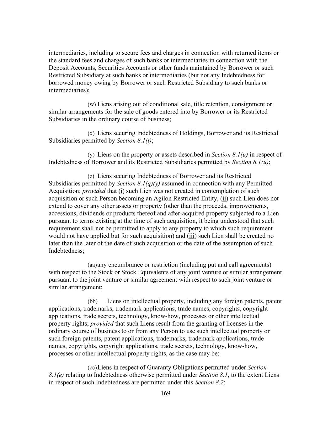 169 intermediaries, including to secure fees and charges in connection with returned items or the standard fees and charges of such banks or intermediaries in connection with the Deposit Accounts, Securities Accounts or other funds maintained by Borrower or such Restricted Subsidiary at such banks or intermediaries (but not any Indebtedness for borrowed money owing by Borrower or such Restricted Subsidiary to such banks or intermediaries); (w) Liens arising out of conditional sale, title retention, consignment or similar arrangements for the sale of goods entered into by Borrower or its Restricted Subsidiaries in the ordinary course of business; (x) Liens securing Indebtedness of Holdings, Borrower and its Restricted Subsidiaries permitted by Section 8.1(t); (y) Liens on the property or assets described in Section 8.1(u) in respect of Indebtedness of Borrower and its Restricted Subsidiaries permitted by Section 8.1(u); (z) Liens securing Indebtedness of Borrower and its Restricted Subsidiaries permitted by Section 8.1(q)(y) assumed in connection with any Permitted Acquisition; provided that (i) such Lien was not created in contemplation of such acquisition or such Person becoming an Agilon Restricted Entity, (ii) such Lien does not extend to cover any other assets or property (other than the proceeds, improvements, accessions, dividends or products thereof and after-acquired property subjected to a Lien pursuant to terms existing at the time of such acquisition, it being understood that such requirement shall not be permitted to apply to any property to which such requirement would not have applied but for such acquisition) and (iii) such Lien shall be created no later than the later of the date of such acquisition or the date of the assumption of such Indebtedness; (aa) any encumbrance or restriction (including put and call agreements) with respect to the Stock or Stock Equivalents of any joint venture or similar arrangement pursuant to the joint venture or similar agreement with respect to such joint venture or similar arrangement; (bb) Liens on intellectual property, including any foreign patents, patent applications, trademarks, trademark applications, trade names, copyrights, copyright applications, trade secrets, technology, know-how, processes or other intellectual property rights; provided that such Liens result from the granting of licenses in the ordinary course of business to or from any Person to use such intellectual property or such foreign patents, patent applications, trademarks, trademark applications, trade names, copyrights, copyright applications, trade secrets, technology, know-how, processes or other intellectual property rights, as the case may be; (cc) Liens in respect of Guaranty Obligations permitted under Section 8.1(e) relating to Indebtedness otherwise permitted under Section 8.1, to the extent Liens in respect of such Indebtedness are permitted under this Section 8.2;