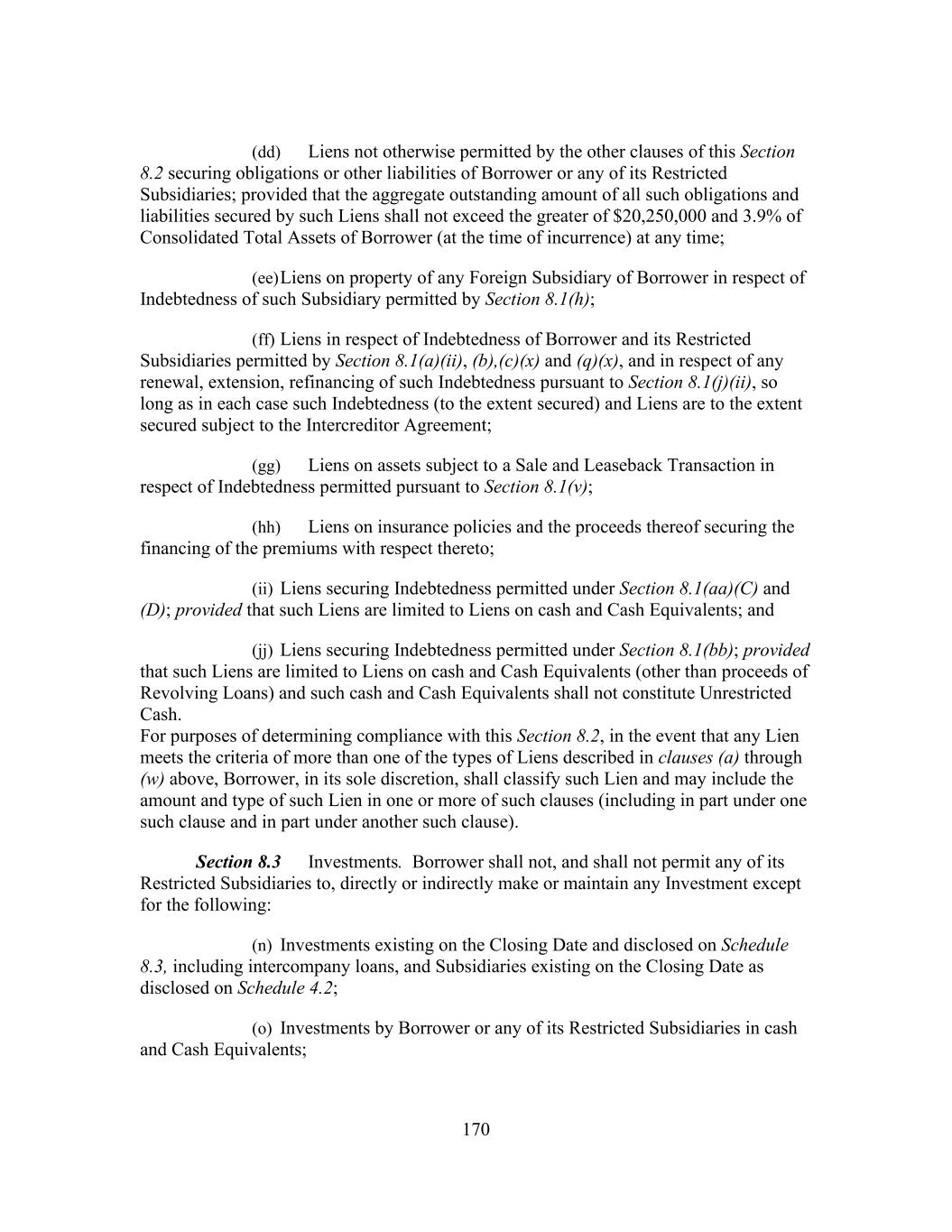 170 (dd) Liens not otherwise permitted by the other clauses of this Section 8.2 securing obligations or other liabilities of Borrower or any of its Restricted Subsidiaries; provided that the aggregate outstanding amount of all such obligations and liabilities secured by such Liens shall not exceed the greater of $20,250,000 and 3.9% of Consolidated Total Assets of Borrower (at the time of incurrence) at any time; (ee) Liens on property of any Foreign Subsidiary of Borrower in respect of Indebtedness of such Subsidiary permitted by Section 8.1(h); (ff) Liens in respect of Indebtedness of Borrower and its Restricted Subsidiaries permitted by Section 8.1(a)(ii), (b),(c)(x) and (q)(x), and in respect of any renewal, extension, refinancing of such Indebtedness pursuant to Section 8.1(j)(ii), so long as in each case such Indebtedness (to the extent secured) and Liens are to the extent secured subject to the Intercreditor Agreement; (gg) Liens on assets subject to a Sale and Leaseback Transaction in respect of Indebtedness permitted pursuant to Section 8.1(v); (hh) Liens on insurance policies and the proceeds thereof securing the financing of the premiums with respect thereto; (ii) Liens securing Indebtedness permitted under Section 8.1(aa)(C) and (D); provided that such Liens are limited to Liens on cash and Cash Equivalents; and (jj) Liens securing Indebtedness permitted under Section 8.1(bb); provided that such Liens are limited to Liens on cash and Cash Equivalents (other than proceeds of Revolving Loans) and such cash and Cash Equivalents shall not constitute Unrestricted Cash. For purposes of determining compliance with this Section 8.2, in the event that any Lien meets the criteria of more than one of the types of Liens described in clauses (a) through (w) above, Borrower, in its sole discretion, shall classify such Lien and may include the amount and type of such Lien in one or more of such clauses (including in part under one such clause and in part under another such clause). Section 8.3 Investments. Borrower shall not, and shall not permit any of its Restricted Subsidiaries to, directly or indirectly make or maintain any Investment except for the following: (n) Investments existing on the Closing Date and disclosed on Schedule 8.3, including intercompany loans, and Subsidiaries existing on the Closing Date as disclosed on Schedule 4.2; (o) Investments by Borrower or any of its Restricted Subsidiaries in cash and Cash Equivalents;