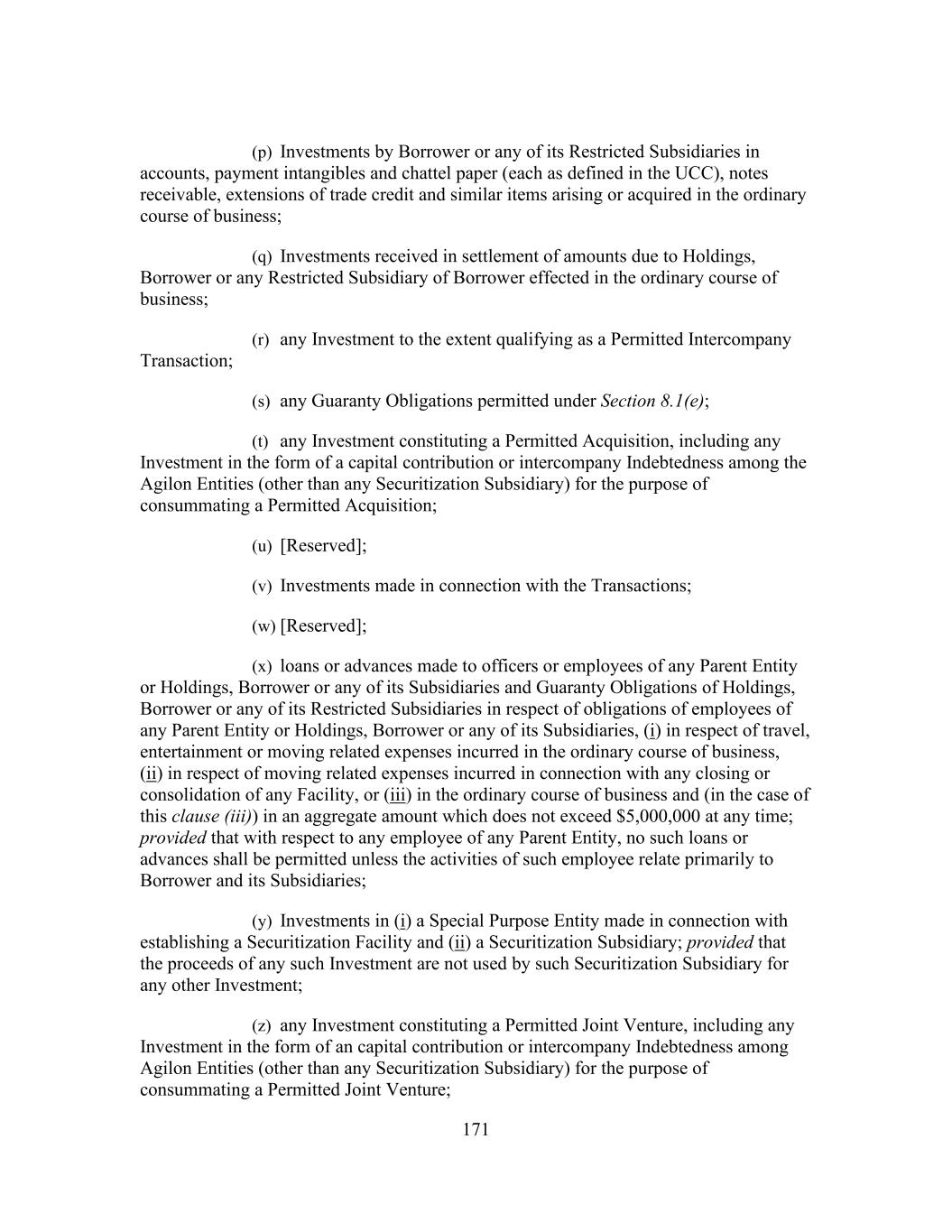 171 (p) Investments by Borrower or any of its Restricted Subsidiaries in accounts, payment intangibles and chattel paper (each as defined in the UCC), notes receivable, extensions of trade credit and similar items arising or acquired in the ordinary course of business; (q) Investments received in settlement of amounts due to Holdings, Borrower or any Restricted Subsidiary of Borrower effected in the ordinary course of business; (r) any Investment to the extent qualifying as a Permitted Intercompany Transaction; (s) any Guaranty Obligations permitted under Section 8.1(e); (t) any Investment constituting a Permitted Acquisition, including any Investment in the form of a capital contribution or intercompany Indebtedness among the Agilon Entities (other than any Securitization Subsidiary) for the purpose of consummating a Permitted Acquisition; (u) [Reserved]; (v) Investments made in connection with the Transactions; (w) [Reserved]; (x) loans or advances made to officers or employees of any Parent Entity or Holdings, Borrower or any of its Subsidiaries and Guaranty Obligations of Holdings, Borrower or any of its Restricted Subsidiaries in respect of obligations of employees of any Parent Entity or Holdings, Borrower or any of its Subsidiaries, (i) in respect of travel, entertainment or moving related expenses incurred in the ordinary course of business, (ii) in respect of moving related expenses incurred in connection with any closing or consolidation of any Facility, or (iii) in the ordinary course of business and (in the case of this clause (iii)) in an aggregate amount which does not exceed $5,000,000 at any time; provided that with respect to any employee of any Parent Entity, no such loans or advances shall be permitted unless the activities of such employee relate primarily to Borrower and its Subsidiaries; (y) Investments in (i) a Special Purpose Entity made in connection with establishing a Securitization Facility and (ii) a Securitization Subsidiary; provided that the proceeds of any such Investment are not used by such Securitization Subsidiary for any other Investment; (z) any Investment constituting a Permitted Joint Venture, including any Investment in the form of an capital contribution or intercompany Indebtedness among Agilon Entities (other than any Securitization Subsidiary) for the purpose of consummating a Permitted Joint Venture;