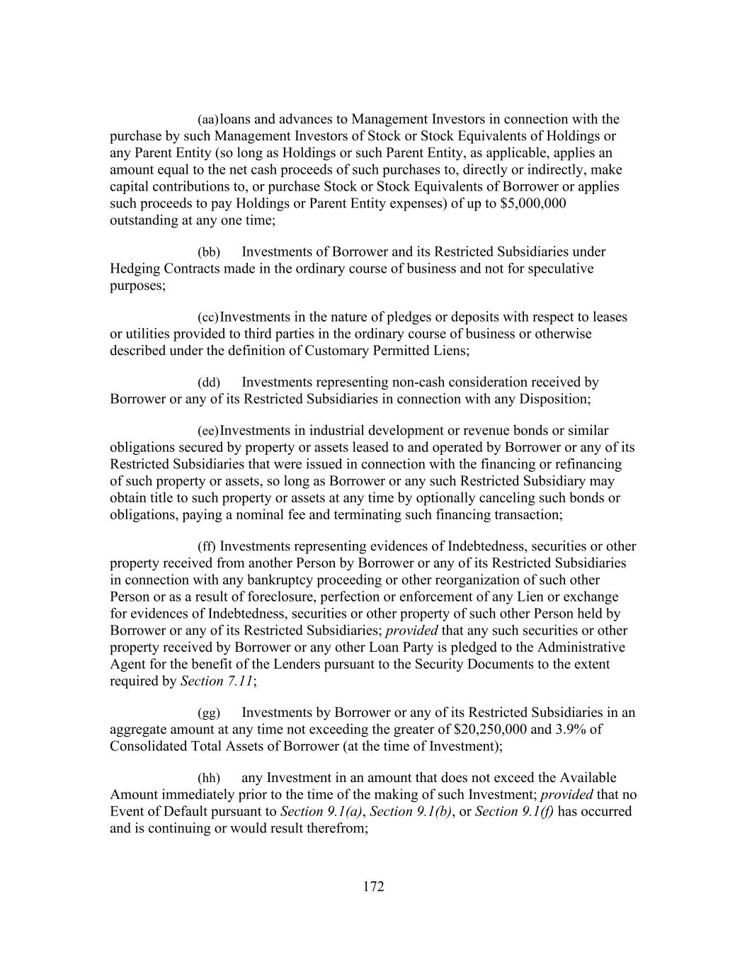 172 (aa) loans and advances to Management Investors in connection with the purchase by such Management Investors of Stock or Stock Equivalents of Holdings or any Parent Entity (so long as Holdings or such Parent Entity, as applicable, applies an amount equal to the net cash proceeds of such purchases to, directly or indirectly, make capital contributions to, or purchase Stock or Stock Equivalents of Borrower or applies such proceeds to pay Holdings or Parent Entity expenses) of up to $5,000,000 outstanding at any one time; (bb) Investments of Borrower and its Restricted Subsidiaries under Hedging Contracts made in the ordinary course of business and not for speculative purposes; (cc) Investments in the nature of pledges or deposits with respect to leases or utilities provided to third parties in the ordinary course of business or otherwise described under the definition of Customary Permitted Liens; (dd) Investments representing non-cash consideration received by Borrower or any of its Restricted Subsidiaries in connection with any Disposition; (ee) Investments in industrial development or revenue bonds or similar obligations secured by property or assets leased to and operated by Borrower or any of its Restricted Subsidiaries that were issued in connection with the financing or refinancing of such property or assets, so long as Borrower or any such Restricted Subsidiary may obtain title to such property or assets at any time by optionally canceling such bonds or obligations, paying a nominal fee and terminating such financing transaction; (ff) Investments representing evidences of Indebtedness, securities or other property received from another Person by Borrower or any of its Restricted Subsidiaries in connection with any bankruptcy proceeding or other reorganization of such other Person or as a result of foreclosure, perfection or enforcement of any Lien or exchange for evidences of Indebtedness, securities or other property of such other Person held by Borrower or any of its Restricted Subsidiaries; provided that any such securities or other property received by Borrower or any other Loan Party is pledged to the Administrative Agent for the benefit of the Lenders pursuant to the Security Documents to the extent required by Section 7.11; (gg) Investments by Borrower or any of its Restricted Subsidiaries in an aggregate amount at any time not exceeding the greater of $20,250,000 and 3.9% of Consolidated Total Assets of Borrower (at the time of Investment); (hh) any Investment in an amount that does not exceed the Available Amount immediately prior to the time of the making of such Investment; provided that no Event of Default pursuant to Section 9.1(a), Section 9.1(b), or Section 9.1(f) has occurred and is continuing or would result therefrom;