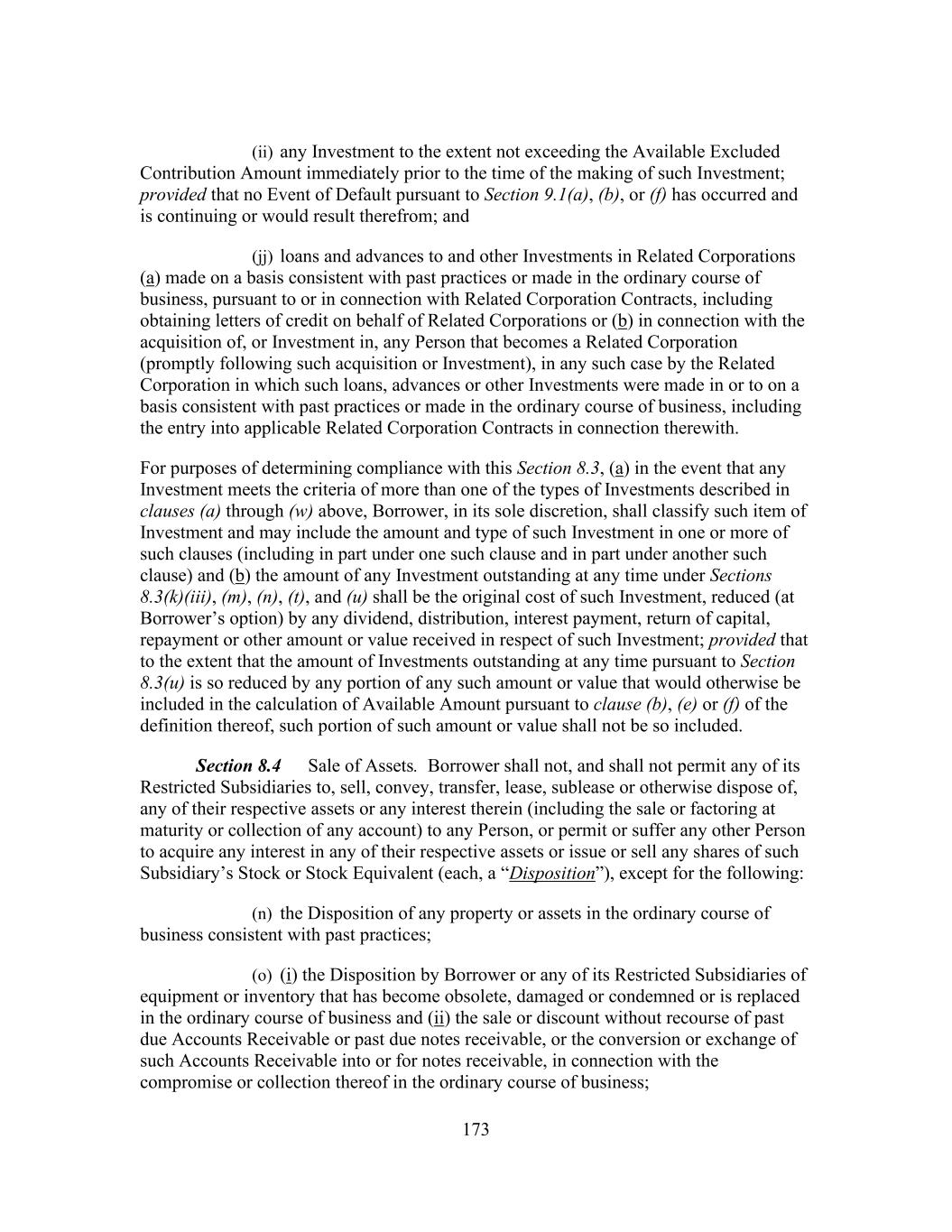 173 (ii) any Investment to the extent not exceeding the Available Excluded Contribution Amount immediately prior to the time of the making of such Investment; provided that no Event of Default pursuant to Section 9.1(a), (b), or (f) has occurred and is continuing or would result therefrom; and (jj) loans and advances to and other Investments in Related Corporations (a) made on a basis consistent with past practices or made in the ordinary course of business, pursuant to or in connection with Related Corporation Contracts, including obtaining letters of credit on behalf of Related Corporations or (b) in connection with the acquisition of, or Investment in, any Person that becomes a Related Corporation (promptly following such acquisition or Investment), in any such case by the Related Corporation in which such loans, advances or other Investments were made in or to on a basis consistent with past practices or made in the ordinary course of business, including the entry into applicable Related Corporation Contracts in connection therewith. For purposes of determining compliance with this Section 8.3, (a) in the event that any Investment meets the criteria of more than one of the types of Investments described in clauses (a) through (w) above, Borrower, in its sole discretion, shall classify such item of Investment and may include the amount and type of such Investment in one or more of such clauses (including in part under one such clause and in part under another such clause) and (b) the amount of any Investment outstanding at any time under Sections 8.3(k)(iii), (m), (n), (t), and (u) shall be the original cost of such Investment, reduced (at Borrower’s option) by any dividend, distribution, interest payment, return of capital, repayment or other amount or value received in respect of such Investment; provided that to the extent that the amount of Investments outstanding at any time pursuant to Section 8.3(u) is so reduced by any portion of any such amount or value that would otherwise be included in the calculation of Available Amount pursuant to clause (b), (e) or (f) of the definition thereof, such portion of such amount or value shall not be so included. Section 8.4 Sale of Assets. Borrower shall not, and shall not permit any of its Restricted Subsidiaries to, sell, convey, transfer, lease, sublease or otherwise dispose of, any of their respective assets or any interest therein (including the sale or factoring at maturity or collection of any account) to any Person, or permit or suffer any other Person to acquire any interest in any of their respective assets or issue or sell any shares of such Subsidiary’s Stock or Stock Equivalent (each, a “Disposition”), except for the following: (n) the Disposition of any property or assets in the ordinary course of business consistent with past practices; (o) (i) the Disposition by Borrower or any of its Restricted Subsidiaries of equipment or inventory that has become obsolete, damaged or condemned or is replaced in the ordinary course of business and (ii) the sale or discount without recourse of past due Accounts Receivable or past due notes receivable, or the conversion or exchange of such Accounts Receivable into or for notes receivable, in connection with the compromise or collection thereof in the ordinary course of business;