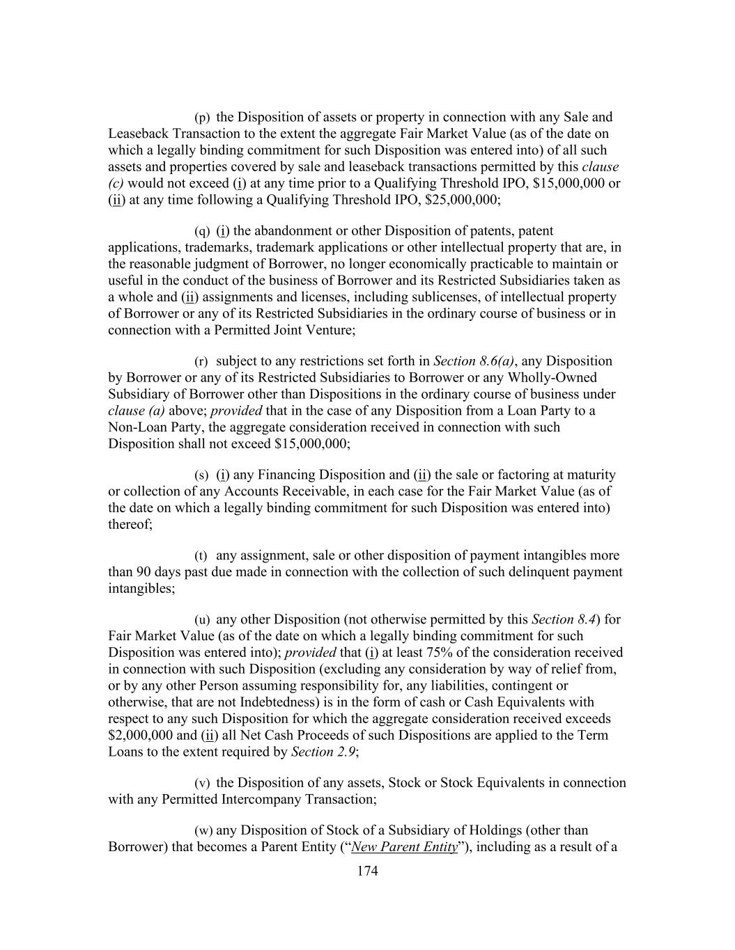 174 (p) the Disposition of assets or property in connection with any Sale and Leaseback Transaction to the extent the aggregate Fair Market Value (as of the date on which a legally binding commitment for such Disposition was entered into) of all such assets and properties covered by sale and leaseback transactions permitted by this clause (c) would not exceed (i) at any time prior to a Qualifying Threshold IPO, $15,000,000 or (ii) at any time following a Qualifying Threshold IPO, $25,000,000; (q) (i) the abandonment or other Disposition of patents, patent applications, trademarks, trademark applications or other intellectual property that are, in the reasonable judgment of Borrower, no longer economically practicable to maintain or useful in the conduct of the business of Borrower and its Restricted Subsidiaries taken as a whole and (ii) assignments and licenses, including sublicenses, of intellectual property of Borrower or any of its Restricted Subsidiaries in the ordinary course of business or in connection with a Permitted Joint Venture; (r) subject to any restrictions set forth in Section 8.6(a), any Disposition by Borrower or any of its Restricted Subsidiaries to Borrower or any Wholly-Owned Subsidiary of Borrower other than Dispositions in the ordinary course of business under clause (a) above; provided that in the case of any Disposition from a Loan Party to a Non-Loan Party, the aggregate consideration received in connection with such Disposition shall not exceed $15,000,000; (s) (i) any Financing Disposition and (ii) the sale or factoring at maturity or collection of any Accounts Receivable, in each case for the Fair Market Value (as of the date on which a legally binding commitment for such Disposition was entered into) thereof; (t) any assignment, sale or other disposition of payment intangibles more than 90 days past due made in connection with the collection of such delinquent payment intangibles; (u) any other Disposition (not otherwise permitted by this Section 8.4) for Fair Market Value (as of the date on which a legally binding commitment for such Disposition was entered into); provided that (i) at least 75% of the consideration received in connection with such Disposition (excluding any consideration by way of relief from, or by any other Person assuming responsibility for, any liabilities, contingent or otherwise, that are not Indebtedness) is in the form of cash or Cash Equivalents with respect to any such Disposition for which the aggregate consideration received exceeds $2,000,000 and (ii) all Net Cash Proceeds of such Dispositions are applied to the Term Loans to the extent required by Section 2.9; (v) the Disposition of any assets, Stock or Stock Equivalents in connection with any Permitted Intercompany Transaction; (w) any Disposition of Stock of a Subsidiary of Holdings (other than Borrower) that becomes a Parent Entity (“New Parent Entity”), including as a result of a