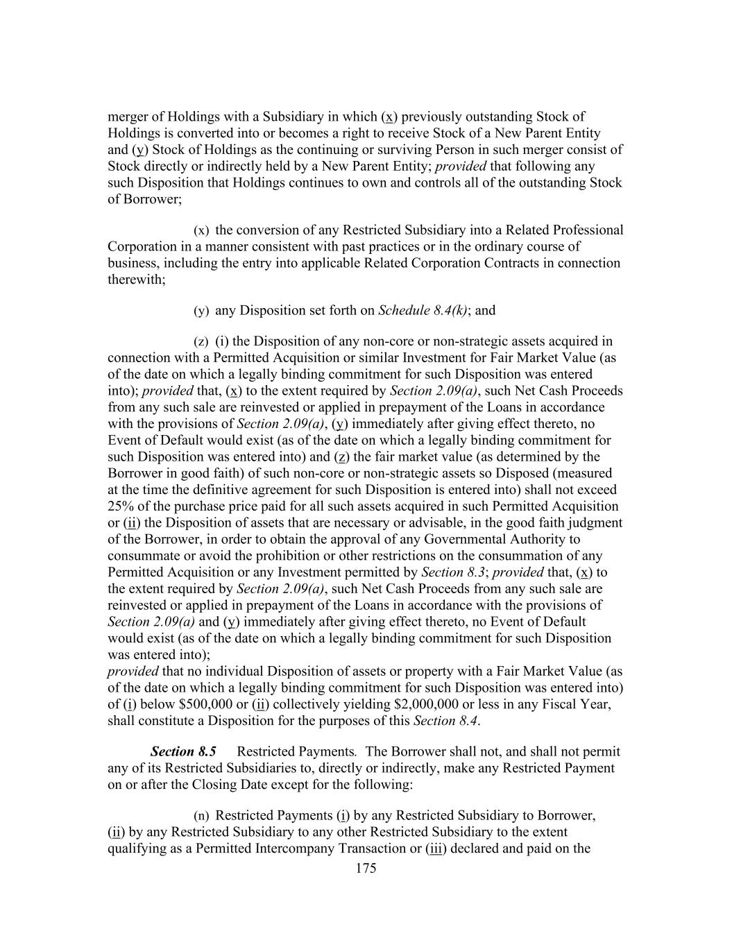 175 merger of Holdings with a Subsidiary in which (x) previously outstanding Stock of Holdings is converted into or becomes a right to receive Stock of a New Parent Entity and (y) Stock of Holdings as the continuing or surviving Person in such merger consist of Stock directly or indirectly held by a New Parent Entity; provided that following any such Disposition that Holdings continues to own and controls all of the outstanding Stock of Borrower; (x) the conversion of any Restricted Subsidiary into a Related Professional Corporation in a manner consistent with past practices or in the ordinary course of business, including the entry into applicable Related Corporation Contracts in connection therewith; (y) any Disposition set forth on Schedule 8.4(k); and (z) (i) the Disposition of any non-core or non-strategic assets acquired in connection with a Permitted Acquisition or similar Investment for Fair Market Value (as of the date on which a legally binding commitment for such Disposition was entered into); provided that, (x) to the extent required by Section 2.09(a), such Net Cash Proceeds from any such sale are reinvested or applied in prepayment of the Loans in accordance with the provisions of Section 2.09(a), (y) immediately after giving effect thereto, no Event of Default would exist (as of the date on which a legally binding commitment for such Disposition was entered into) and (z) the fair market value (as determined by the Borrower in good faith) of such non-core or non-strategic assets so Disposed (measured at the time the definitive agreement for such Disposition is entered into) shall not exceed 25% of the purchase price paid for all such assets acquired in such Permitted Acquisition or (ii) the Disposition of assets that are necessary or advisable, in the good faith judgment of the Borrower, in order to obtain the approval of any Governmental Authority to consummate or avoid the prohibition or other restrictions on the consummation of any Permitted Acquisition or any Investment permitted by Section 8.3; provided that, (x) to the extent required by Section 2.09(a), such Net Cash Proceeds from any such sale are reinvested or applied in prepayment of the Loans in accordance with the provisions of Section 2.09(a) and (y) immediately after giving effect thereto, no Event of Default would exist (as of the date on which a legally binding commitment for such Disposition was entered into); provided that no individual Disposition of assets or property with a Fair Market Value (as of the date on which a legally binding commitment for such Disposition was entered into) of (i) below $500,000 or (ii) collectively yielding $2,000,000 or less in any Fiscal Year, shall constitute a Disposition for the purposes of this Section 8.4. Section 8.5 Restricted Payments. The Borrower shall not, and shall not permit any of its Restricted Subsidiaries to, directly or indirectly, make any Restricted Payment on or after the Closing Date except for the following: (n) Restricted Payments (i) by any Restricted Subsidiary to Borrower, (ii) by any Restricted Subsidiary to any other Restricted Subsidiary to the extent qualifying as a Permitted Intercompany Transaction or (iii) declared and paid on the