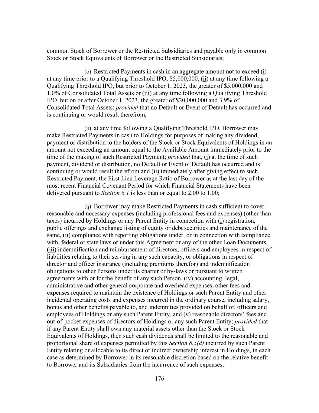 176 common Stock of Borrower or the Restricted Subsidiaries and payable only in common Stock or Stock Equivalents of Borrower or the Restricted Subsidiaries; (o) Restricted Payments in cash in an aggregate amount not to exceed (i) at any time prior to a Qualifying Threshold IPO, $5,000,000, (ii) at any time following a Qualifying Threshold IPO, but prior to October 1, 2023, the greater of $5,000,000 and 1.0% of Consolidated Total Assets or (iii) at any time following a Qualifying Threshold IPO, but on or after October 1, 2023, the greater of $20,000,000 and 3.9% of Consolidated Total Assets; provided that no Default or Event of Default has occurred and is continuing or would result therefrom; (p) at any time following a Qualifying Threshold IPO, Borrower may make Restricted Payments in cash to Holdings for purposes of making any dividend, payment or distribution to the holders of the Stock or Stock Equivalents of Holdings in an amount not exceeding an amount equal to the Available Amount immediately prior to the time of the making of such Restricted Payment; provided that, (i) at the time of such payment, dividend or distribution, no Default or Event of Default has occurred and is continuing or would result therefrom and (ii) immediately after giving effect to such Restricted Payment, the First Lien Leverage Ratio of Borrower as at the last day of the most recent Financial Covenant Period for which Financial Statements have been delivered pursuant to Section 6.1 is less than or equal to 2.00 to 1.00; (q) Borrower may make Restricted Payments in cash sufficient to cover reasonable and necessary expenses (including professional fees and expenses) (other than taxes) incurred by Holdings or any Parent Entity in connection with (i) registration, public offerings and exchange listing of equity or debt securities and maintenance of the same, (ii) compliance with reporting obligations under, or in connection with compliance with, federal or state laws or under this Agreement or any of the other Loan Documents, (iii) indemnification and reimbursement of directors, officers and employees in respect of liabilities relating to their serving in any such capacity, or obligations in respect of director and officer insurance (including premiums therefor) and indemnification obligations to other Persons under its charter or by-laws or pursuant to written agreements with or for the benefit of any such Person, (iv) accounting, legal, administrative and other general corporate and overhead expenses, other fees and expenses required to maintain the existence of Holdings or such Parent Entity and other incidental operating costs and expenses incurred in the ordinary course, including salary, bonus and other benefits payable to, and indemnities provided on behalf of, officers and employees of Holdings or any such Parent Entity, and (v) reasonable directors’ fees and out-of-pocket expenses of directors of Holdings or any such Parent Entity; provided that if any Parent Entity shall own any material assets other than the Stock or Stock Equivalents of Holdings, then such cash dividends shall be limited to the reasonable and proportional share of expenses permitted by this Section 8.5(d) incurred by such Parent Entity relating or allocable to its direct or indirect ownership interest in Holdings, in each case as determined by Borrower in its reasonable discretion based on the relative benefit to Borrower and its Subsidiaries from the incurrence of such expenses;