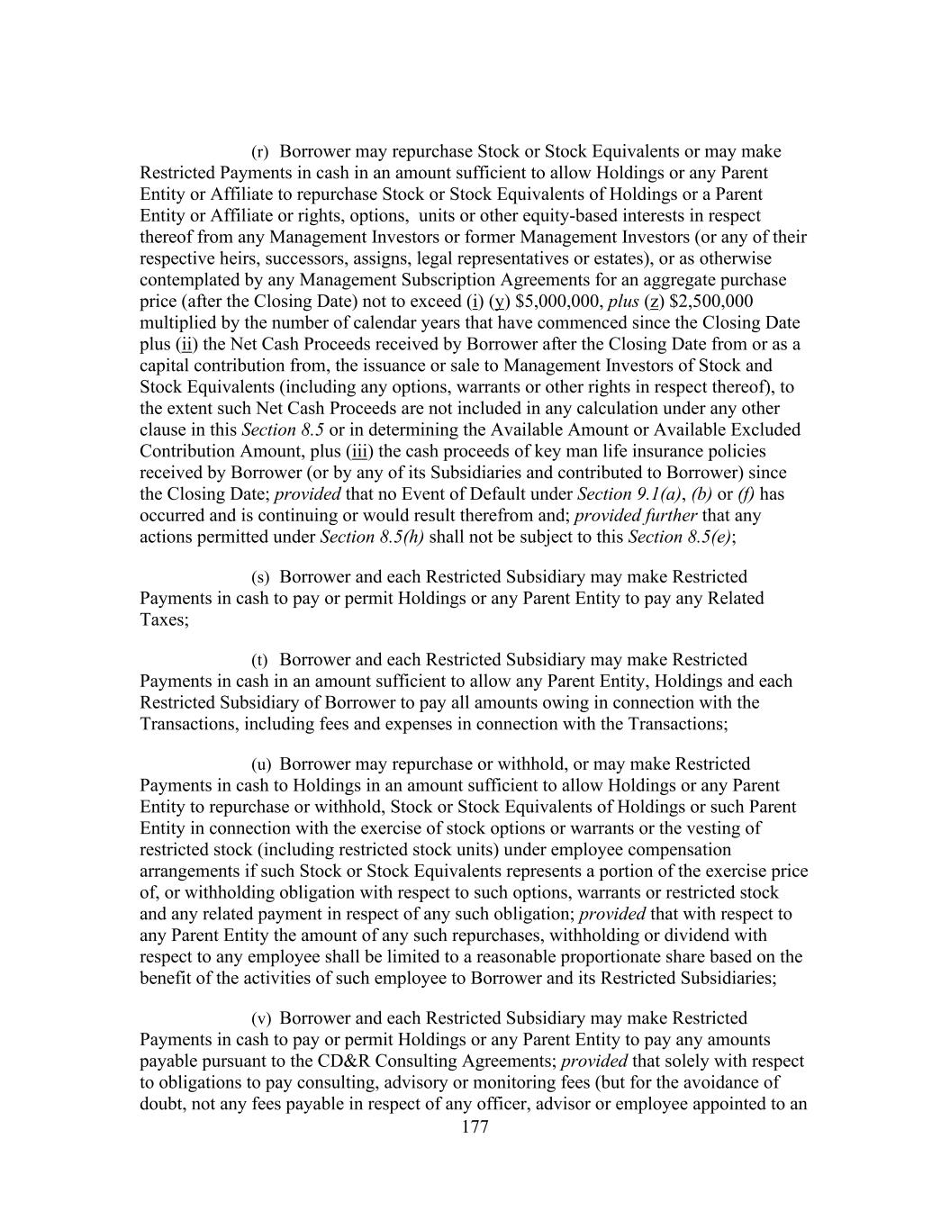 177 (r) Borrower may repurchase Stock or Stock Equivalents or may make Restricted Payments in cash in an amount sufficient to allow Holdings or any Parent Entity or Affiliate to repurchase Stock or Stock Equivalents of Holdings or a Parent Entity or Affiliate or rights, options, units or other equity-based interests in respect thereof from any Management Investors or former Management Investors (or any of their respective heirs, successors, assigns, legal representatives or estates), or as otherwise contemplated by any Management Subscription Agreements for an aggregate purchase price (after the Closing Date) not to exceed (i) (y) $5,000,000, plus (z) $2,500,000 multiplied by the number of calendar years that have commenced since the Closing Date plus (ii) the Net Cash Proceeds received by Borrower after the Closing Date from or as a capital contribution from, the issuance or sale to Management Investors of Stock and Stock Equivalents (including any options, warrants or other rights in respect thereof), to the extent such Net Cash Proceeds are not included in any calculation under any other clause in this Section 8.5 or in determining the Available Amount or Available Excluded Contribution Amount, plus (iii) the cash proceeds of key man life insurance policies received by Borrower (or by any of its Subsidiaries and contributed to Borrower) since the Closing Date; provided that no Event of Default under Section 9.1(a), (b) or (f) has occurred and is continuing or would result therefrom and; provided further that any actions permitted under Section 8.5(h) shall not be subject to this Section 8.5(e); (s) Borrower and each Restricted Subsidiary may make Restricted Payments in cash to pay or permit Holdings or any Parent Entity to pay any Related Taxes; (t) Borrower and each Restricted Subsidiary may make Restricted Payments in cash in an amount sufficient to allow any Parent Entity, Holdings and each Restricted Subsidiary of Borrower to pay all amounts owing in connection with the Transactions, including fees and expenses in connection with the Transactions; (u) Borrower may repurchase or withhold, or may make Restricted Payments in cash to Holdings in an amount sufficient to allow Holdings or any Parent Entity to repurchase or withhold, Stock or Stock Equivalents of Holdings or such Parent Entity in connection with the exercise of stock options or warrants or the vesting of restricted stock (including restricted stock units) under employee compensation arrangements if such Stock or Stock Equivalents represents a portion of the exercise price of, or withholding obligation with respect to such options, warrants or restricted stock and any related payment in respect of any such obligation; provided that with respect to any Parent Entity the amount of any such repurchases, withholding or dividend with respect to any employee shall be limited to a reasonable proportionate share based on the benefit of the activities of such employee to Borrower and its Restricted Subsidiaries; (v) Borrower and each Restricted Subsidiary may make Restricted Payments in cash to pay or permit Holdings or any Parent Entity to pay any amounts payable pursuant to the CD&R Consulting Agreements; provided that solely with respect to obligations to pay consulting, advisory or monitoring fees (but for the avoidance of doubt, not any fees payable in respect of any officer, advisor or employee appointed to an