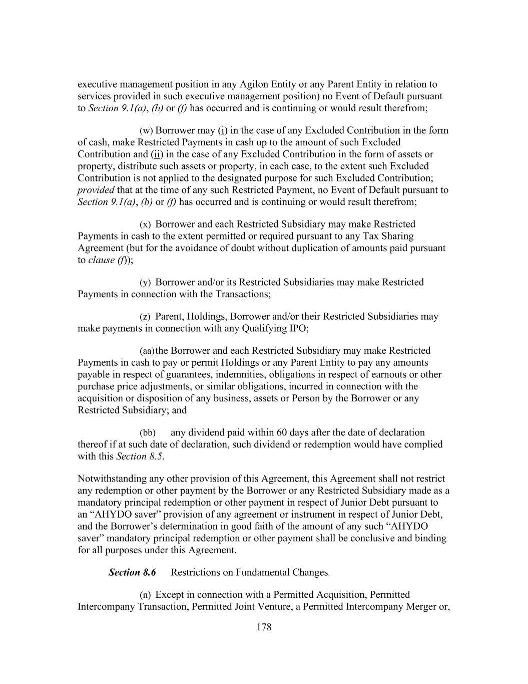 178 executive management position in any Agilon Entity or any Parent Entity in relation to services provided in such executive management position) no Event of Default pursuant to Section 9.1(a), (b) or (f) has occurred and is continuing or would result therefrom; (w) Borrower may (i) in the case of any Excluded Contribution in the form of cash, make Restricted Payments in cash up to the amount of such Excluded Contribution and (ii) in the case of any Excluded Contribution in the form of assets or property, distribute such assets or property, in each case, to the extent such Excluded Contribution is not applied to the designated purpose for such Excluded Contribution; provided that at the time of any such Restricted Payment, no Event of Default pursuant to Section 9.1(a), (b) or (f) has occurred and is continuing or would result therefrom; (x) Borrower and each Restricted Subsidiary may make Restricted Payments in cash to the extent permitted or required pursuant to any Tax Sharing Agreement (but for the avoidance of doubt without duplication of amounts paid pursuant to clause (f)); (y) Borrower and/or its Restricted Subsidiaries may make Restricted Payments in connection with the Transactions; (z) Parent, Holdings, Borrower and/or their Restricted Subsidiaries may make payments in connection with any Qualifying IPO; (aa) the Borrower and each Restricted Subsidiary may make Restricted Payments in cash to pay or permit Holdings or any Parent Entity to pay any amounts payable in respect of guarantees, indemnities, obligations in respect of earnouts or other purchase price adjustments, or similar obligations, incurred in connection with the acquisition or disposition of any business, assets or Person by the Borrower or any Restricted Subsidiary; and (bb) any dividend paid within 60 days after the date of declaration thereof if at such date of declaration, such dividend or redemption would have complied with this Section 8.5. Notwithstanding any other provision of this Agreement, this Agreement shall not restrict any redemption or other payment by the Borrower or any Restricted Subsidiary made as a mandatory principal redemption or other payment in respect of Junior Debt pursuant to an “AHYDO saver” provision of any agreement or instrument in respect of Junior Debt, and the Borrower’s determination in good faith of the amount of any such “AHYDO saver” mandatory principal redemption or other payment shall be conclusive and binding for all purposes under this Agreement. Section 8.6 Restrictions on Fundamental Changes. (n) Except in connection with a Permitted Acquisition, Permitted Intercompany Transaction, Permitted Joint Venture, a Permitted Intercompany Merger or,