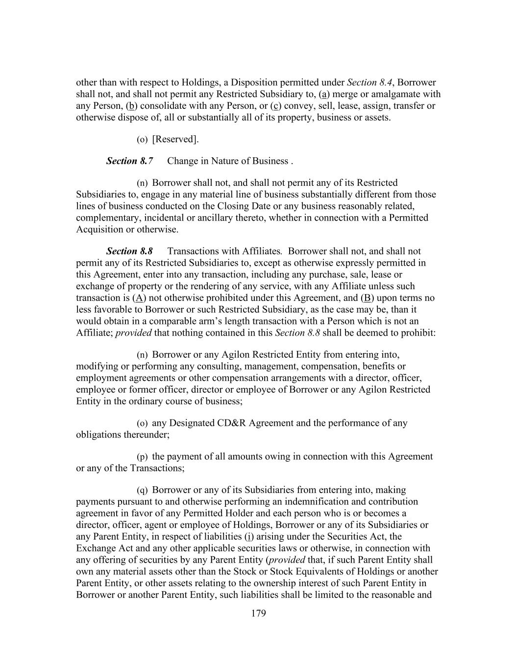 179 other than with respect to Holdings, a Disposition permitted under Section 8.4, Borrower shall not, and shall not permit any Restricted Subsidiary to, (a) merge or amalgamate with any Person, (b) consolidate with any Person, or (c) convey, sell, lease, assign, transfer or otherwise dispose of, all or substantially all of its property, business or assets. (o) [Reserved]. Section 8.7 Change in Nature of Business . (n) Borrower shall not, and shall not permit any of its Restricted Subsidiaries to, engage in any material line of business substantially different from those lines of business conducted on the Closing Date or any business reasonably related, complementary, incidental or ancillary thereto, whether in connection with a Permitted Acquisition or otherwise. Section 8.8 Transactions with Affiliates. Borrower shall not, and shall not permit any of its Restricted Subsidiaries to, except as otherwise expressly permitted in this Agreement, enter into any transaction, including any purchase, sale, lease or exchange of property or the rendering of any service, with any Affiliate unless such transaction is (A) not otherwise prohibited under this Agreement, and (B) upon terms no less favorable to Borrower or such Restricted Subsidiary, as the case may be, than it would obtain in a comparable arm’s length transaction with a Person which is not an Affiliate; provided that nothing contained in this Section 8.8 shall be deemed to prohibit: (n) Borrower or any Agilon Restricted Entity from entering into, modifying or performing any consulting, management, compensation, benefits or employment agreements or other compensation arrangements with a director, officer, employee or former officer, director or employee of Borrower or any Agilon Restricted Entity in the ordinary course of business; (o) any Designated CD&R Agreement and the performance of any obligations thereunder; (p) the payment of all amounts owing in connection with this Agreement or any of the Transactions; (q) Borrower or any of its Subsidiaries from entering into, making payments pursuant to and otherwise performing an indemnification and contribution agreement in favor of any Permitted Holder and each person who is or becomes a director, officer, agent or employee of Holdings, Borrower or any of its Subsidiaries or any Parent Entity, in respect of liabilities (i) arising under the Securities Act, the Exchange Act and any other applicable securities laws or otherwise, in connection with any offering of securities by any Parent Entity (provided that, if such Parent Entity shall own any material assets other than the Stock or Stock Equivalents of Holdings or another Parent Entity, or other assets relating to the ownership interest of such Parent Entity in Borrower or another Parent Entity, such liabilities shall be limited to the reasonable and