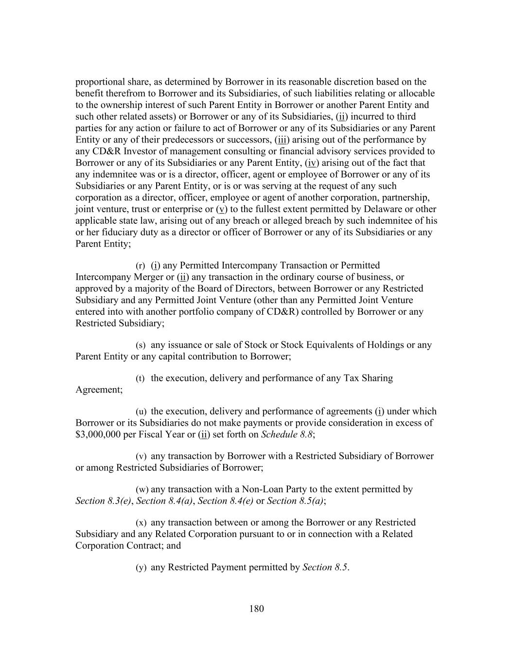 180 proportional share, as determined by Borrower in its reasonable discretion based on the benefit therefrom to Borrower and its Subsidiaries, of such liabilities relating or allocable to the ownership interest of such Parent Entity in Borrower or another Parent Entity and such other related assets) or Borrower or any of its Subsidiaries, (ii) incurred to third parties for any action or failure to act of Borrower or any of its Subsidiaries or any Parent Entity or any of their predecessors or successors, (iii) arising out of the performance by any CD&R Investor of management consulting or financial advisory services provided to Borrower or any of its Subsidiaries or any Parent Entity, (iv) arising out of the fact that any indemnitee was or is a director, officer, agent or employee of Borrower or any of its Subsidiaries or any Parent Entity, or is or was serving at the request of any such corporation as a director, officer, employee or agent of another corporation, partnership, joint venture, trust or enterprise or (v) to the fullest extent permitted by Delaware or other applicable state law, arising out of any breach or alleged breach by such indemnitee of his or her fiduciary duty as a director or officer of Borrower or any of its Subsidiaries or any Parent Entity; (r) (i) any Permitted Intercompany Transaction or Permitted Intercompany Merger or (ii) any transaction in the ordinary course of business, or approved by a majority of the Board of Directors, between Borrower or any Restricted Subsidiary and any Permitted Joint Venture (other than any Permitted Joint Venture entered into with another portfolio company of CD&R) controlled by Borrower or any Restricted Subsidiary; (s) any issuance or sale of Stock or Stock Equivalents of Holdings or any Parent Entity or any capital contribution to Borrower; (t) the execution, delivery and performance of any Tax Sharing Agreement; (u) the execution, delivery and performance of agreements (i) under which Borrower or its Subsidiaries do not make payments or provide consideration in excess of $3,000,000 per Fiscal Year or (ii) set forth on Schedule 8.8; (v) any transaction by Borrower with a Restricted Subsidiary of Borrower or among Restricted Subsidiaries of Borrower; (w) any transaction with a Non-Loan Party to the extent permitted by Section 8.3(e), Section 8.4(a), Section 8.4(e) or Section 8.5(a); (x) any transaction between or among the Borrower or any Restricted Subsidiary and any Related Corporation pursuant to or in connection with a Related Corporation Contract; and (y) any Restricted Payment permitted by Section 8.5.
