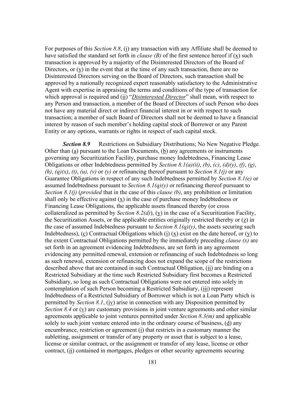 181 For purposes of this Section 8.8, (i) any transaction with any Affiliate shall be deemed to have satisfied the standard set forth in clause (B) of the first sentence hereof if (x) such transaction is approved by a majority of the Disinterested Directors of the Board of Directors, or (y) in the event that at the time of any such transaction, there are no Disinterested Directors serving on the Board of Directors, such transaction shall be approved by a nationally recognized expert reasonably satisfactory to the Administrative Agent with expertise in appraising the terms and conditions of the type of transaction for which approval is required and (ii) “Disinterested Director” shall mean, with respect to any Person and transaction, a member of the Board of Directors of such Person who does not have any material direct or indirect financial interest in or with respect to such transaction; a member of such Board of Directors shall not be deemed to have a financial interest by reason of such member’s holding capital stock of Borrower or any Parent Entity or any options, warrants or rights in respect of such capital stock. Section 8.9 Restrictions on Subsidiary Distributions; No New Negative Pledge. Other than (a) pursuant to the Loan Documents, (b) any agreements or instruments governing any Securitization Facility, purchase money Indebtedness, Financing Lease Obligations or other Indebtedness permitted by Section 8.1(a)(ii), (b), (c), (d)(y), (f), (g), (h), (q)(x), (t), (u), (v) or (y) or refinancing thereof pursuant to Section 8.1(j) or any Guarantee Obligations in respect of any such Indebtedness permitted by Section 8.1(e) or assumed Indebtedness pursuant to Section 8.1(q)(y) or refinancing thereof pursuant to Section 8.1(j) (provided that in the case of this clause (b), any prohibition or limitation shall only be effective against (x) in the case of purchase money Indebtedness or Financing Lease Obligations, the applicable assets financed thereby (or cross collateralized as permitted by Section 8.2(d)), (y) in the case of a Securitization Facility, the Securitization Assets, or the applicable entities originally restricted thereby or (z) in the case of assumed Indebtedness pursuant to Section 8.1(q)(y), the assets securing such Indebtedness), (c) Contractual Obligations which (i) (x) exist on the date hereof, or (y) to the extent Contractual Obligations permitted by the immediately preceding clause (x) are set forth in an agreement evidencing Indebtedness, are set forth in any agreement evidencing any permitted renewal, extension or refinancing of such Indebtedness so long as such renewal, extension or refinancing does not expand the scope of the restrictions described above that are contained in such Contractual Obligation, (ii) are binding on a Restricted Subsidiary at the time such Restricted Subsidiary first becomes a Restricted Subsidiary, so long as such Contractual Obligations were not entered into solely in contemplation of such Person becoming a Restricted Subsidiary, (iii) represent Indebtedness of a Restricted Subsidiary of Borrower which is not a Loan Party which is permitted by Section 8.1, (iv) arise in connection with any Disposition permitted by Section 8.4 or (v) are customary provisions in joint venture agreements and other similar agreements applicable to joint ventures permitted under Section 8.3(m) and applicable solely to such joint venture entered into in the ordinary course of business, (d) any encumbrance, restriction or agreement (i) that restricts in a customary manner the subletting, assignment or transfer of any property or asset that is subject to a lease, license or similar contract, or the assignment or transfer of any lease, license or other contract, (ii) contained in mortgages, pledges or other security agreements securing