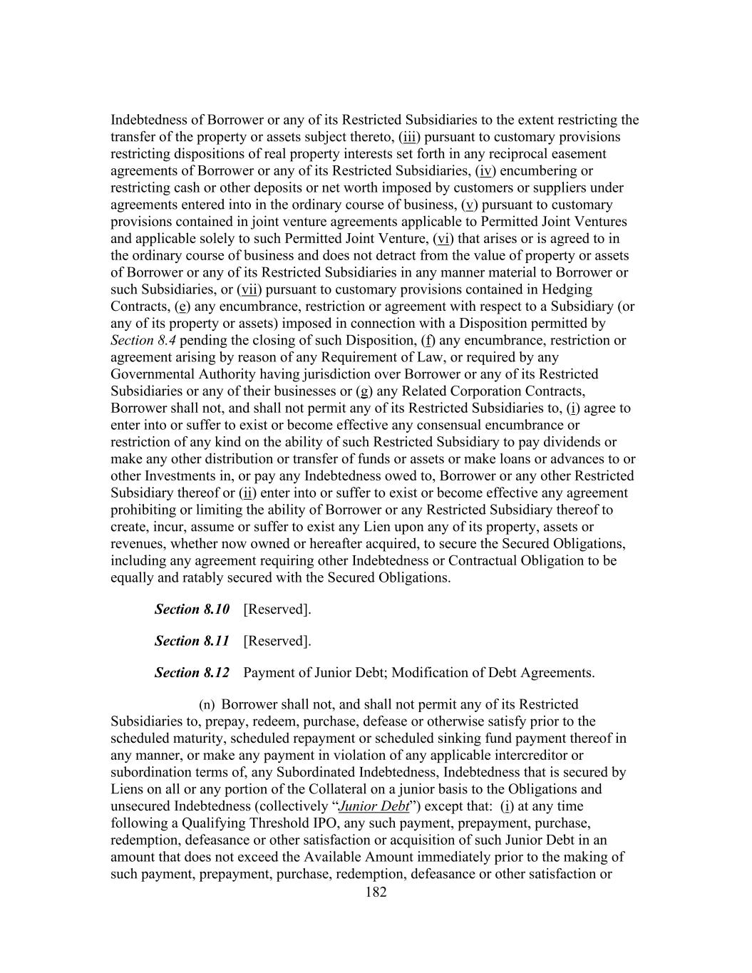 182 Indebtedness of Borrower or any of its Restricted Subsidiaries to the extent restricting the transfer of the property or assets subject thereto, (iii) pursuant to customary provisions restricting dispositions of real property interests set forth in any reciprocal easement agreements of Borrower or any of its Restricted Subsidiaries, (iv) encumbering or restricting cash or other deposits or net worth imposed by customers or suppliers under agreements entered into in the ordinary course of business, (v) pursuant to customary provisions contained in joint venture agreements applicable to Permitted Joint Ventures and applicable solely to such Permitted Joint Venture, (vi) that arises or is agreed to in the ordinary course of business and does not detract from the value of property or assets of Borrower or any of its Restricted Subsidiaries in any manner material to Borrower or such Subsidiaries, or (vii) pursuant to customary provisions contained in Hedging Contracts, (e) any encumbrance, restriction or agreement with respect to a Subsidiary (or any of its property or assets) imposed in connection with a Disposition permitted by Section 8.4 pending the closing of such Disposition, (f) any encumbrance, restriction or agreement arising by reason of any Requirement of Law, or required by any Governmental Authority having jurisdiction over Borrower or any of its Restricted Subsidiaries or any of their businesses or (g) any Related Corporation Contracts, Borrower shall not, and shall not permit any of its Restricted Subsidiaries to, (i) agree to enter into or suffer to exist or become effective any consensual encumbrance or restriction of any kind on the ability of such Restricted Subsidiary to pay dividends or make any other distribution or transfer of funds or assets or make loans or advances to or other Investments in, or pay any Indebtedness owed to, Borrower or any other Restricted Subsidiary thereof or (ii) enter into or suffer to exist or become effective any agreement prohibiting or limiting the ability of Borrower or any Restricted Subsidiary thereof to create, incur, assume or suffer to exist any Lien upon any of its property, assets or revenues, whether now owned or hereafter acquired, to secure the Secured Obligations, including any agreement requiring other Indebtedness or Contractual Obligation to be equally and ratably secured with the Secured Obligations. Section 8.10 [Reserved]. Section 8.11 [Reserved]. Section 8.12 Payment of Junior Debt; Modification of Debt Agreements. (n) Borrower shall not, and shall not permit any of its Restricted Subsidiaries to, prepay, redeem, purchase, defease or otherwise satisfy prior to the scheduled maturity, scheduled repayment or scheduled sinking fund payment thereof in any manner, or make any payment in violation of any applicable intercreditor or subordination terms of, any Subordinated Indebtedness, Indebtedness that is secured by Liens on all or any portion of the Collateral on a junior basis to the Obligations and unsecured Indebtedness (collectively “Junior Debt”) except that: (i) at any time following a Qualifying Threshold IPO, any such payment, prepayment, purchase, redemption, defeasance or other satisfaction or acquisition of such Junior Debt in an amount that does not exceed the Available Amount immediately prior to the making of such payment, prepayment, purchase, redemption, defeasance or other satisfaction or