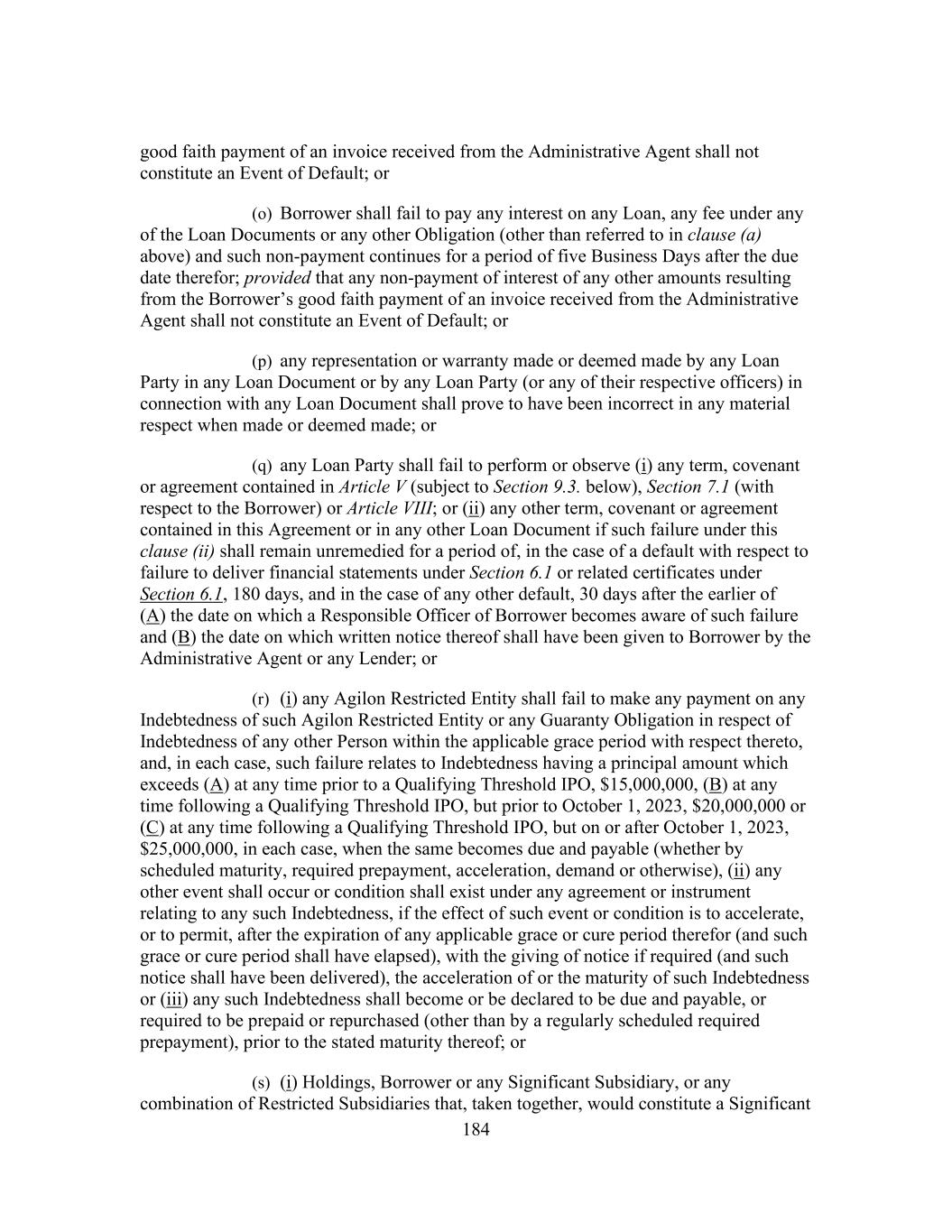 184 good faith payment of an invoice received from the Administrative Agent shall not constitute an Event of Default; or (o) Borrower shall fail to pay any interest on any Loan, any fee under any of the Loan Documents or any other Obligation (other than referred to in clause (a) above) and such non-payment continues for a period of five Business Days after the due date therefor; provided that any non-payment of interest of any other amounts resulting from the Borrower’s good faith payment of an invoice received from the Administrative Agent shall not constitute an Event of Default; or (p) any representation or warranty made or deemed made by any Loan Party in any Loan Document or by any Loan Party (or any of their respective officers) in connection with any Loan Document shall prove to have been incorrect in any material respect when made or deemed made; or (q) any Loan Party shall fail to perform or observe (i) any term, covenant or agreement contained in Article V (subject to Section 9.3. below), Section 7.1 (with respect to the Borrower) or Article VIII; or (ii) any other term, covenant or agreement contained in this Agreement or in any other Loan Document if such failure under this clause (ii) shall remain unremedied for a period of, in the case of a default with respect to failure to deliver financial statements under Section 6.1 or related certificates under Section 6.1, 180 days, and in the case of any other default, 30 days after the earlier of (A) the date on which a Responsible Officer of Borrower becomes aware of such failure and (B) the date on which written notice thereof shall have been given to Borrower by the Administrative Agent or any Lender; or (r) (i) any Agilon Restricted Entity shall fail to make any payment on any Indebtedness of such Agilon Restricted Entity or any Guaranty Obligation in respect of Indebtedness of any other Person within the applicable grace period with respect thereto, and, in each case, such failure relates to Indebtedness having a principal amount which exceeds (A) at any time prior to a Qualifying Threshold IPO, $15,000,000, (B) at any time following a Qualifying Threshold IPO, but prior to October 1, 2023, $20,000,000 or (C) at any time following a Qualifying Threshold IPO, but on or after October 1, 2023, $25,000,000, in each case, when the same becomes due and payable (whether by scheduled maturity, required prepayment, acceleration, demand or otherwise), (ii) any other event shall occur or condition shall exist under any agreement or instrument relating to any such Indebtedness, if the effect of such event or condition is to accelerate, or to permit, after the expiration of any applicable grace or cure period therefor (and such grace or cure period shall have elapsed), with the giving of notice if required (and such notice shall have been delivered), the acceleration of or the maturity of such Indebtedness or (iii) any such Indebtedness shall become or be declared to be due and payable, or required to be prepaid or repurchased (other than by a regularly scheduled required prepayment), prior to the stated maturity thereof; or (s) (i) Holdings, Borrower or any Significant Subsidiary, or any combination of Restricted Subsidiaries that, taken together, would constitute a Significant