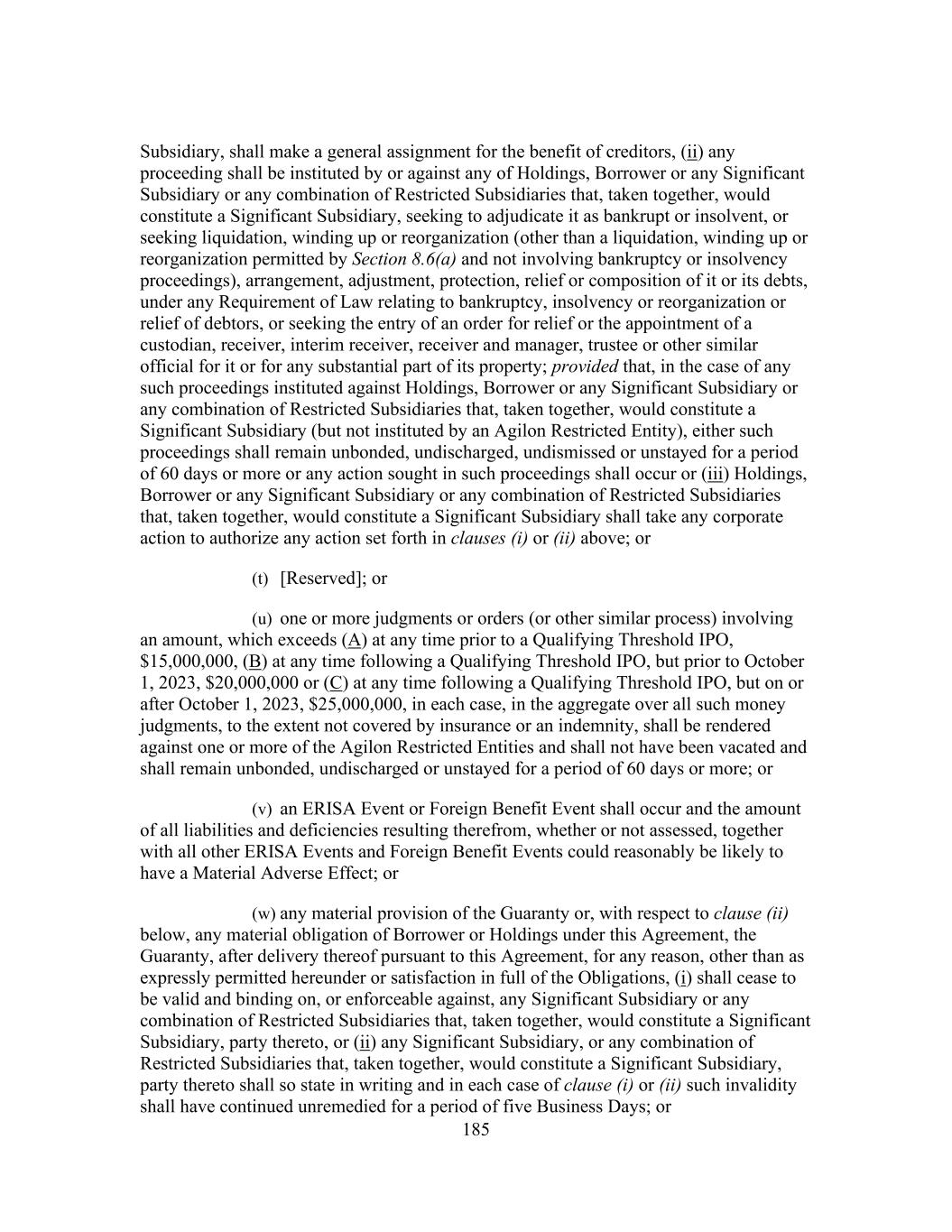 185 Subsidiary, shall make a general assignment for the benefit of creditors, (ii) any proceeding shall be instituted by or against any of Holdings, Borrower or any Significant Subsidiary or any combination of Restricted Subsidiaries that, taken together, would constitute a Significant Subsidiary, seeking to adjudicate it as bankrupt or insolvent, or seeking liquidation, winding up or reorganization (other than a liquidation, winding up or reorganization permitted by Section 8.6(a) and not involving bankruptcy or insolvency proceedings), arrangement, adjustment, protection, relief or composition of it or its debts, under any Requirement of Law relating to bankruptcy, insolvency or reorganization or relief of debtors, or seeking the entry of an order for relief or the appointment of a custodian, receiver, interim receiver, receiver and manager, trustee or other similar official for it or for any substantial part of its property; provided that, in the case of any such proceedings instituted against Holdings, Borrower or any Significant Subsidiary or any combination of Restricted Subsidiaries that, taken together, would constitute a Significant Subsidiary (but not instituted by an Agilon Restricted Entity), either such proceedings shall remain unbonded, undischarged, undismissed or unstayed for a period of 60 days or more or any action sought in such proceedings shall occur or (iii) Holdings, Borrower or any Significant Subsidiary or any combination of Restricted Subsidiaries that, taken together, would constitute a Significant Subsidiary shall take any corporate action to authorize any action set forth in clauses (i) or (ii) above; or (t) [Reserved]; or (u) one or more judgments or orders (or other similar process) involving an amount, which exceeds (A) at any time prior to a Qualifying Threshold IPO, $15,000,000, (B) at any time following a Qualifying Threshold IPO, but prior to October 1, 2023, $20,000,000 or (C) at any time following a Qualifying Threshold IPO, but on or after October 1, 2023, $25,000,000, in each case, in the aggregate over all such money judgments, to the extent not covered by insurance or an indemnity, shall be rendered against one or more of the Agilon Restricted Entities and shall not have been vacated and shall remain unbonded, undischarged or unstayed for a period of 60 days or more; or (v) an ERISA Event or Foreign Benefit Event shall occur and the amount of all liabilities and deficiencies resulting therefrom, whether or not assessed, together with all other ERISA Events and Foreign Benefit Events could reasonably be likely to have a Material Adverse Effect; or (w) any material provision of the Guaranty or, with respect to clause (ii) below, any material obligation of Borrower or Holdings under this Agreement, the Guaranty, after delivery thereof pursuant to this Agreement, for any reason, other than as expressly permitted hereunder or satisfaction in full of the Obligations, (i) shall cease to be valid and binding on, or enforceable against, any Significant Subsidiary or any combination of Restricted Subsidiaries that, taken together, would constitute a Significant Subsidiary, party thereto, or (ii) any Significant Subsidiary, or any combination of Restricted Subsidiaries that, taken together, would constitute a Significant Subsidiary, party thereto shall so state in writing and in each case of clause (i) or (ii) such invalidity shall have continued unremedied for a period of five Business Days; or