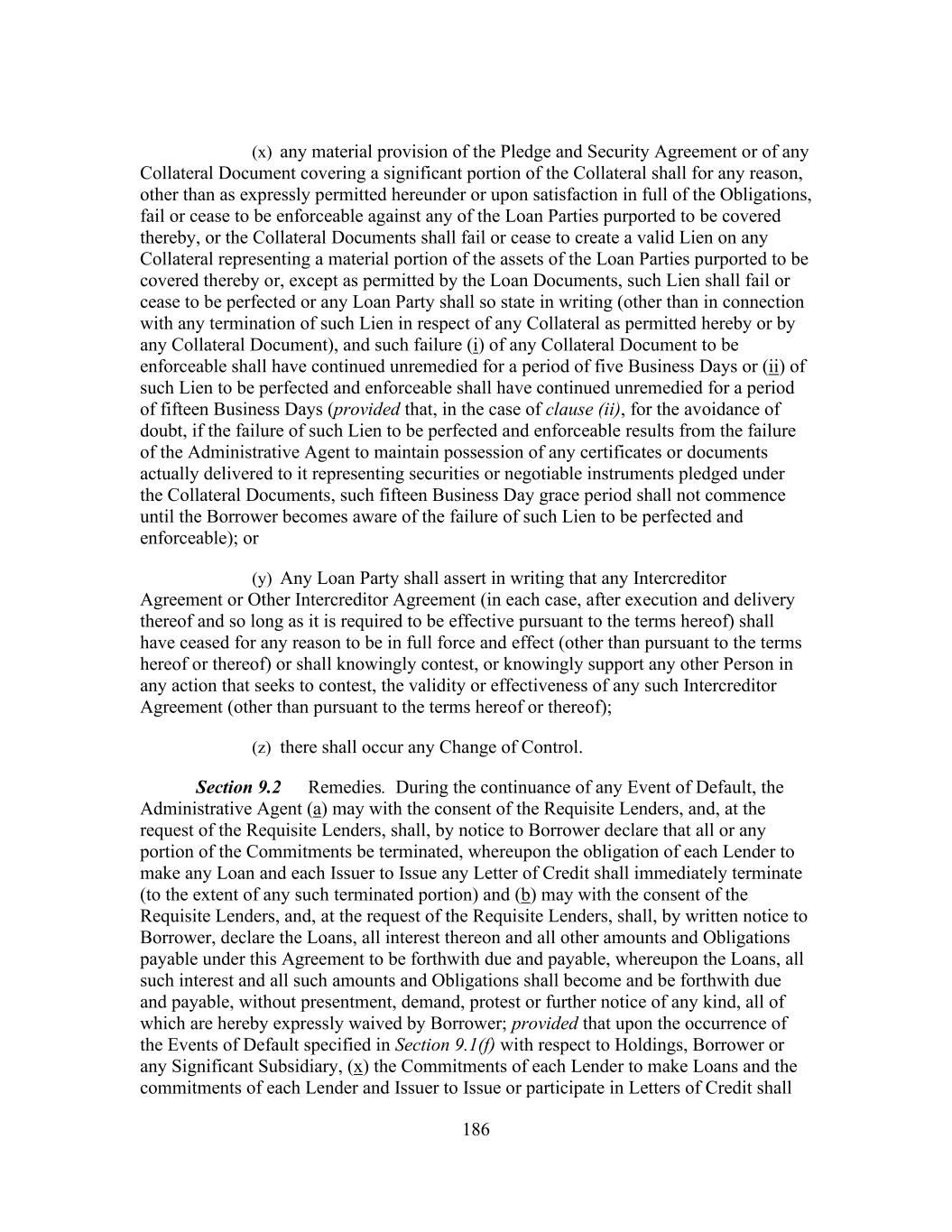 186 (x) any material provision of the Pledge and Security Agreement or of any Collateral Document covering a significant portion of the Collateral shall for any reason, other than as expressly permitted hereunder or upon satisfaction in full of the Obligations, fail or cease to be enforceable against any of the Loan Parties purported to be covered thereby, or the Collateral Documents shall fail or cease to create a valid Lien on any Collateral representing a material portion of the assets of the Loan Parties purported to be covered thereby or, except as permitted by the Loan Documents, such Lien shall fail or cease to be perfected or any Loan Party shall so state in writing (other than in connection with any termination of such Lien in respect of any Collateral as permitted hereby or by any Collateral Document), and such failure (i) of any Collateral Document to be enforceable shall have continued unremedied for a period of five Business Days or (ii) of such Lien to be perfected and enforceable shall have continued unremedied for a period of fifteen Business Days (provided that, in the case of clause (ii), for the avoidance of doubt, if the failure of such Lien to be perfected and enforceable results from the failure of the Administrative Agent to maintain possession of any certificates or documents actually delivered to it representing securities or negotiable instruments pledged under the Collateral Documents, such fifteen Business Day grace period shall not commence until the Borrower becomes aware of the failure of such Lien to be perfected and enforceable); or (y) Any Loan Party shall assert in writing that any Intercreditor Agreement or Other Intercreditor Agreement (in each case, after execution and delivery thereof and so long as it is required to be effective pursuant to the terms hereof) shall have ceased for any reason to be in full force and effect (other than pursuant to the terms hereof or thereof) or shall knowingly contest, or knowingly support any other Person in any action that seeks to contest, the validity or effectiveness of any such Intercreditor Agreement (other than pursuant to the terms hereof or thereof); (z) there shall occur any Change of Control. Section 9.2 Remedies. During the continuance of any Event of Default, the Administrative Agent (a) may with the consent of the Requisite Lenders, and, at the request of the Requisite Lenders, shall, by notice to Borrower declare that all or any portion of the Commitments be terminated, whereupon the obligation of each Lender to make any Loan and each Issuer to Issue any Letter of Credit shall immediately terminate (to the extent of any such terminated portion) and (b) may with the consent of the Requisite Lenders, and, at the request of the Requisite Lenders, shall, by written notice to Borrower, declare the Loans, all interest thereon and all other amounts and Obligations payable under this Agreement to be forthwith due and payable, whereupon the Loans, all such interest and all such amounts and Obligations shall become and be forthwith due and payable, without presentment, demand, protest or further notice of any kind, all of which are hereby expressly waived by Borrower; provided that upon the occurrence of the Events of Default specified in Section 9.1(f) with respect to Holdings, Borrower or any Significant Subsidiary, (x) the Commitments of each Lender to make Loans and the commitments of each Lender and Issuer to Issue or participate in Letters of Credit shall