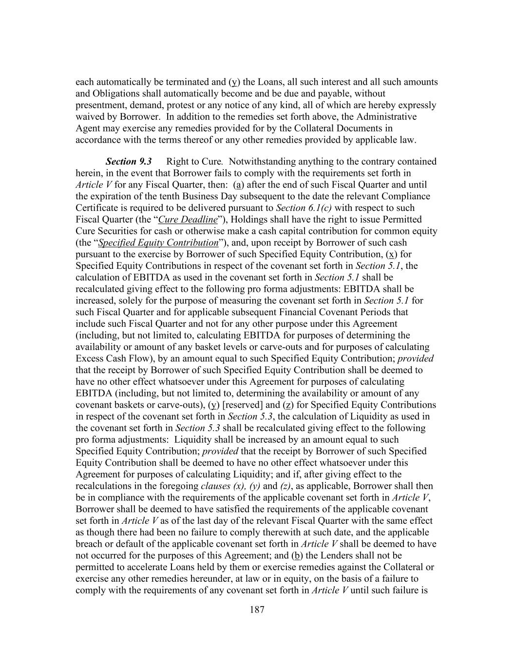 187 each automatically be terminated and (y) the Loans, all such interest and all such amounts and Obligations shall automatically become and be due and payable, without presentment, demand, protest or any notice of any kind, all of which are hereby expressly waived by Borrower. In addition to the remedies set forth above, the Administrative Agent may exercise any remedies provided for by the Collateral Documents in accordance with the terms thereof or any other remedies provided by applicable law. Section 9.3 Right to Cure. Notwithstanding anything to the contrary contained herein, in the event that Borrower fails to comply with the requirements set forth in Article V for any Fiscal Quarter, then: (a) after the end of such Fiscal Quarter and until the expiration of the tenth Business Day subsequent to the date the relevant Compliance Certificate is required to be delivered pursuant to Section 6.1(c) with respect to such Fiscal Quarter (the “Cure Deadline”), Holdings shall have the right to issue Permitted Cure Securities for cash or otherwise make a cash capital contribution for common equity (the “Specified Equity Contribution”), and, upon receipt by Borrower of such cash pursuant to the exercise by Borrower of such Specified Equity Contribution, (x) for Specified Equity Contributions in respect of the covenant set forth in Section 5.1, the calculation of EBITDA as used in the covenant set forth in Section 5.1 shall be recalculated giving effect to the following pro forma adjustments: EBITDA shall be increased, solely for the purpose of measuring the covenant set forth in Section 5.1 for such Fiscal Quarter and for applicable subsequent Financial Covenant Periods that include such Fiscal Quarter and not for any other purpose under this Agreement (including, but not limited to, calculating EBITDA for purposes of determining the availability or amount of any basket levels or carve-outs and for purposes of calculating Excess Cash Flow), by an amount equal to such Specified Equity Contribution; provided that the receipt by Borrower of such Specified Equity Contribution shall be deemed to have no other effect whatsoever under this Agreement for purposes of calculating EBITDA (including, but not limited to, determining the availability or amount of any covenant baskets or carve-outs), (y) [reserved] and (z) for Specified Equity Contributions in respect of the covenant set forth in Section 5.3, the calculation of Liquidity as used in the covenant set forth in Section 5.3 shall be recalculated giving effect to the following pro forma adjustments: Liquidity shall be increased by an amount equal to such Specified Equity Contribution; provided that the receipt by Borrower of such Specified Equity Contribution shall be deemed to have no other effect whatsoever under this Agreement for purposes of calculating Liquidity; and if, after giving effect to the recalculations in the foregoing clauses (x), (y) and (z), as applicable, Borrower shall then be in compliance with the requirements of the applicable covenant set forth in Article V, Borrower shall be deemed to have satisfied the requirements of the applicable covenant set forth in Article V as of the last day of the relevant Fiscal Quarter with the same effect as though there had been no failure to comply therewith at such date, and the applicable breach or default of the applicable covenant set forth in Article V shall be deemed to have not occurred for the purposes of this Agreement; and (b) the Lenders shall not be permitted to accelerate Loans held by them or exercise remedies against the Collateral or exercise any other remedies hereunder, at law or in equity, on the basis of a failure to comply with the requirements of any covenant set forth in Article V until such failure is