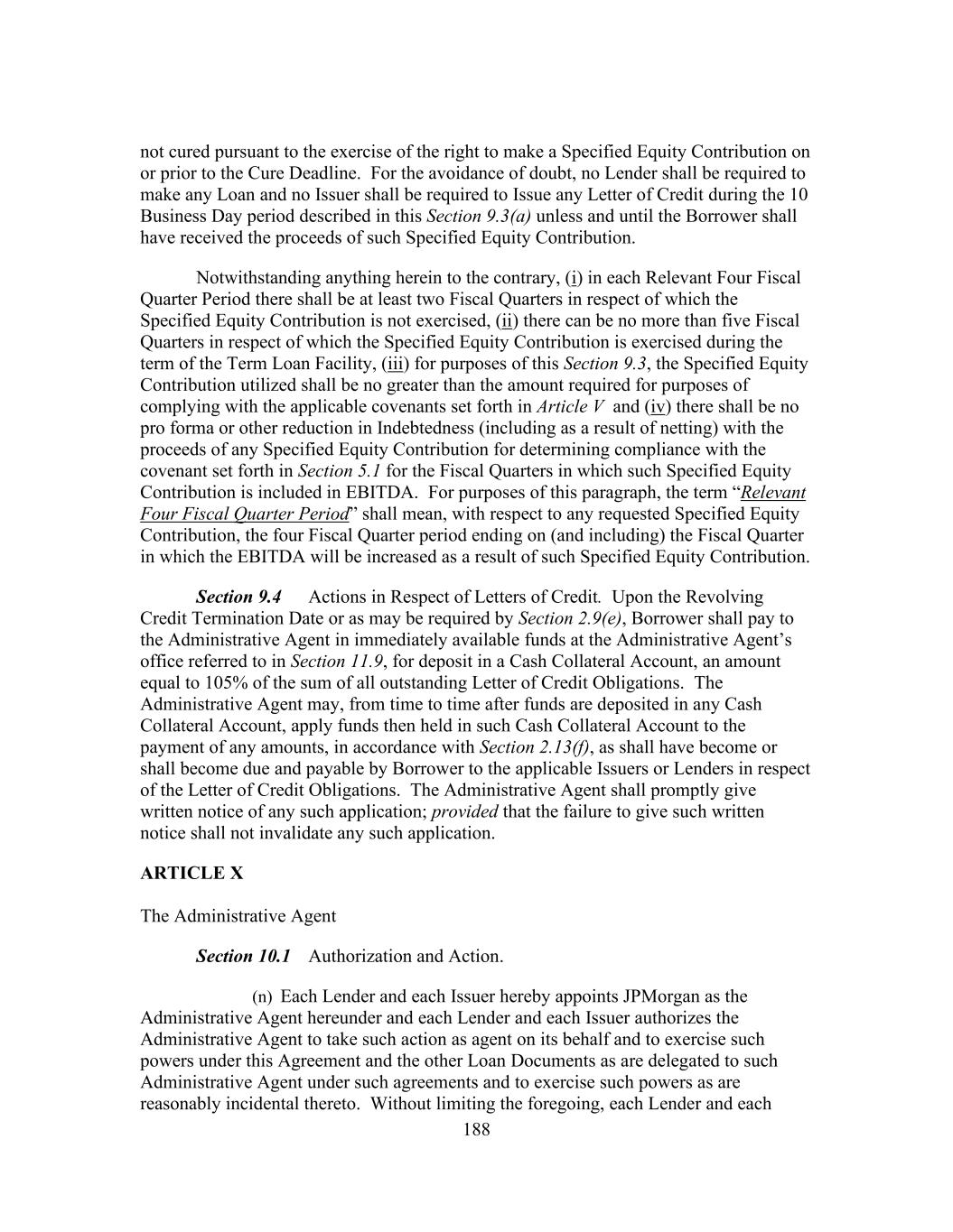 188 not cured pursuant to the exercise of the right to make a Specified Equity Contribution on or prior to the Cure Deadline. For the avoidance of doubt, no Lender shall be required to make any Loan and no Issuer shall be required to Issue any Letter of Credit during the 10 Business Day period described in this Section 9.3(a) unless and until the Borrower shall have received the proceeds of such Specified Equity Contribution. Notwithstanding anything herein to the contrary, (i) in each Relevant Four Fiscal Quarter Period there shall be at least two Fiscal Quarters in respect of which the Specified Equity Contribution is not exercised, (ii) there can be no more than five Fiscal Quarters in respect of which the Specified Equity Contribution is exercised during the term of the Term Loan Facility, (iii) for purposes of this Section 9.3, the Specified Equity Contribution utilized shall be no greater than the amount required for purposes of complying with the applicable covenants set forth in Article V and (iv) there shall be no pro forma or other reduction in Indebtedness (including as a result of netting) with the proceeds of any Specified Equity Contribution for determining compliance with the covenant set forth in Section 5.1 for the Fiscal Quarters in which such Specified Equity Contribution is included in EBITDA. For purposes of this paragraph, the term “Relevant Four Fiscal Quarter Period” shall mean, with respect to any requested Specified Equity Contribution, the four Fiscal Quarter period ending on (and including) the Fiscal Quarter in which the EBITDA will be increased as a result of such Specified Equity Contribution. Section 9.4 Actions in Respect of Letters of Credit. Upon the Revolving Credit Termination Date or as may be required by Section 2.9(e), Borrower shall pay to the Administrative Agent in immediately available funds at the Administrative Agent’s office referred to in Section 11.9, for deposit in a Cash Collateral Account, an amount equal to 105% of the sum of all outstanding Letter of Credit Obligations. The Administrative Agent may, from time to time after funds are deposited in any Cash Collateral Account, apply funds then held in such Cash Collateral Account to the payment of any amounts, in accordance with Section 2.13(f), as shall have become or shall become due and payable by Borrower to the applicable Issuers or Lenders in respect of the Letter of Credit Obligations. The Administrative Agent shall promptly give written notice of any such application; provided that the failure to give such written notice shall not invalidate any such application. ARTICLE X The Administrative Agent Section 10.1 Authorization and Action. (n) Each Lender and each Issuer hereby appoints JPMorgan as the Administrative Agent hereunder and each Lender and each Issuer authorizes the Administrative Agent to take such action as agent on its behalf and to exercise such powers under this Agreement and the other Loan Documents as are delegated to such Administrative Agent under such agreements and to exercise such powers as are reasonably incidental thereto. Without limiting the foregoing, each Lender and each