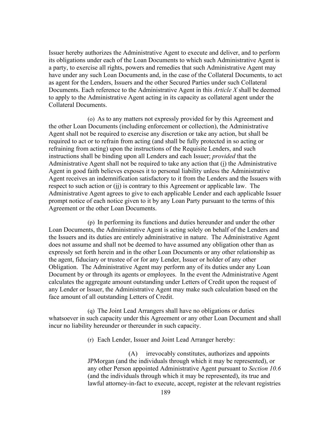 189 Issuer hereby authorizes the Administrative Agent to execute and deliver, and to perform its obligations under each of the Loan Documents to which such Administrative Agent is a party, to exercise all rights, powers and remedies that such Administrative Agent may have under any such Loan Documents and, in the case of the Collateral Documents, to act as agent for the Lenders, Issuers and the other Secured Parties under such Collateral Documents. Each reference to the Administrative Agent in this Article X shall be deemed to apply to the Administrative Agent acting in its capacity as collateral agent under the Collateral Documents. (o) As to any matters not expressly provided for by this Agreement and the other Loan Documents (including enforcement or collection), the Administrative Agent shall not be required to exercise any discretion or take any action, but shall be required to act or to refrain from acting (and shall be fully protected in so acting or refraining from acting) upon the instructions of the Requisite Lenders, and such instructions shall be binding upon all Lenders and each Issuer; provided that the Administrative Agent shall not be required to take any action that (i) the Administrative Agent in good faith believes exposes it to personal liability unless the Administrative Agent receives an indemnification satisfactory to it from the Lenders and the Issuers with respect to such action or (ii) is contrary to this Agreement or applicable law. The Administrative Agent agrees to give to each applicable Lender and each applicable Issuer prompt notice of each notice given to it by any Loan Party pursuant to the terms of this Agreement or the other Loan Documents. (p) In performing its functions and duties hereunder and under the other Loan Documents, the Administrative Agent is acting solely on behalf of the Lenders and the Issuers and its duties are entirely administrative in nature. The Administrative Agent does not assume and shall not be deemed to have assumed any obligation other than as expressly set forth herein and in the other Loan Documents or any other relationship as the agent, fiduciary or trustee of or for any Lender, Issuer or holder of any other Obligation. The Administrative Agent may perform any of its duties under any Loan Document by or through its agents or employees. In the event the Administrative Agent calculates the aggregate amount outstanding under Letters of Credit upon the request of any Lender or Issuer, the Administrative Agent may make such calculation based on the face amount of all outstanding Letters of Credit. (q) The Joint Lead Arrangers shall have no obligations or duties whatsoever in such capacity under this Agreement or any other Loan Document and shall incur no liability hereunder or thereunder in such capacity. (r) Each Lender, Issuer and Joint Lead Arranger hereby: (A) irrevocably constitutes, authorizes and appoints JPMorgan (and the individuals through which it may be represented), or any other Person appointed Administrative Agent pursuant to Section 10.6 (and the individuals through which it may be represented), its true and lawful attorney-in-fact to execute, accept, register at the relevant registries