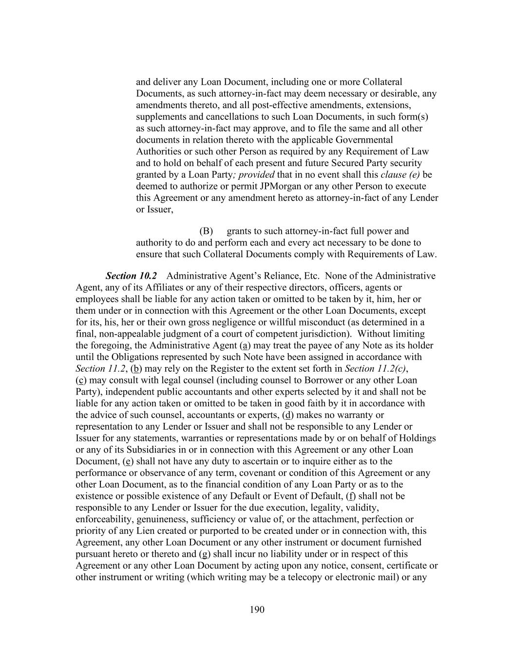 190 and deliver any Loan Document, including one or more Collateral Documents, as such attorney-in-fact may deem necessary or desirable, any amendments thereto, and all post-effective amendments, extensions, supplements and cancellations to such Loan Documents, in such form(s) as such attorney-in-fact may approve, and to file the same and all other documents in relation thereto with the applicable Governmental Authorities or such other Person as required by any Requirement of Law and to hold on behalf of each present and future Secured Party security granted by a Loan Party; provided that in no event shall this clause (e) be deemed to authorize or permit JPMorgan or any other Person to execute this Agreement or any amendment hereto as attorney-in-fact of any Lender or Issuer, (B) grants to such attorney-in-fact full power and authority to do and perform each and every act necessary to be done to ensure that such Collateral Documents comply with Requirements of Law. Section 10.2 Administrative Agent’s Reliance, Etc. None of the Administrative Agent, any of its Affiliates or any of their respective directors, officers, agents or employees shall be liable for any action taken or omitted to be taken by it, him, her or them under or in connection with this Agreement or the other Loan Documents, except for its, his, her or their own gross negligence or willful misconduct (as determined in a final, non-appealable judgment of a court of competent jurisdiction). Without limiting the foregoing, the Administrative Agent (a) may treat the payee of any Note as its holder until the Obligations represented by such Note have been assigned in accordance with Section 11.2, (b) may rely on the Register to the extent set forth in Section 11.2(c), (c) may consult with legal counsel (including counsel to Borrower or any other Loan Party), independent public accountants and other experts selected by it and shall not be liable for any action taken or omitted to be taken in good faith by it in accordance with the advice of such counsel, accountants or experts, (d) makes no warranty or representation to any Lender or Issuer and shall not be responsible to any Lender or Issuer for any statements, warranties or representations made by or on behalf of Holdings or any of its Subsidiaries in or in connection with this Agreement or any other Loan Document, (e) shall not have any duty to ascertain or to inquire either as to the performance or observance of any term, covenant or condition of this Agreement or any other Loan Document, as to the financial condition of any Loan Party or as to the existence or possible existence of any Default or Event of Default, (f) shall not be responsible to any Lender or Issuer for the due execution, legality, validity, enforceability, genuineness, sufficiency or value of, or the attachment, perfection or priority of any Lien created or purported to be created under or in connection with, this Agreement, any other Loan Document or any other instrument or document furnished pursuant hereto or thereto and (g) shall incur no liability under or in respect of this Agreement or any other Loan Document by acting upon any notice, consent, certificate or other instrument or writing (which writing may be a telecopy or electronic mail) or any