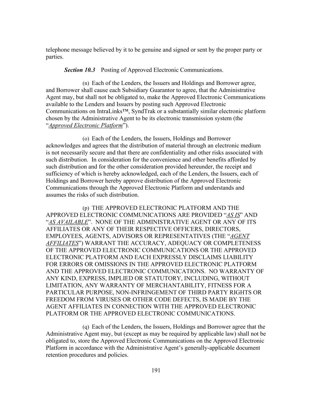 191 telephone message believed by it to be genuine and signed or sent by the proper party or parties. Section 10.3 Posting of Approved Electronic Communications. (n) Each of the Lenders, the Issuers and Holdings and Borrower agree, and Borrower shall cause each Subsidiary Guarantor to agree, that the Administrative Agent may, but shall not be obligated to, make the Approved Electronic Communications available to the Lenders and Issuers by posting such Approved Electronic Communications on IntraLinks™, SyndTrak or a substantially similar electronic platform chosen by the Administrative Agent to be its electronic transmission system (the “Approved Electronic Platform”). (o) Each of the Lenders, the Issuers, Holdings and Borrower acknowledges and agrees that the distribution of material through an electronic medium is not necessarily secure and that there are confidentiality and other risks associated with such distribution. In consideration for the convenience and other benefits afforded by such distribution and for the other consideration provided hereunder, the receipt and sufficiency of which is hereby acknowledged, each of the Lenders, the Issuers, each of Holdings and Borrower hereby approve distribution of the Approved Electronic Communications through the Approved Electronic Platform and understands and assumes the risks of such distribution. (p) THE APPROVED ELECTRONIC PLATFORM AND THE APPROVED ELECTRONIC COMMUNICATIONS ARE PROVIDED “AS IS” AND “AS AVAILABLE”. NONE OF THE ADMINISTRATIVE AGENT OR ANY OF ITS AFFILIATES OR ANY OF THEIR RESPECTIVE OFFICERS, DIRECTORS, EMPLOYEES, AGENTS, ADVISORS OR REPRESENTATIVES (THE “AGENT AFFILIATES”) WARRANT THE ACCURACY, ADEQUACY OR COMPLETENESS OF THE APPROVED ELECTRONIC COMMUNICATIONS OR THE APPROVED ELECTRONIC PLATFORM AND EACH EXPRESSLY DISCLAIMS LIABILITY FOR ERRORS OR OMISSIONS IN THE APPROVED ELECTRONIC PLATFORM AND THE APPROVED ELECTRONIC COMMUNICATIONS. NO WARRANTY OF ANY KIND, EXPRESS, IMPLIED OR STATUTORY, INCLUDING, WITHOUT LIMITATION, ANY WARRANTY OF MERCHANTABILITY, FITNESS FOR A PARTICULAR PURPOSE, NON-INFRINGEMENT OF THIRD PARTY RIGHTS OR FREEDOM FROM VIRUSES OR OTHER CODE DEFECTS, IS MADE BY THE AGENT AFFILIATES IN CONNECTION WITH THE APPROVED ELECTRONIC PLATFORM OR THE APPROVED ELECTRONIC COMMUNICATIONS. (q) Each of the Lenders, the Issuers, Holdings and Borrower agree that the Administrative Agent may, but (except as may be required by applicable law) shall not be obligated to, store the Approved Electronic Communications on the Approved Electronic Platform in accordance with the Administrative Agent’s generally-applicable document retention procedures and policies.
