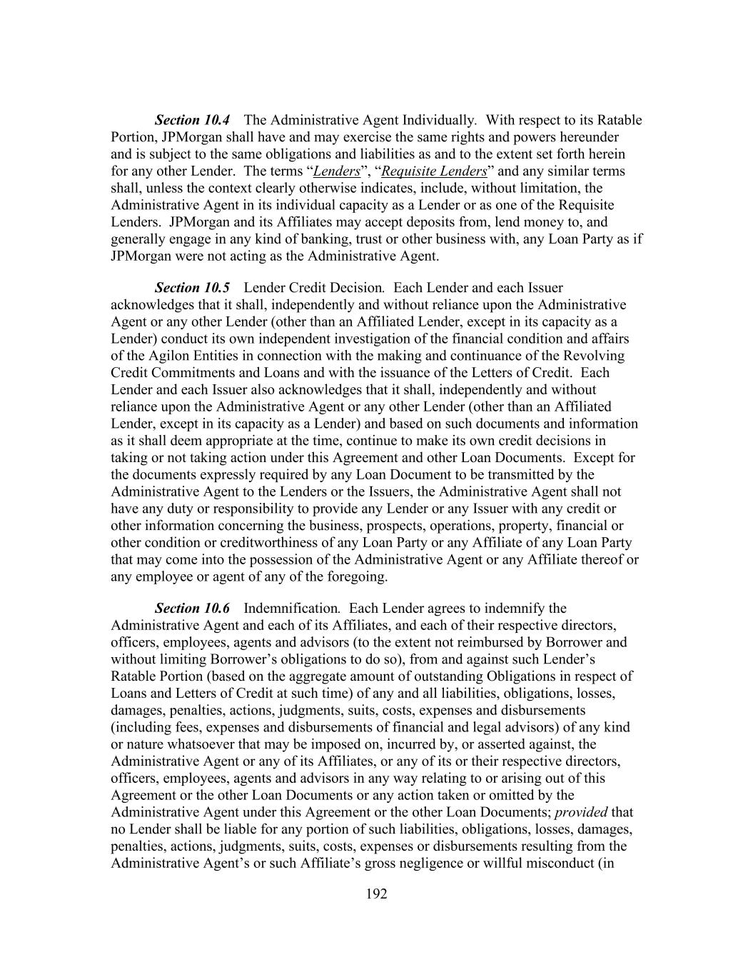 192 Section 10.4 The Administrative Agent Individually. With respect to its Ratable Portion, JPMorgan shall have and may exercise the same rights and powers hereunder and is subject to the same obligations and liabilities as and to the extent set forth herein for any other Lender. The terms “Lenders”, “Requisite Lenders” and any similar terms shall, unless the context clearly otherwise indicates, include, without limitation, the Administrative Agent in its individual capacity as a Lender or as one of the Requisite Lenders. JPMorgan and its Affiliates may accept deposits from, lend money to, and generally engage in any kind of banking, trust or other business with, any Loan Party as if JPMorgan were not acting as the Administrative Agent. Section 10.5 Lender Credit Decision. Each Lender and each Issuer acknowledges that it shall, independently and without reliance upon the Administrative Agent or any other Lender (other than an Affiliated Lender, except in its capacity as a Lender) conduct its own independent investigation of the financial condition and affairs of the Agilon Entities in connection with the making and continuance of the Revolving Credit Commitments and Loans and with the issuance of the Letters of Credit. Each Lender and each Issuer also acknowledges that it shall, independently and without reliance upon the Administrative Agent or any other Lender (other than an Affiliated Lender, except in its capacity as a Lender) and based on such documents and information as it shall deem appropriate at the time, continue to make its own credit decisions in taking or not taking action under this Agreement and other Loan Documents. Except for the documents expressly required by any Loan Document to be transmitted by the Administrative Agent to the Lenders or the Issuers, the Administrative Agent shall not have any duty or responsibility to provide any Lender or any Issuer with any credit or other information concerning the business, prospects, operations, property, financial or other condition or creditworthiness of any Loan Party or any Affiliate of any Loan Party that may come into the possession of the Administrative Agent or any Affiliate thereof or any employee or agent of any of the foregoing. Section 10.6 Indemnification. Each Lender agrees to indemnify the Administrative Agent and each of its Affiliates, and each of their respective directors, officers, employees, agents and advisors (to the extent not reimbursed by Borrower and without limiting Borrower’s obligations to do so), from and against such Lender’s Ratable Portion (based on the aggregate amount of outstanding Obligations in respect of Loans and Letters of Credit at such time) of any and all liabilities, obligations, losses, damages, penalties, actions, judgments, suits, costs, expenses and disbursements (including fees, expenses and disbursements of financial and legal advisors) of any kind or nature whatsoever that may be imposed on, incurred by, or asserted against, the Administrative Agent or any of its Affiliates, or any of its or their respective directors, officers, employees, agents and advisors in any way relating to or arising out of this Agreement or the other Loan Documents or any action taken or omitted by the Administrative Agent under this Agreement or the other Loan Documents; provided that no Lender shall be liable for any portion of such liabilities, obligations, losses, damages, penalties, actions, judgments, suits, costs, expenses or disbursements resulting from the Administrative Agent’s or such Affiliate’s gross negligence or willful misconduct (in