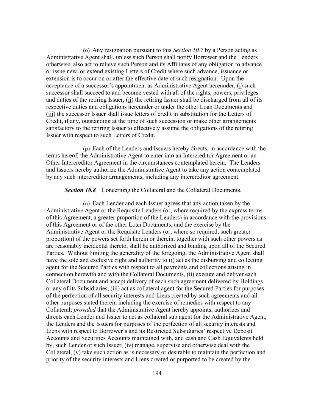 194 (o) Any resignation pursuant to this Section 10.7 by a Person acting as Administrative Agent shall, unless such Person shall notify Borrower and the Lenders otherwise, also act to relieve such Person and its Affiliates of any obligation to advance or issue new, or extend existing Letters of Credit where such advance, issuance or extension is to occur on or after the effective date of such resignation. Upon the acceptance of a successor’s appointment as Administrative Agent hereunder, (i) such successor shall succeed to and become vested with all of the rights, powers, privileges and duties of the retiring Issuer, (ii) the retiring Issuer shall be discharged from all of its respective duties and obligations hereunder or under the other Loan Documents and (iii) the successor Issuer shall issue letters of credit in substitution for the Letters of Credit, if any, outstanding at the time of such succession or make other arrangements satisfactory to the retiring Issuer to effectively assume the obligations of the retiring Issuer with respect to such Letters of Credit. (p) Each of the Lenders and Issuers hereby directs, in accordance with the terms hereof, the Administrative Agent to enter into an Intercreditor Agreement or an Other Intercreditor Agreement in the circumstances contemplated herein. The Lenders and Issuers hereby authorize the Administrative Agent to take any action contemplated by any such intercreditor arrangements, including any intercreditor agreement. Section 10.8 Concerning the Collateral and the Collateral Documents. (n) Each Lender and each Issuer agrees that any action taken by the Administrative Agent or the Requisite Lenders (or, where required by the express terms of this Agreement, a greater proportion of the Lenders) in accordance with the provisions of this Agreement or of the other Loan Documents, and the exercise by the Administrative Agent or the Requisite Lenders (or, where so required, such greater proportion) of the powers set forth herein or therein, together with such other powers as are reasonably incidental thereto, shall be authorized and binding upon all of the Secured Parties. Without limiting the generality of the foregoing, the Administrative Agent shall have the sole and exclusive right and authority to (i) act as the disbursing and collecting agent for the Secured Parties with respect to all payments and collections arising in connection herewith and with the Collateral Documents, (ii) execute and deliver each Collateral Document and accept delivery of each such agreement delivered by Holdings or any of its Subsidiaries, (iii) act as collateral agent for the Secured Parties for purposes of the perfection of all security interests and Liens created by such agreements and all other purposes stated therein including the exercise of remedies with respect to any Collateral; provided that the Administrative Agent hereby appoints, authorizes and directs each Lender and Issuer to act as collateral sub agent for the Administrative Agent, the Lenders and the Issuers for purposes of the perfection of all security interests and Liens with respect to Borrower’s and its Restricted Subsidiaries’ respective Deposit Accounts and Securities Accounts maintained with, and cash and Cash Equivalents held by, such Lender or such Issuer, (iv) manage, supervise and otherwise deal with the Collateral, (v) take such action as is necessary or desirable to maintain the perfection and priority of the security interests and Liens created or purported to be created by the