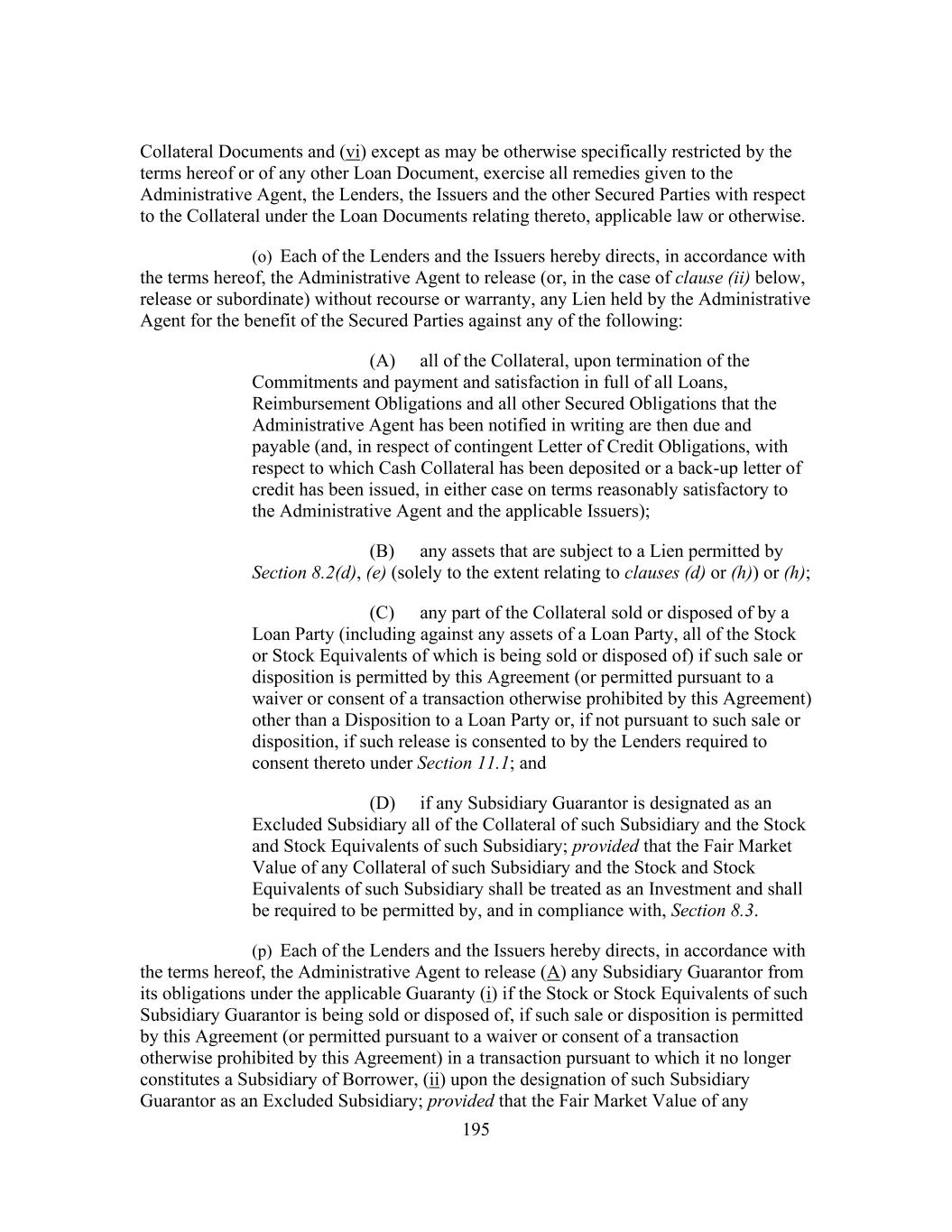 195 Collateral Documents and (vi) except as may be otherwise specifically restricted by the terms hereof or of any other Loan Document, exercise all remedies given to the Administrative Agent, the Lenders, the Issuers and the other Secured Parties with respect to the Collateral under the Loan Documents relating thereto, applicable law or otherwise. (o) Each of the Lenders and the Issuers hereby directs, in accordance with the terms hereof, the Administrative Agent to release (or, in the case of clause (ii) below, release or subordinate) without recourse or warranty, any Lien held by the Administrative Agent for the benefit of the Secured Parties against any of the following: (A) all of the Collateral, upon termination of the Commitments and payment and satisfaction in full of all Loans, Reimbursement Obligations and all other Secured Obligations that the Administrative Agent has been notified in writing are then due and payable (and, in respect of contingent Letter of Credit Obligations, with respect to which Cash Collateral has been deposited or a back-up letter of credit has been issued, in either case on terms reasonably satisfactory to the Administrative Agent and the applicable Issuers); (B) any assets that are subject to a Lien permitted by Section 8.2(d), (e) (solely to the extent relating to clauses (d) or (h)) or (h); (C) any part of the Collateral sold or disposed of by a Loan Party (including against any assets of a Loan Party, all of the Stock or Stock Equivalents of which is being sold or disposed of) if such sale or disposition is permitted by this Agreement (or permitted pursuant to a waiver or consent of a transaction otherwise prohibited by this Agreement) other than a Disposition to a Loan Party or, if not pursuant to such sale or disposition, if such release is consented to by the Lenders required to consent thereto under Section 11.1; and (D) if any Subsidiary Guarantor is designated as an Excluded Subsidiary all of the Collateral of such Subsidiary and the Stock and Stock Equivalents of such Subsidiary; provided that the Fair Market Value of any Collateral of such Subsidiary and the Stock and Stock Equivalents of such Subsidiary shall be treated as an Investment and shall be required to be permitted by, and in compliance with, Section 8.3. (p) Each of the Lenders and the Issuers hereby directs, in accordance with the terms hereof, the Administrative Agent to release (A) any Subsidiary Guarantor from its obligations under the applicable Guaranty (i) if the Stock or Stock Equivalents of such Subsidiary Guarantor is being sold or disposed of, if such sale or disposition is permitted by this Agreement (or permitted pursuant to a waiver or consent of a transaction otherwise prohibited by this Agreement) in a transaction pursuant to which it no longer constitutes a Subsidiary of Borrower, (ii) upon the designation of such Subsidiary Guarantor as an Excluded Subsidiary; provided that the Fair Market Value of any