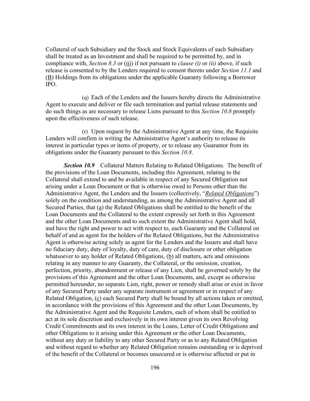 196 Collateral of such Subsidiary and the Stock and Stock Equivalents of such Subsidiary shall be treated as an Investment and shall be required to be permitted by, and in compliance with, Section 8.3 or (iii) if not pursuant to clause (i) or (ii) above, if such release is consented to by the Lenders required to consent thereto under Section 11.1 and (B) Holdings from its obligations under the applicable Guaranty following a Borrower IPO. (q) Each of the Lenders and the Issuers hereby directs the Administrative Agent to execute and deliver or file such termination and partial release statements and do such things as are necessary to release Liens pursuant to this Section 10.8 promptly upon the effectiveness of such release. (r) Upon request by the Administrative Agent at any time, the Requisite Lenders will confirm in writing the Administrative Agent’s authority to release its interest in particular types or items of property, or to release any Guarantor from its obligations under the Guaranty pursuant to this Section 10.8. Section 10.9 Collateral Matters Relating to Related Obligations. The benefit of the provisions of the Loan Documents, including this Agreement, relating to the Collateral shall extend to and be available in respect of any Secured Obligation not arising under a Loan Document or that is otherwise owed to Persons other than the Administrative Agent, the Lenders and the Issuers (collectively, “Related Obligations”) solely on the condition and understanding, as among the Administrative Agent and all Secured Parties, that (a) the Related Obligations shall be entitled to the benefit of the Loan Documents and the Collateral to the extent expressly set forth in this Agreement and the other Loan Documents and to such extent the Administrative Agent shall hold, and have the right and power to act with respect to, each Guaranty and the Collateral on behalf of and as agent for the holders of the Related Obligations, but the Administrative Agent is otherwise acting solely as agent for the Lenders and the Issuers and shall have no fiduciary duty, duty of loyalty, duty of care, duty of disclosure or other obligation whatsoever to any holder of Related Obligations, (b) all matters, acts and omissions relating in any manner to any Guaranty, the Collateral, or the omission, creation, perfection, priority, abandonment or release of any Lien, shall be governed solely by the provisions of this Agreement and the other Loan Documents, and, except as otherwise permitted hereunder, no separate Lien, right, power or remedy shall arise or exist in favor of any Secured Party under any separate instrument or agreement or in respect of any Related Obligation, (c) each Secured Party shall be bound by all actions taken or omitted, in accordance with the provisions of this Agreement and the other Loan Documents, by the Administrative Agent and the Requisite Lenders, each of whom shall be entitled to act at its sole discretion and exclusively in its own interest given its own Revolving Credit Commitments and its own interest in the Loans, Letter of Credit Obligations and other Obligations to it arising under this Agreement or the other Loan Documents, without any duty or liability to any other Secured Party or as to any Related Obligation and without regard to whether any Related Obligation remains outstanding or is deprived of the benefit of the Collateral or becomes unsecured or is otherwise affected or put in
