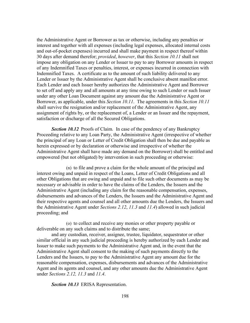 198 the Administrative Agent or Borrower as tax or otherwise, including any penalties or interest and together with all expenses (including legal expenses, allocated internal costs and out-of-pocket expenses) incurred and shall make payment in respect thereof within 30 days after demand therefor; provided, however, that this Section 10.11 shall not impose any obligation on any Lender or Issuer to pay to any Borrower amounts in respect of any Indemnified Taxes or penalties, interest, or expenses incurred in connection with Indemnified Taxes. A certificate as to the amount of such liability delivered to any Lender or Issuer by the Administrative Agent shall be conclusive absent manifest error. Each Lender and each Issuer hereby authorizes the Administrative Agent and Borrower to set off and apply any and all amounts at any time owing to such Lender or such Issuer under any other Loan Document against any amount due the Administrative Agent or Borrower, as applicable, under this Section 10.11. The agreements in this Section 10.11 shall survive the resignation and/or replacement of the Administrative Agent, any assignment of rights by, or the replacement of, a Lender or an Issuer and the repayment, satisfaction or discharge of all the Secured Obligations. Section 10.12 Proofs of Claim. In case of the pendency of any Bankruptcy Proceeding relative to any Loan Party, the Administrative Agent (irrespective of whether the principal of any Loan or Letter of Credit Obligation shall then be due and payable as herein expressed or by declaration or otherwise and irrespective of whether the Administrative Agent shall have made any demand on the Borrower) shall be entitled and empowered (but not obligated) by intervention in such proceeding or otherwise: (n) to file and prove a claim for the whole amount of the principal and interest owing and unpaid in respect of the Loans, Letter of Credit Obligations and all other Obligations that are owing and unpaid and to file such other documents as may be necessary or advisable in order to have the claims of the Lenders, the Issuers and the Administrative Agent (including any claim for the reasonable compensation, expenses, disbursements and advances of the Lenders, the Issuers and the Administrative Agent and their respective agents and counsel and all other amounts due the Lenders, the Issuers and the Administrative Agent under Sections 2.12, 11.3 and 11.4) allowed in such judicial proceeding; and (o) to collect and receive any monies or other property payable or deliverable on any such claims and to distribute the same; and any custodian, receiver, assignee, trustee, liquidator, sequestrator or other similar official in any such judicial proceeding is hereby authorized by each Lender and Issuer to make such payments to the Administrative Agent and, in the event that the Administrative Agent shall consent to the making of such payments directly to the Lenders and the Issuers, to pay to the Administrative Agent any amount due for the reasonable compensation, expenses, disbursements and advances of the Administrative Agent and its agents and counsel, and any other amounts due the Administrative Agent under Sections 2.12, 11.3 and 11.4. Section 10.13 ERISA Representation.
