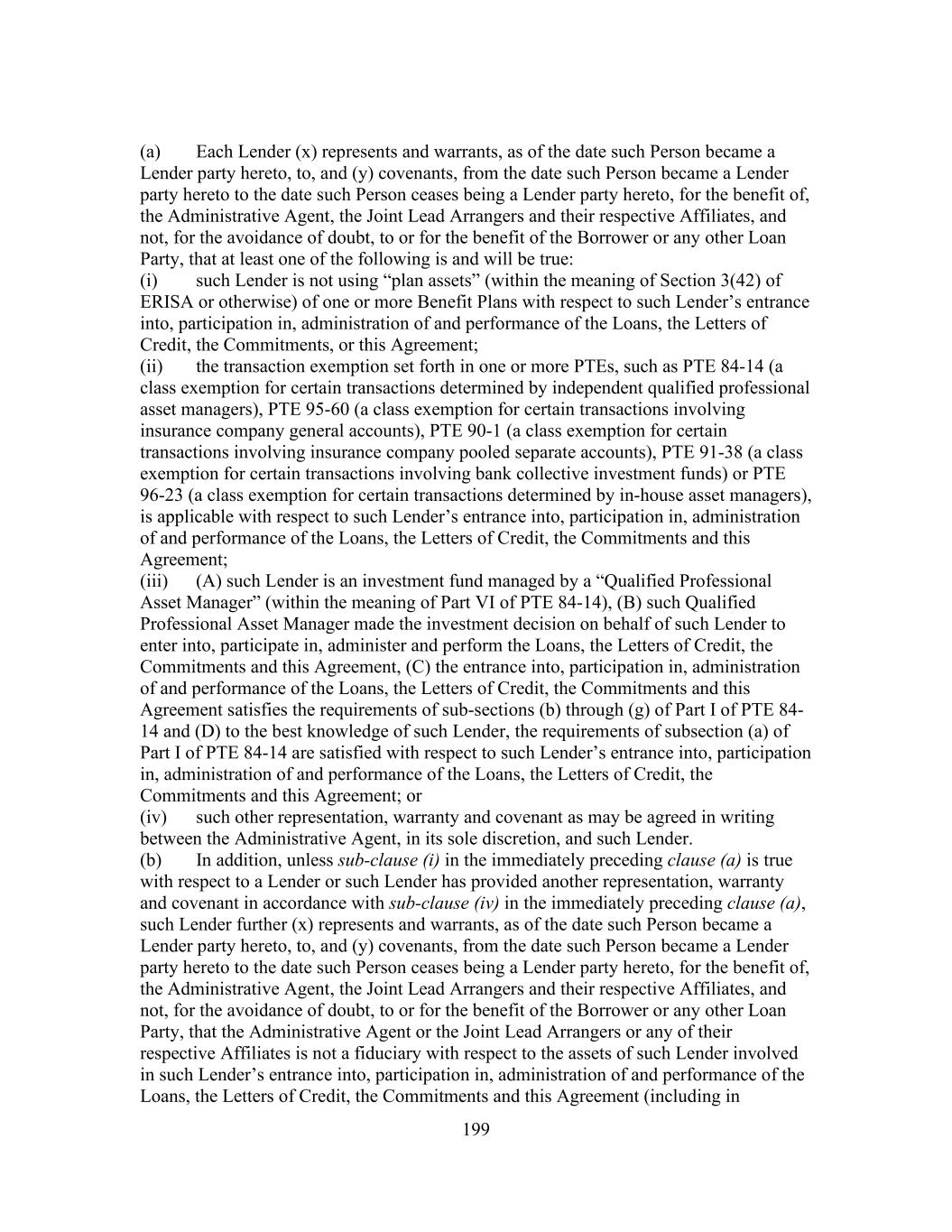 199 (a) Each Lender (x) represents and warrants, as of the date such Person became a Lender party hereto, to, and (y) covenants, from the date such Person became a Lender party hereto to the date such Person ceases being a Lender party hereto, for the benefit of, the Administrative Agent, the Joint Lead Arrangers and their respective Affiliates, and not, for the avoidance of doubt, to or for the benefit of the Borrower or any other Loan Party, that at least one of the following is and will be true: (i) such Lender is not using “plan assets” (within the meaning of Section 3(42) of ERISA or otherwise) of one or more Benefit Plans with respect to such Lender’s entrance into, participation in, administration of and performance of the Loans, the Letters of Credit, the Commitments, or this Agreement; (ii) the transaction exemption set forth in one or more PTEs, such as PTE 84-14 (a class exemption for certain transactions determined by independent qualified professional asset managers), PTE 95-60 (a class exemption for certain transactions involving insurance company general accounts), PTE 90-1 (a class exemption for certain transactions involving insurance company pooled separate accounts), PTE 91-38 (a class exemption for certain transactions involving bank collective investment funds) or PTE 96-23 (a class exemption for certain transactions determined by in-house asset managers), is applicable with respect to such Lender’s entrance into, participation in, administration of and performance of the Loans, the Letters of Credit, the Commitments and this Agreement; (iii) (A) such Lender is an investment fund managed by a “Qualified Professional Asset Manager” (within the meaning of Part VI of PTE 84-14), (B) such Qualified Professional Asset Manager made the investment decision on behalf of such Lender to enter into, participate in, administer and perform the Loans, the Letters of Credit, the Commitments and this Agreement, (C) the entrance into, participation in, administration of and performance of the Loans, the Letters of Credit, the Commitments and this Agreement satisfies the requirements of sub-sections (b) through (g) of Part I of PTE 84- 14 and (D) to the best knowledge of such Lender, the requirements of subsection (a) of Part I of PTE 84-14 are satisfied with respect to such Lender’s entrance into, participation in, administration of and performance of the Loans, the Letters of Credit, the Commitments and this Agreement; or (iv) such other representation, warranty and covenant as may be agreed in writing between the Administrative Agent, in its sole discretion, and such Lender. (b) In addition, unless sub-clause (i) in the immediately preceding clause (a) is true with respect to a Lender or such Lender has provided another representation, warranty and covenant in accordance with sub-clause (iv) in the immediately preceding clause (a), such Lender further (x) represents and warrants, as of the date such Person became a Lender party hereto, to, and (y) covenants, from the date such Person became a Lender party hereto to the date such Person ceases being a Lender party hereto, for the benefit of, the Administrative Agent, the Joint Lead Arrangers and their respective Affiliates, and not, for the avoidance of doubt, to or for the benefit of the Borrower or any other Loan Party, that the Administrative Agent or the Joint Lead Arrangers or any of their respective Affiliates is not a fiduciary with respect to the assets of such Lender involved in such Lender’s entrance into, participation in, administration of and performance of the Loans, the Letters of Credit, the Commitments and this Agreement (including in