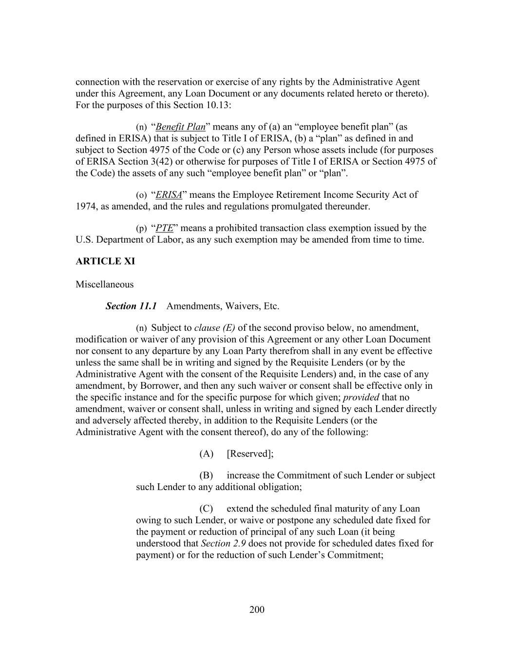 200 connection with the reservation or exercise of any rights by the Administrative Agent under this Agreement, any Loan Document or any documents related hereto or thereto). For the purposes of this Section 10.13: (n) “Benefit Plan” means any of (a) an “employee benefit plan” (as defined in ERISA) that is subject to Title I of ERISA, (b) a “plan” as defined in and subject to Section 4975 of the Code or (c) any Person whose assets include (for purposes of ERISA Section 3(42) or otherwise for purposes of Title I of ERISA or Section 4975 of the Code) the assets of any such “employee benefit plan” or “plan”. (o) “ERISA” means the Employee Retirement Income Security Act of 1974, as amended, and the rules and regulations promulgated thereunder. (p) “PTE” means a prohibited transaction class exemption issued by the U.S. Department of Labor, as any such exemption may be amended from time to time. ARTICLE XI Miscellaneous Section 11.1 Amendments, Waivers, Etc. (n) Subject to clause (E) of the second proviso below, no amendment, modification or waiver of any provision of this Agreement or any other Loan Document nor consent to any departure by any Loan Party therefrom shall in any event be effective unless the same shall be in writing and signed by the Requisite Lenders (or by the Administrative Agent with the consent of the Requisite Lenders) and, in the case of any amendment, by Borrower, and then any such waiver or consent shall be effective only in the specific instance and for the specific purpose for which given; provided that no amendment, waiver or consent shall, unless in writing and signed by each Lender directly and adversely affected thereby, in addition to the Requisite Lenders (or the Administrative Agent with the consent thereof), do any of the following: (A) [Reserved]; (B) increase the Commitment of such Lender or subject such Lender to any additional obligation; (C) extend the scheduled final maturity of any Loan owing to such Lender, or waive or postpone any scheduled date fixed for the payment or reduction of principal of any such Loan (it being understood that Section 2.9 does not provide for scheduled dates fixed for payment) or for the reduction of such Lender’s Commitment;