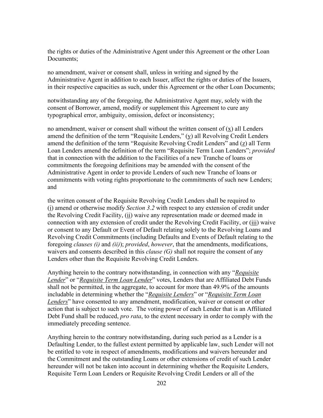 202 the rights or duties of the Administrative Agent under this Agreement or the other Loan Documents; no amendment, waiver or consent shall, unless in writing and signed by the Administrative Agent in addition to each Issuer, affect the rights or duties of the Issuers, in their respective capacities as such, under this Agreement or the other Loan Documents; notwithstanding any of the foregoing, the Administrative Agent may, solely with the consent of Borrower, amend, modify or supplement this Agreement to cure any typographical error, ambiguity, omission, defect or inconsistency; no amendment, waiver or consent shall without the written consent of (x) all Lenders amend the definition of the term “Requisite Lenders,” (y) all Revolving Credit Lenders amend the definition of the term “Requisite Revolving Credit Lenders” and (z) all Term Loan Lenders amend the definition of the term “Requisite Term Loan Lenders”; provided that in connection with the addition to the Facilities of a new Tranche of loans or commitments the foregoing definitions may be amended with the consent of the Administrative Agent in order to provide Lenders of such new Tranche of loans or commitments with voting rights proportionate to the commitments of such new Lenders; and the written consent of the Requisite Revolving Credit Lenders shall be required to (i) amend or otherwise modify Section 3.2 with respect to any extension of credit under the Revolving Credit Facility, (ii) waive any representation made or deemed made in connection with any extension of credit under the Revolving Credit Facility, or (iii) waive or consent to any Default or Event of Default relating solely to the Revolving Loans and Revolving Credit Commitments (including Defaults and Events of Default relating to the foregoing clauses (i) and (ii)); provided, however, that the amendments, modifications, waivers and consents described in this clause (G) shall not require the consent of any Lenders other than the Requisite Revolving Credit Lenders. Anything herein to the contrary notwithstanding, in connection with any “Requisite Lender” or “Requisite Term Loan Lender” votes, Lenders that are Affiliated Debt Funds shall not be permitted, in the aggregate, to account for more than 49.9% of the amounts includable in determining whether the “Requisite Lenders” or “Requisite Term Loan Lenders” have consented to any amendment, modification, waiver or consent or other action that is subject to such vote. The voting power of each Lender that is an Affiliated Debt Fund shall be reduced, pro rata, to the extent necessary in order to comply with the immediately preceding sentence. Anything herein to the contrary notwithstanding, during such period as a Lender is a Defaulting Lender, to the fullest extent permitted by applicable law, such Lender will not be entitled to vote in respect of amendments, modifications and waivers hereunder and the Commitment and the outstanding Loans or other extensions of credit of such Lender hereunder will not be taken into account in determining whether the Requisite Lenders, Requisite Term Loan Lenders or Requisite Revolving Credit Lenders or all of the