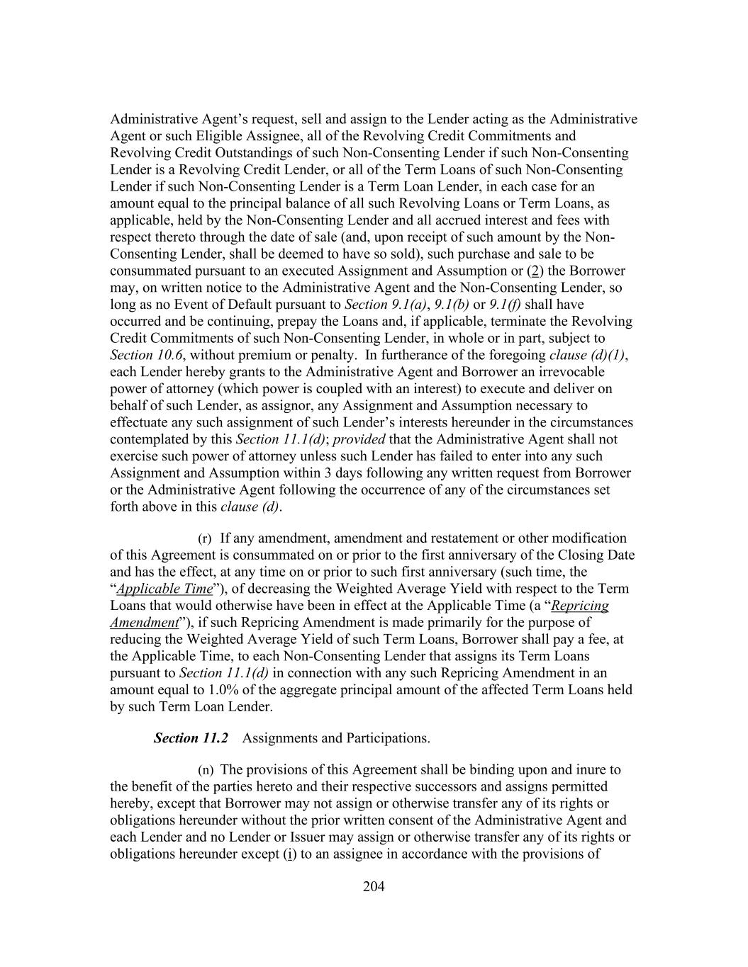 204 Administrative Agent’s request, sell and assign to the Lender acting as the Administrative Agent or such Eligible Assignee, all of the Revolving Credit Commitments and Revolving Credit Outstandings of such Non-Consenting Lender if such Non-Consenting Lender is a Revolving Credit Lender, or all of the Term Loans of such Non-Consenting Lender if such Non-Consenting Lender is a Term Loan Lender, in each case for an amount equal to the principal balance of all such Revolving Loans or Term Loans, as applicable, held by the Non-Consenting Lender and all accrued interest and fees with respect thereto through the date of sale (and, upon receipt of such amount by the Non- Consenting Lender, shall be deemed to have so sold), such purchase and sale to be consummated pursuant to an executed Assignment and Assumption or (2) the Borrower may, on written notice to the Administrative Agent and the Non-Consenting Lender, so long as no Event of Default pursuant to Section 9.1(a), 9.1(b) or 9.1(f) shall have occurred and be continuing, prepay the Loans and, if applicable, terminate the Revolving Credit Commitments of such Non-Consenting Lender, in whole or in part, subject to Section 10.6, without premium or penalty. In furtherance of the foregoing clause (d)(1), each Lender hereby grants to the Administrative Agent and Borrower an irrevocable power of attorney (which power is coupled with an interest) to execute and deliver on behalf of such Lender, as assignor, any Assignment and Assumption necessary to effectuate any such assignment of such Lender’s interests hereunder in the circumstances contemplated by this Section 11.1(d); provided that the Administrative Agent shall not exercise such power of attorney unless such Lender has failed to enter into any such Assignment and Assumption within 3 days following any written request from Borrower or the Administrative Agent following the occurrence of any of the circumstances set forth above in this clause (d). (r) If any amendment, amendment and restatement or other modification of this Agreement is consummated on or prior to the first anniversary of the Closing Date and has the effect, at any time on or prior to such first anniversary (such time, the “Applicable Time”), of decreasing the Weighted Average Yield with respect to the Term Loans that would otherwise have been in effect at the Applicable Time (a “Repricing Amendment”), if such Repricing Amendment is made primarily for the purpose of reducing the Weighted Average Yield of such Term Loans, Borrower shall pay a fee, at the Applicable Time, to each Non-Consenting Lender that assigns its Term Loans pursuant to Section 11.1(d) in connection with any such Repricing Amendment in an amount equal to 1.0% of the aggregate principal amount of the affected Term Loans held by such Term Loan Lender. Section 11.2 Assignments and Participations. (n) The provisions of this Agreement shall be binding upon and inure to the benefit of the parties hereto and their respective successors and assigns permitted hereby, except that Borrower may not assign or otherwise transfer any of its rights or obligations hereunder without the prior written consent of the Administrative Agent and each Lender and no Lender or Issuer may assign or otherwise transfer any of its rights or obligations hereunder except (i) to an assignee in accordance with the provisions of
